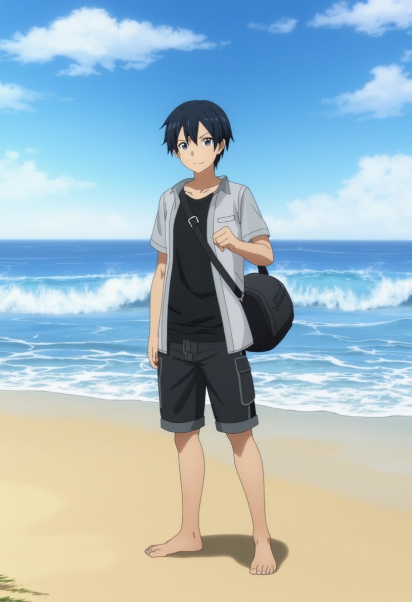 high resolution, solo, best quality, 1Boy, Kazuto Kirigaya, Black Hair, Black Eyes, At the beach, sand, waves, relaxation, shorts, open shirts, black t-shirts, layering look style,