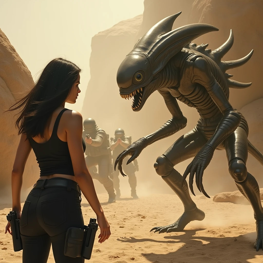 This is a high-resolution photograph featuring a dramatic scene set in a sci-fi environment. The image is bathed in a warm, sepia-toned light, creating a moody, atmospheric atmosphere. In the foreground, a woman with long, dark hair is engaged in a tense confrontation with a large, alien creature. The woman, wearing a sleeveless black top and tight black pants, appears determined and focused. She has a belt and a holster, suggesting she is armed. The alien creature, which resembles a cross between a human and a crustacean, has a large, pointed head with a prominent horn, and a segmented body covered in a shiny, metallic exoskeleton. It stands on four legs and is leaning forward, seemingly aggressive. The creature's eyes are wide and expressive, adding to the intensity of the scene. In the background, there are two more humans dressed in tactical gear, including helmets and body armor, who are crouched and aiming weapons at the alien. The setting is a rocky, sandy terrain with large boulders and a misty, smoky atmosphere, enhancing the sense of danger and mystery. The overall mood is intense and action-packed, with a strong emphasis on the contrast between the human and alien characters.