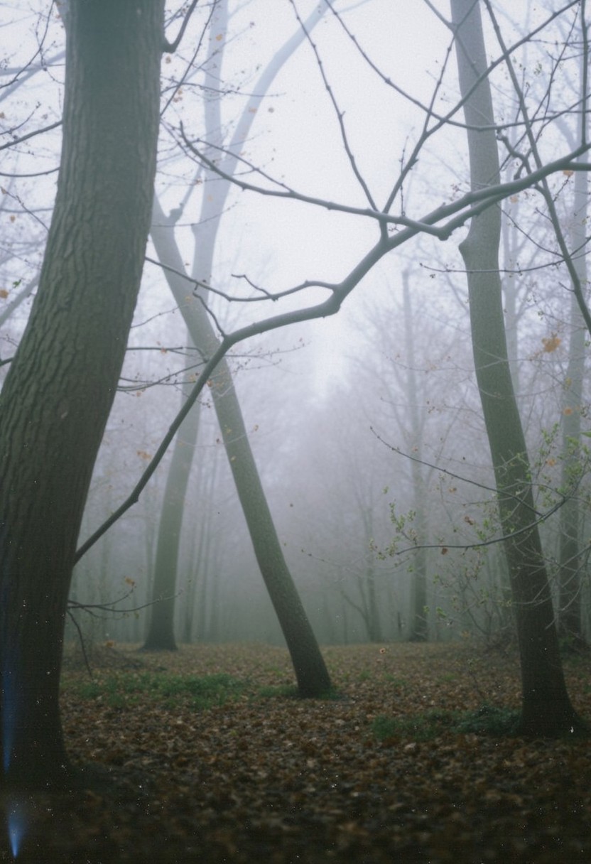 c41_hasselblad_portra400, a foggy forrest, old trees, some leafs