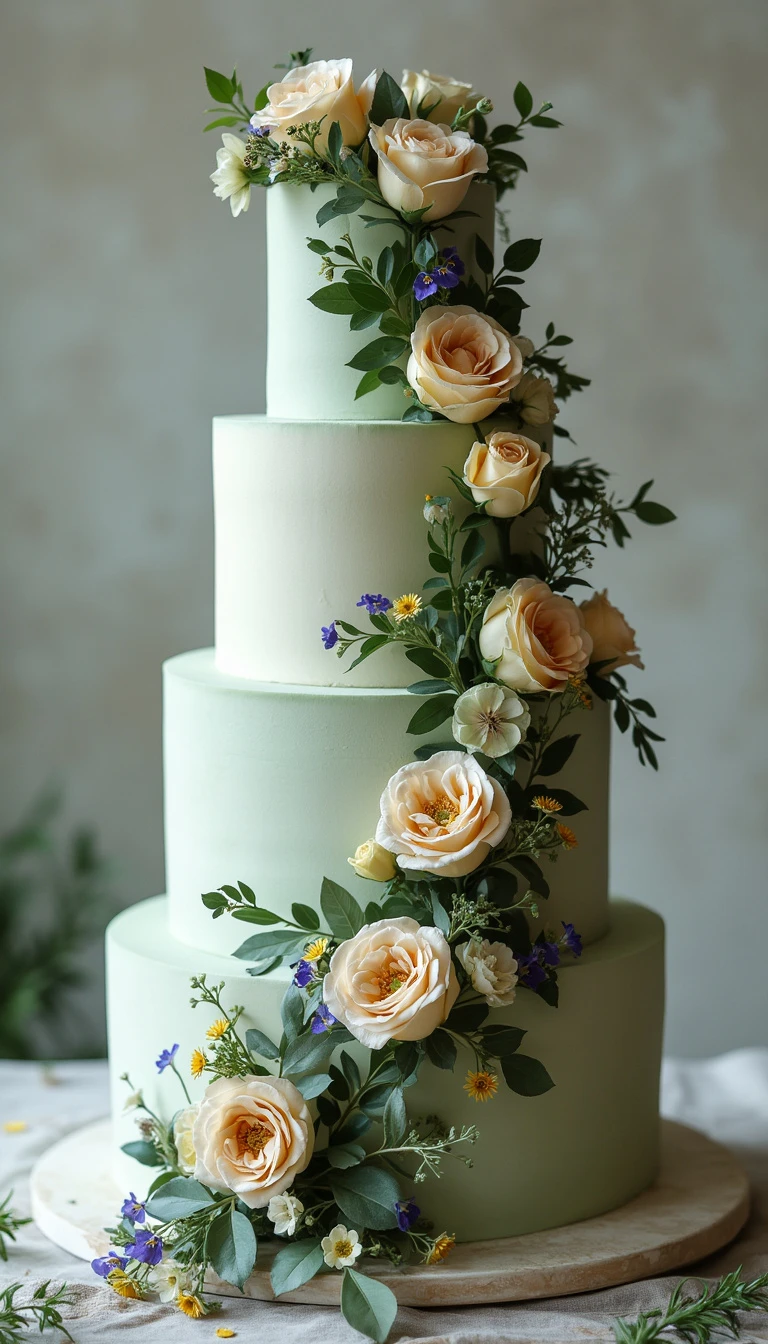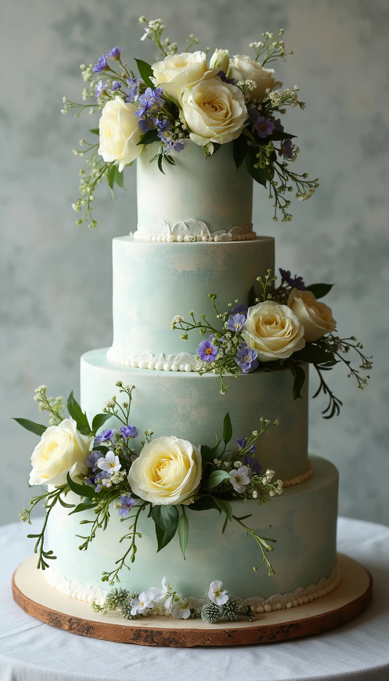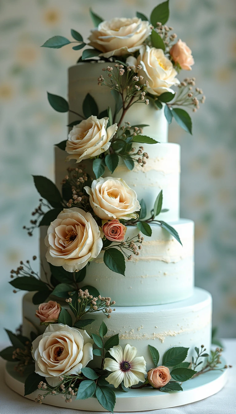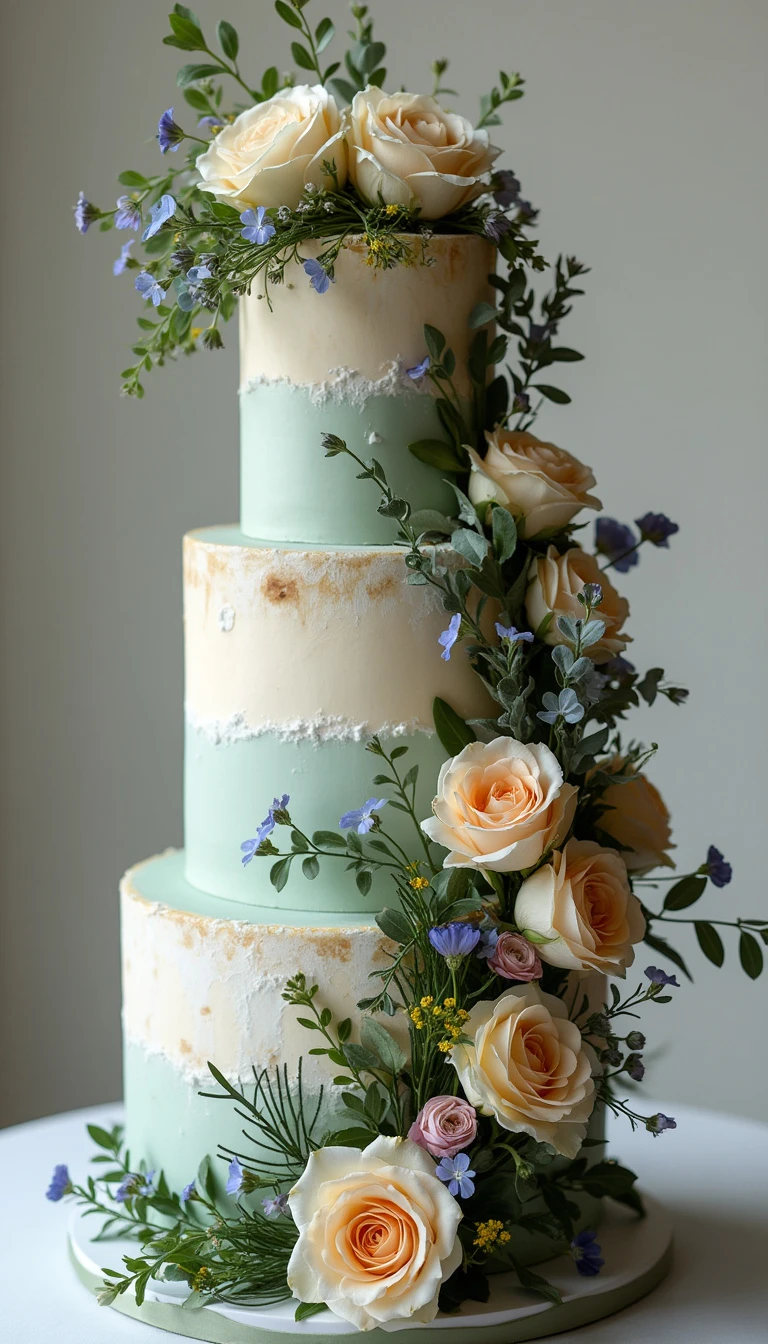 Hyperreaslistic photograph of A stunning cake with tiers in alternating shades of Linen and Cotton-White, adorned with a cascading arrangement of Dusty Sage roses and Pine-Green foliage. Edible flowers like violets and pansies are scattered among the blooms, creating a romantic and captivating focal point , professional photography,--no drawing, flat, illustration,sci-fi