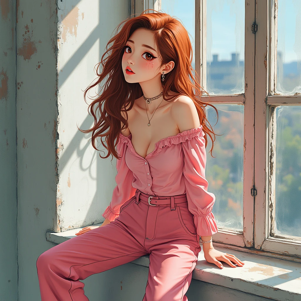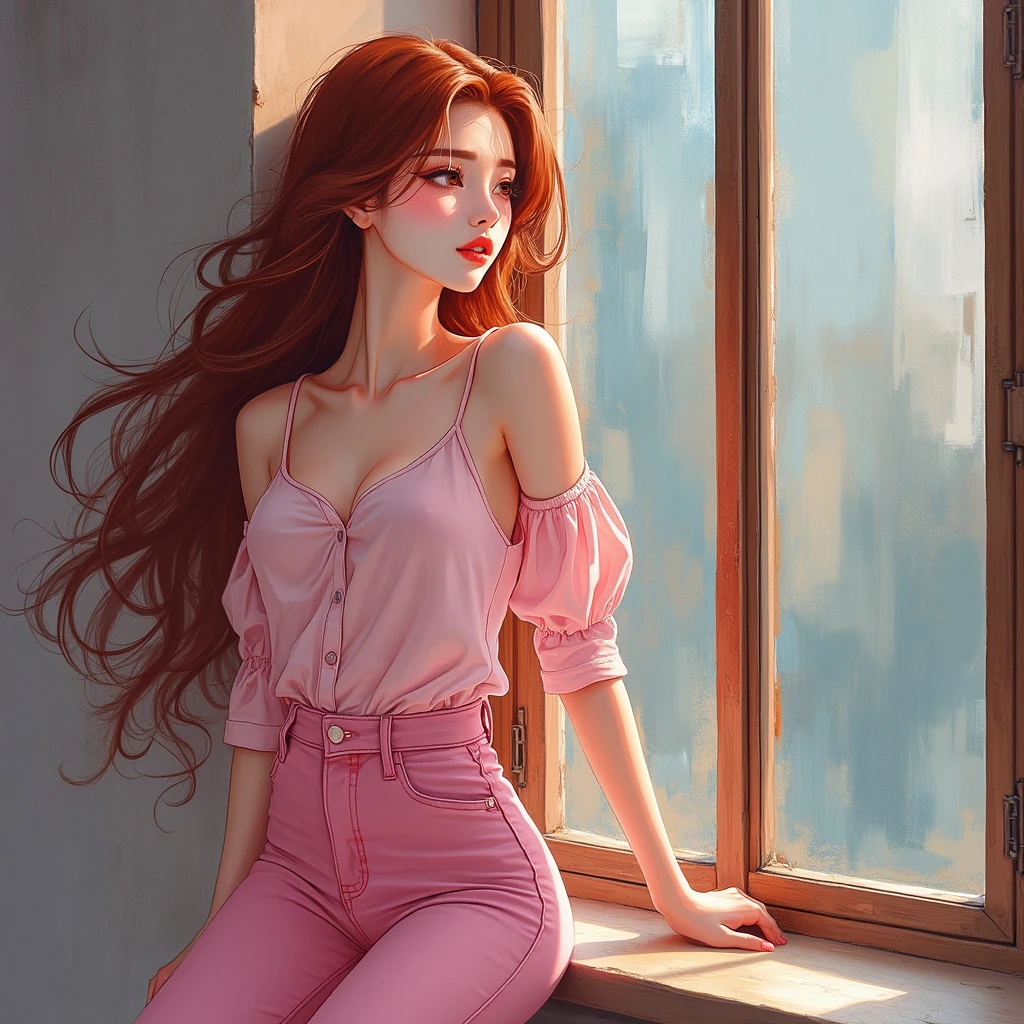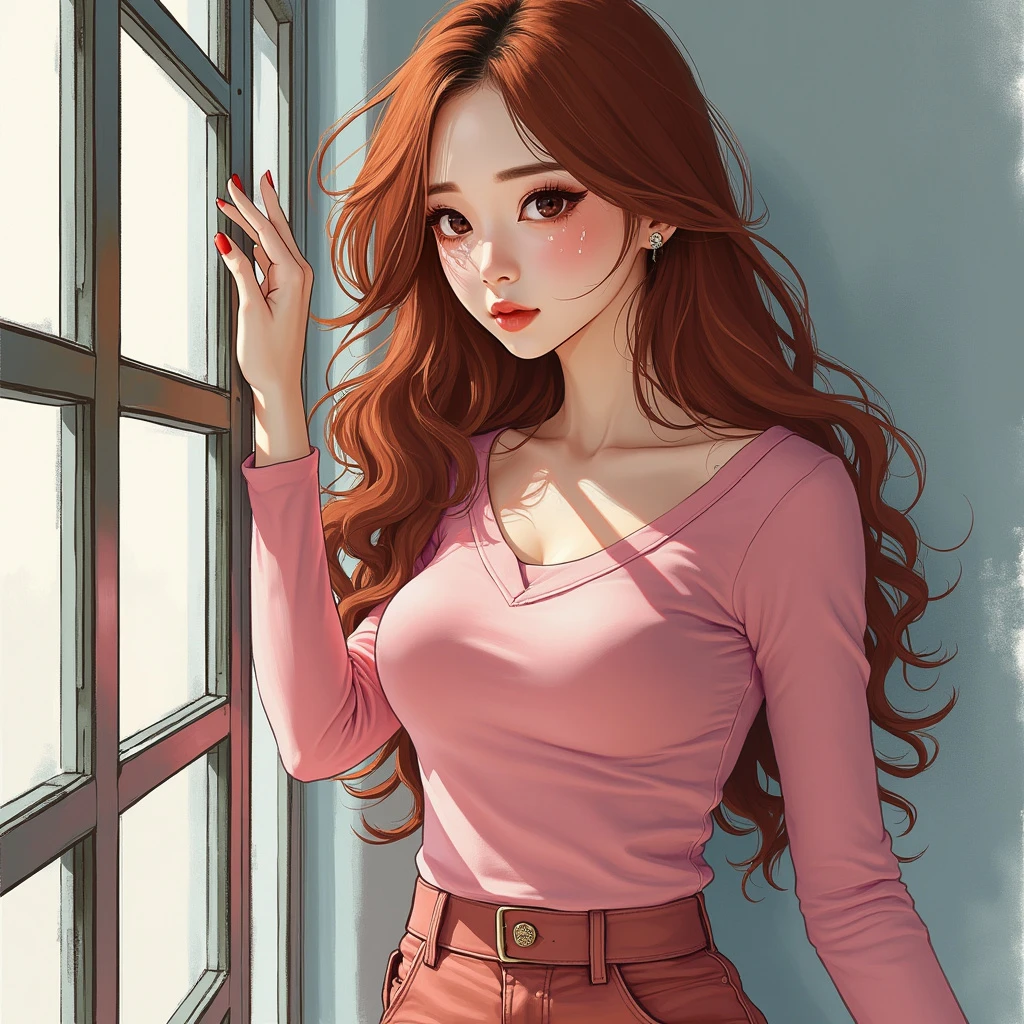 a beautiful Korean woman in trendy clothes leaning against a window with frames, pink clothes, elegant, stylish, long wavy windblown hair, auburn hair, detailed face, detailed skin, shapely, full body, two legs, graceful, flirty, five fingers, unzoom, luminism, Bar lighting, complex, 4k resolution, little fusion, intricate details, symmetrical eyes, symmetrical face, symmetrical arms, proportional arms, proportional legs, beautiful, face Clean detailed, high quality, high detail, high definition, unzoom, splashed with watercolors, large eyes, blush, long lashes, emo makeup, messy makeup, undilated eyes, profile, photorealism, she is looking out the window with a tear on her left cheek