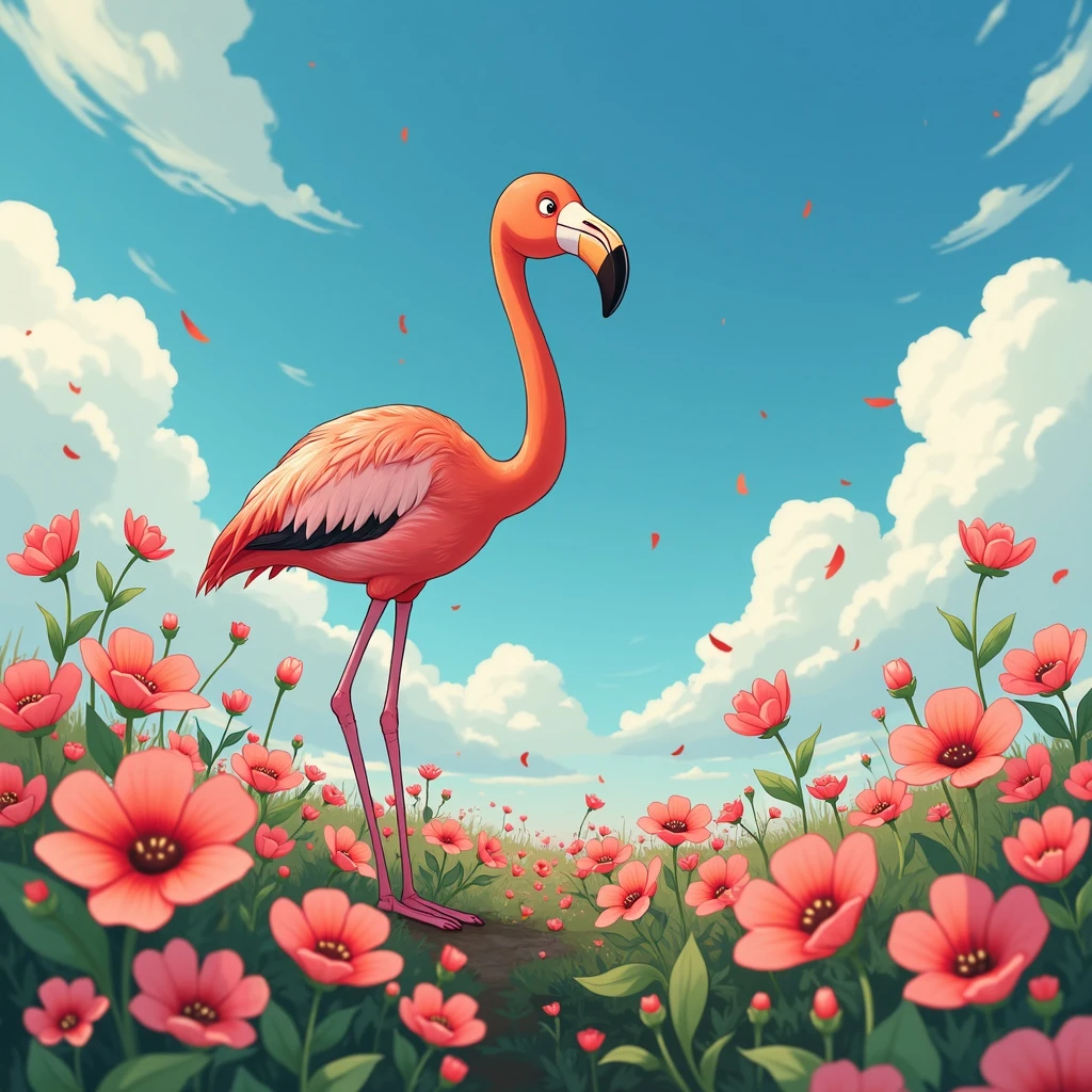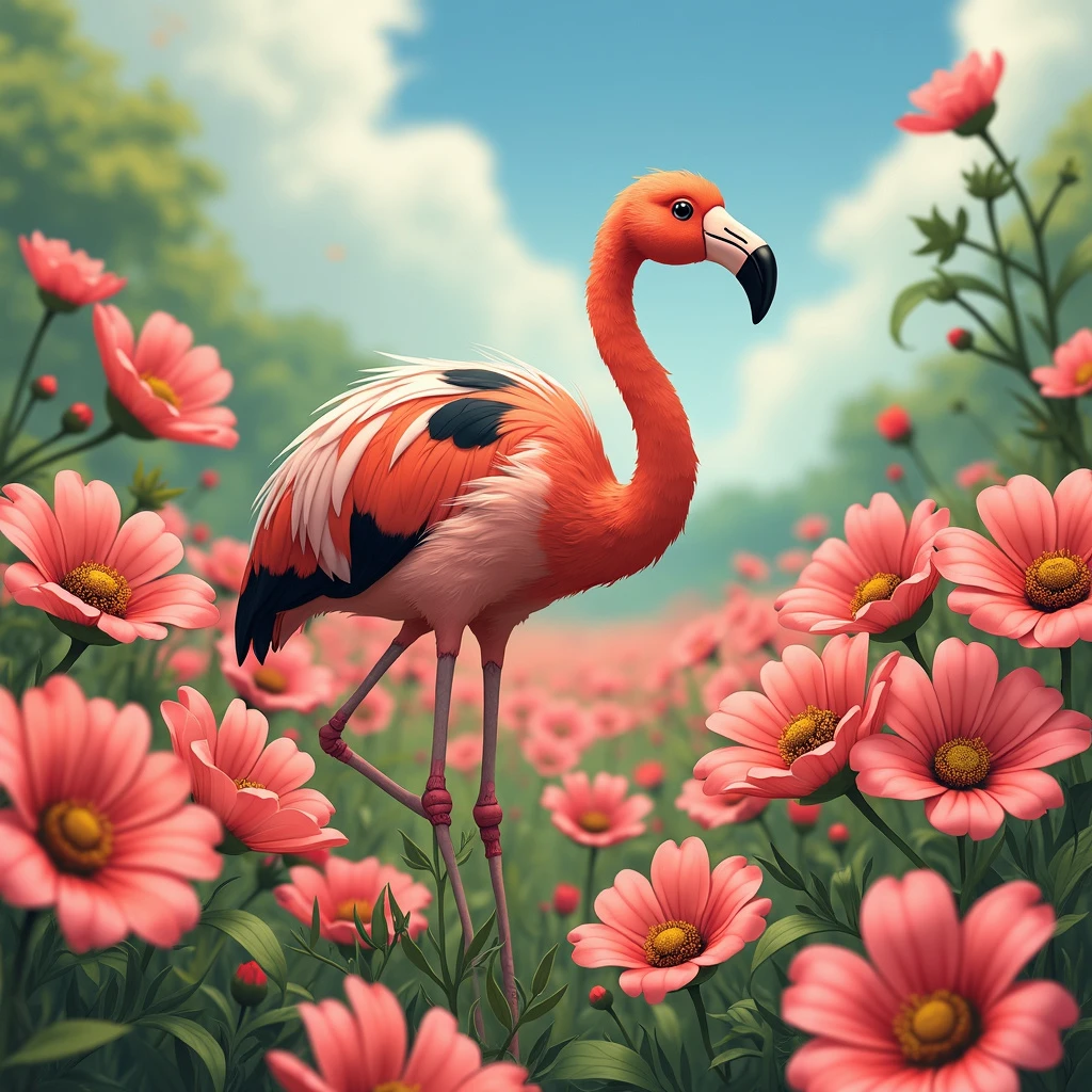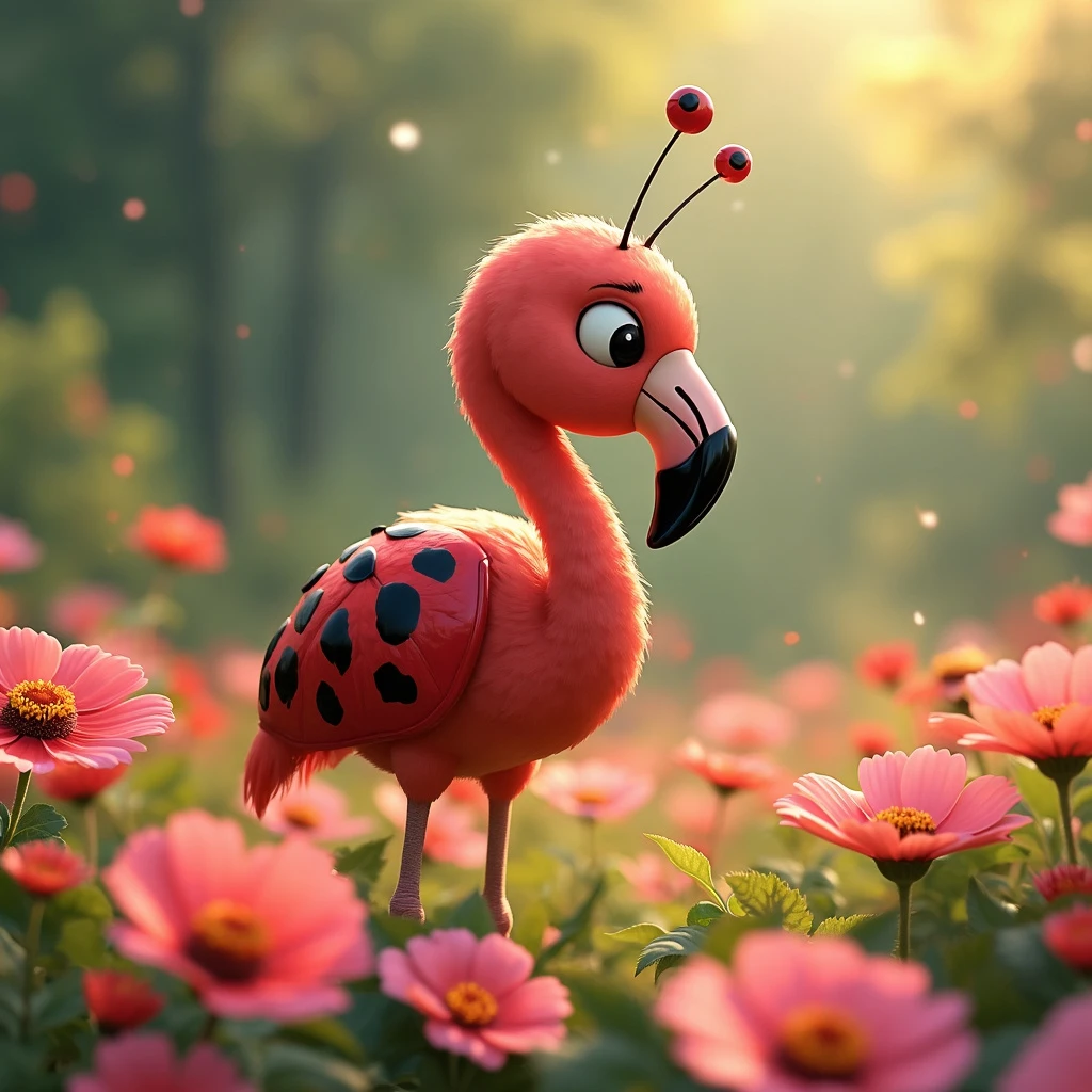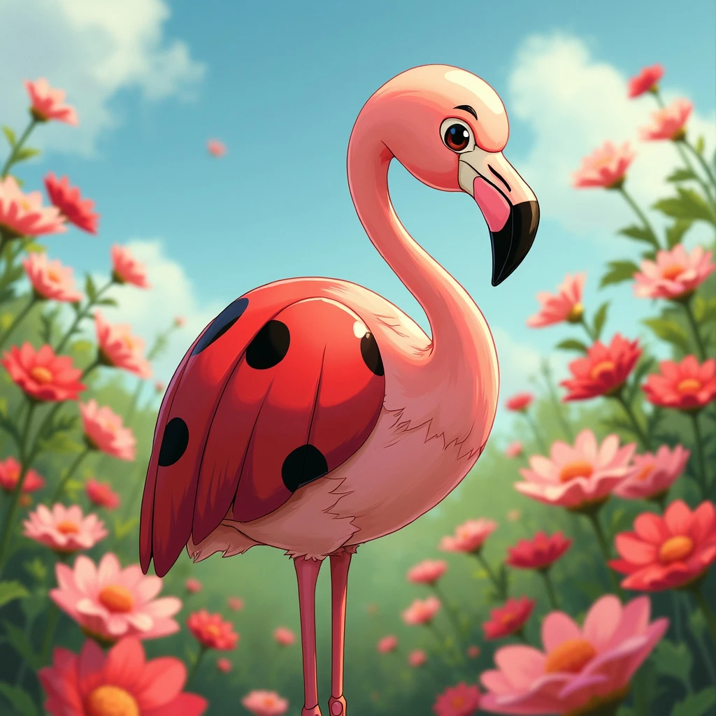 Anime manga kawaii Ghibli style. An adorable ladybug flamingo in a field of pink and red flowers.
