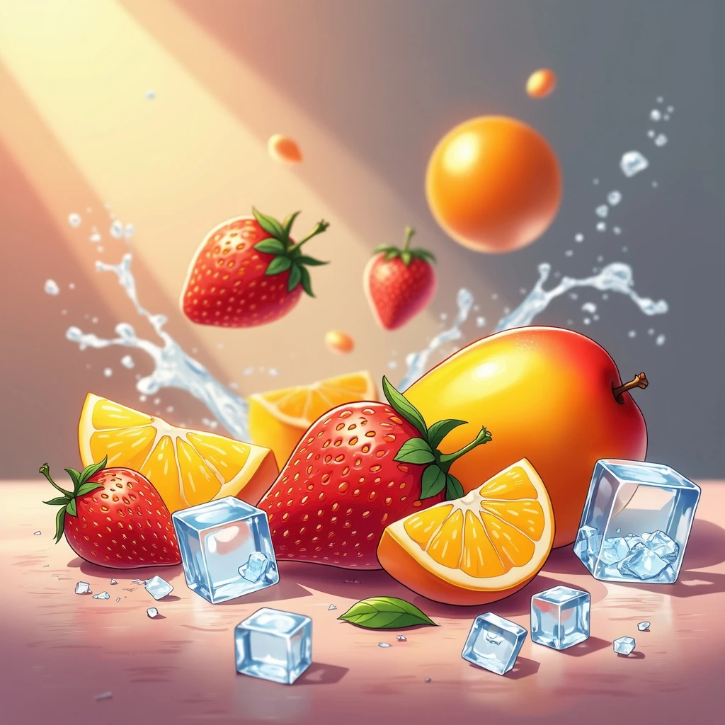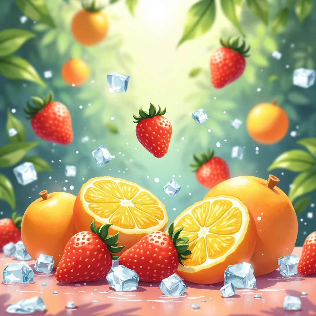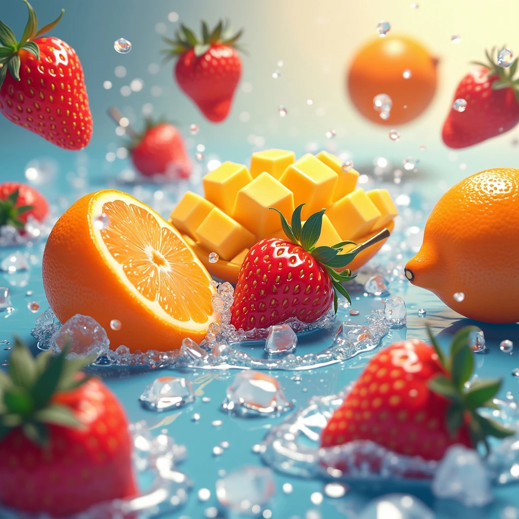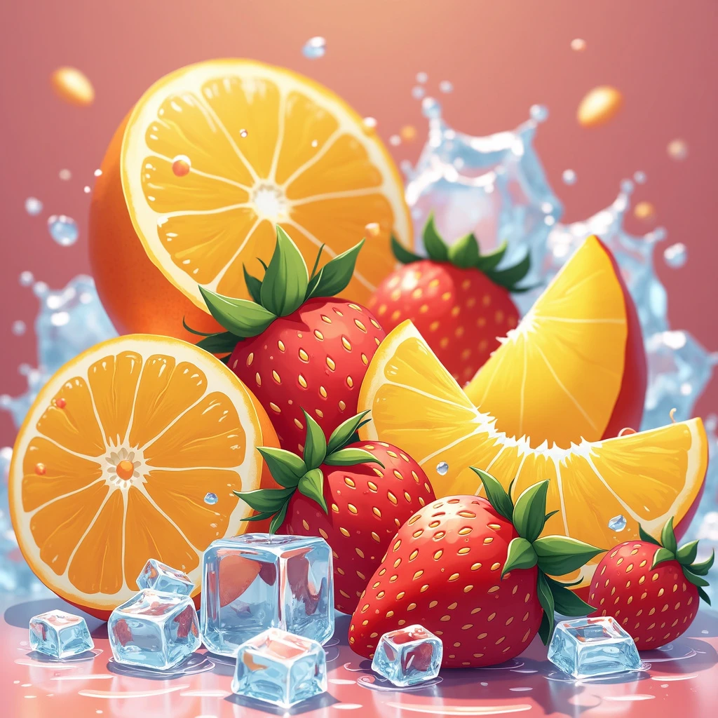Anime manga kawaii Ghibli style. strawberry, orange and mango some on the floor and some falling, with a splash of ice water and ice in 4k to show freshness of both fruits, pastel background blurred, more lighting in the center with little contrast. more anime style fruits. zoom out , space on the middle for product