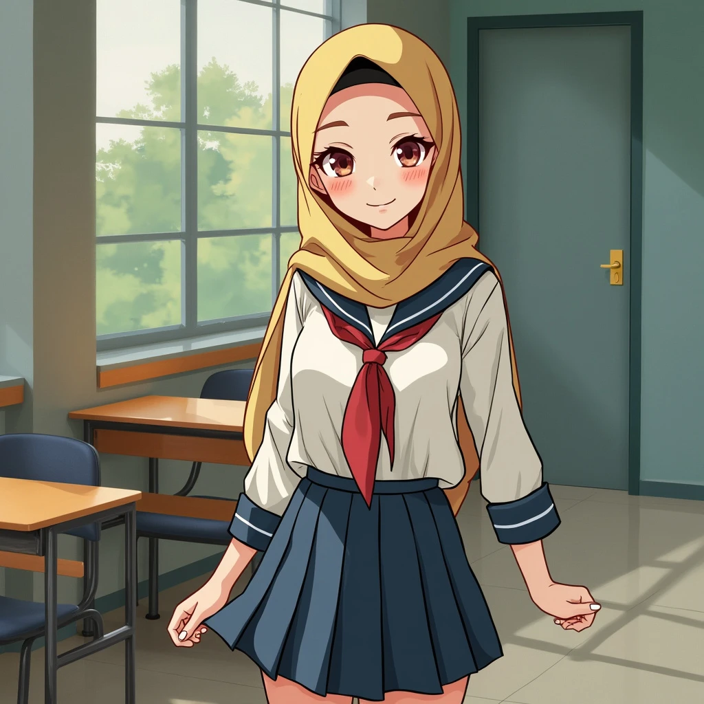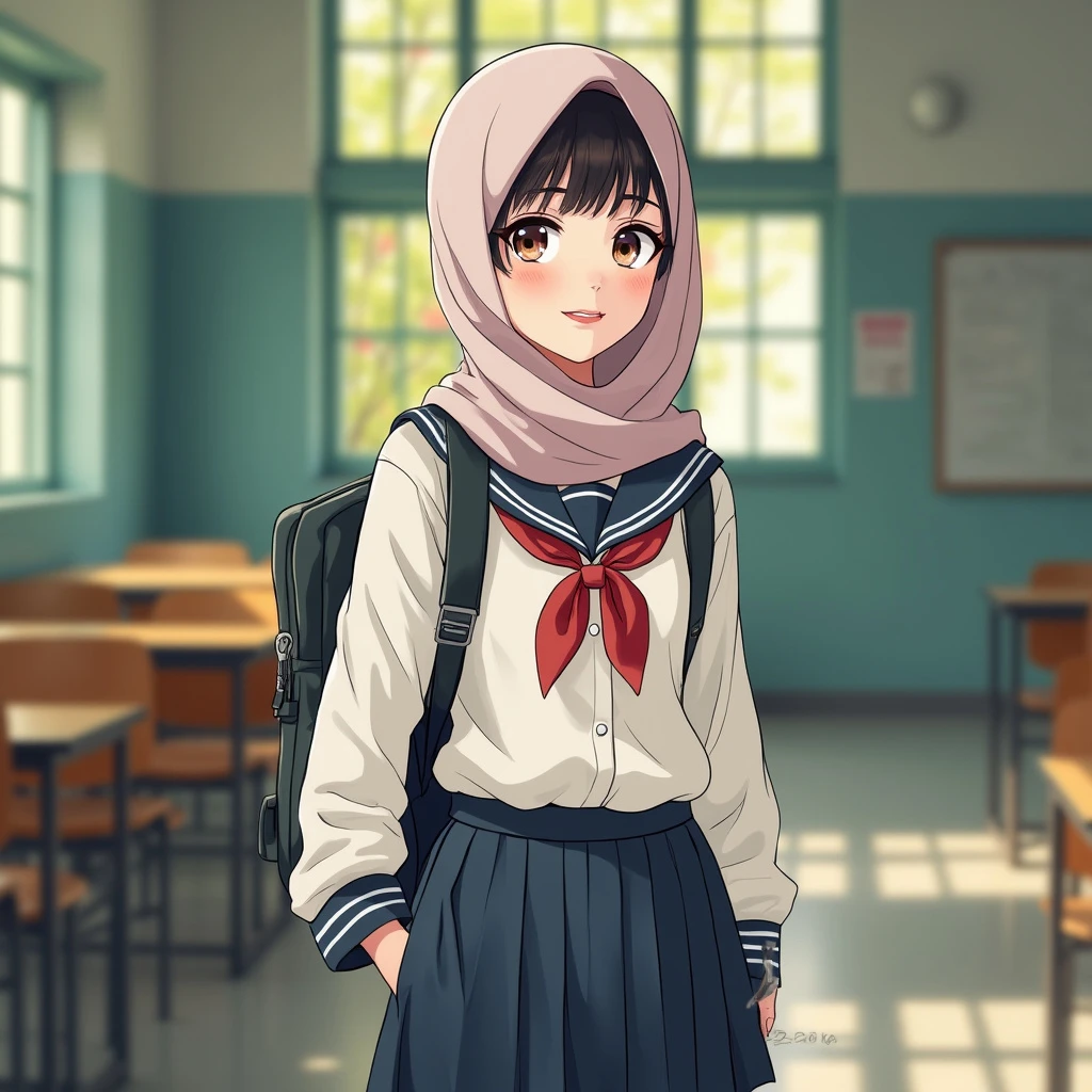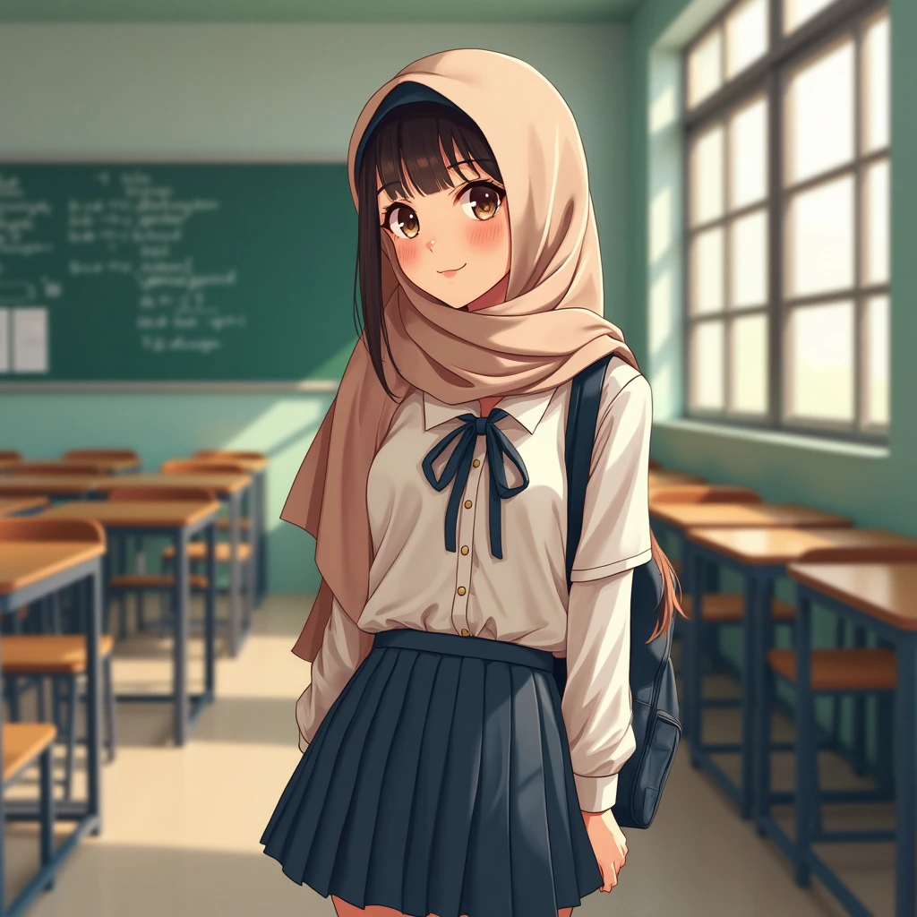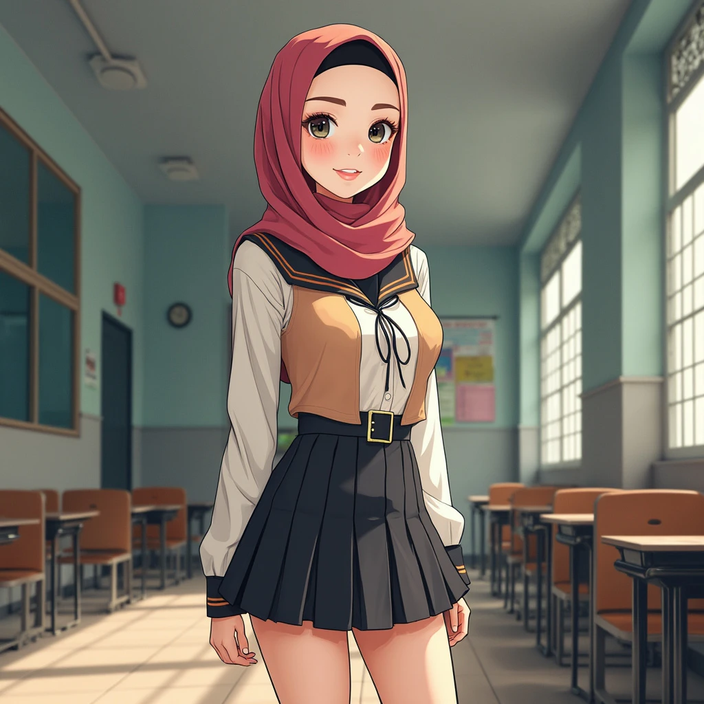 A portrait of beautiful Malaysian secondary school girl wearing a hijab, with a bit tight uniform revealing her body texture. The scene is at school