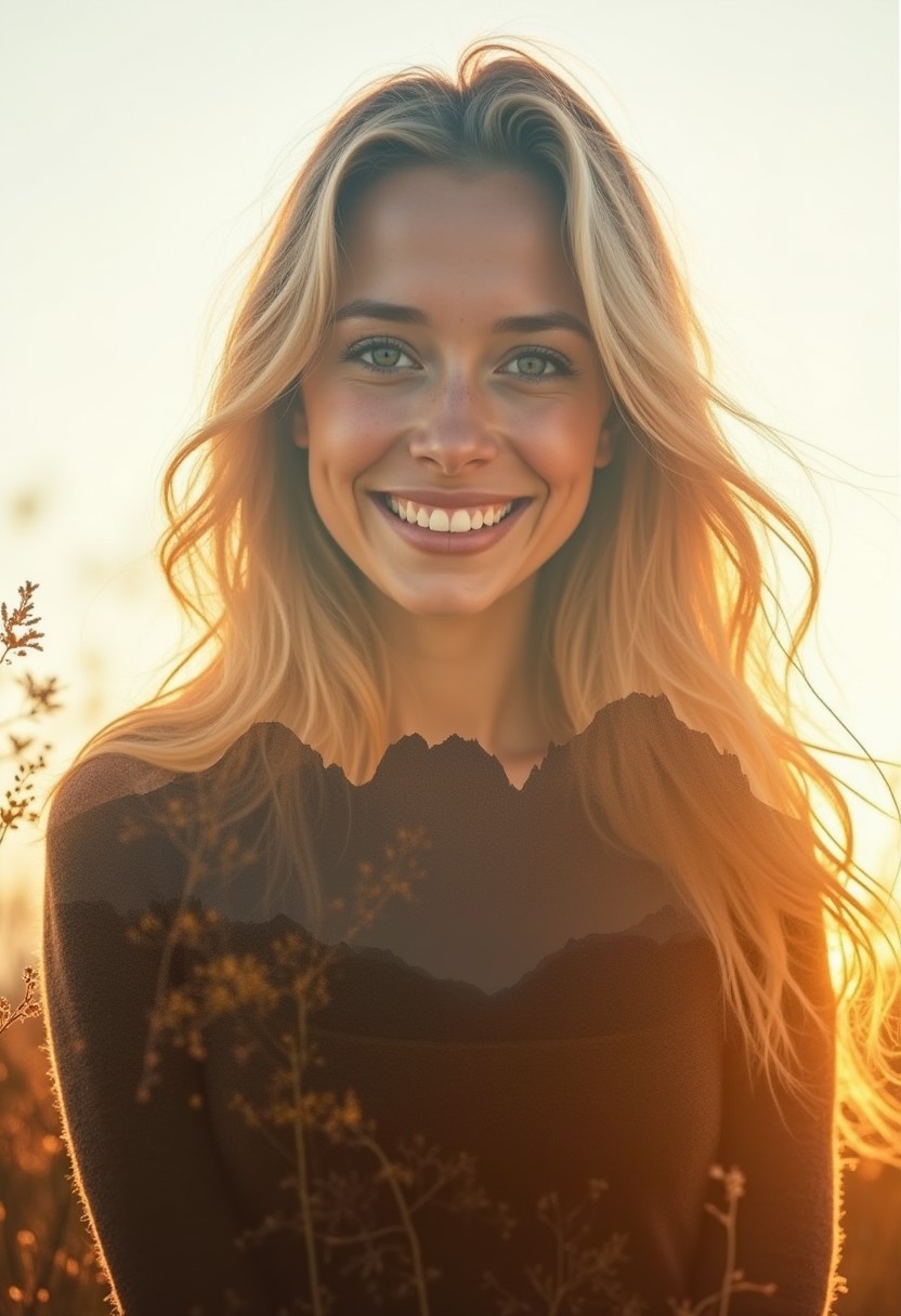 Silhouette of a beautiful blonde lady with long hair, double exposure, crisp lines,meadow background, big innocent eyes reflecting a mountain range,a tear rolling down her cheek, friendly smile, dog sitting by her side