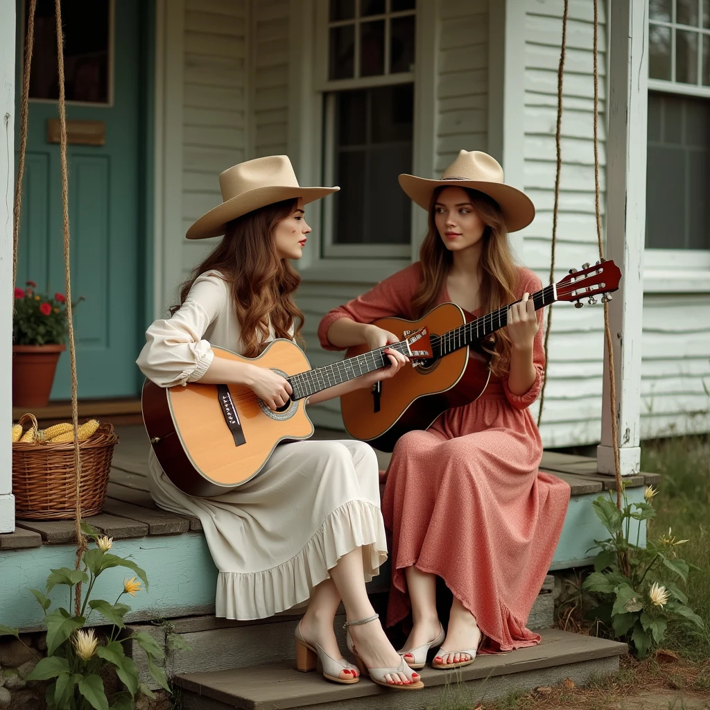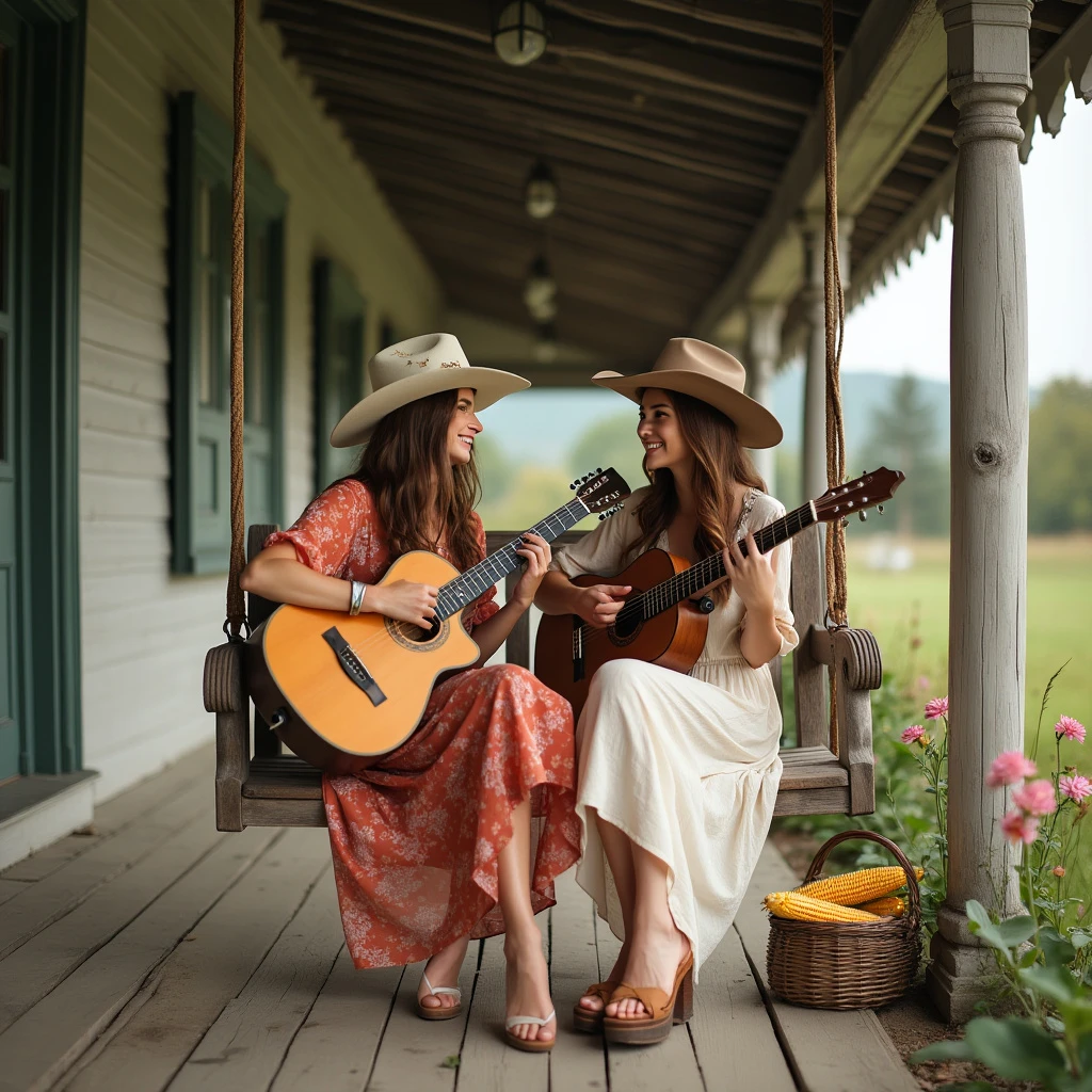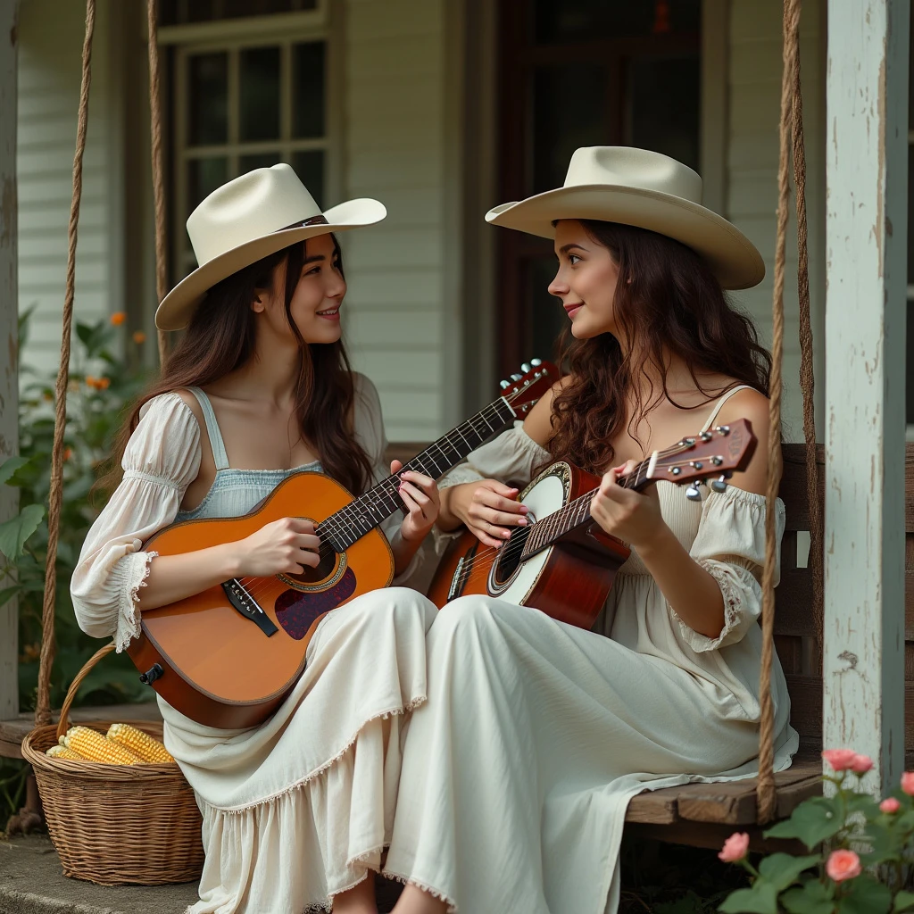 photo of two women with clear skin, 21 years old, 160 cm, 50 kg, beautiful body type, perfect proportions, realistic, ultra realistic, super fine, 8k, portrait photography, stylized fashion photo, realistic, super realistic, ultra realistic, photo-realistic, sitting on a porch swing outside of an old country home, playing a guitar and a banjo, they both have long wavy hair and are wearing cowboy hats, and wearing long country style dresses, they are looking at one another, there's a basket of corn near by, flowers grow along the side of the porch