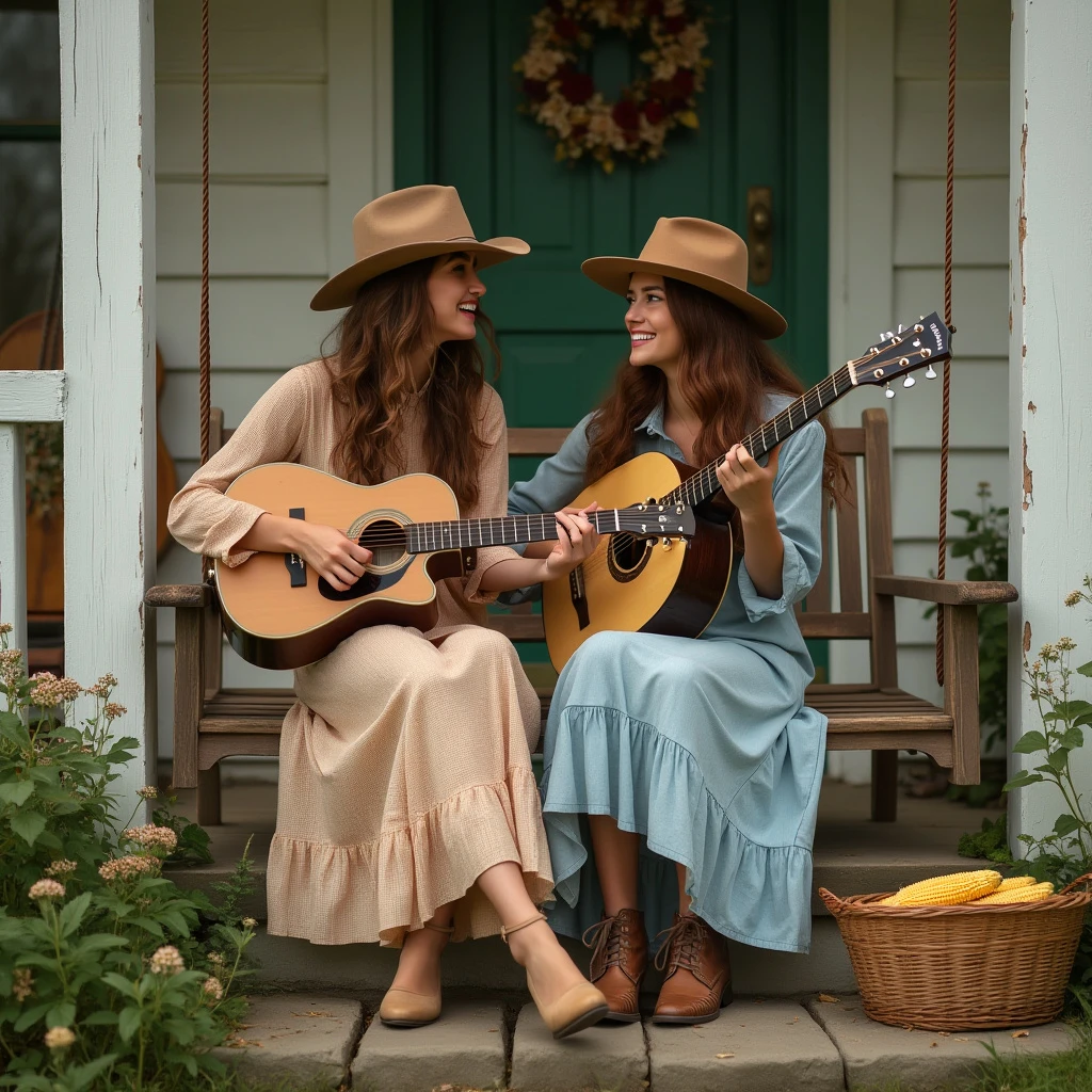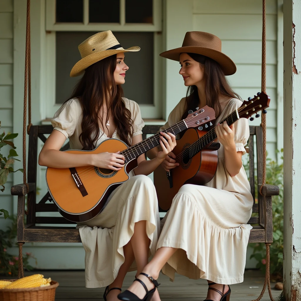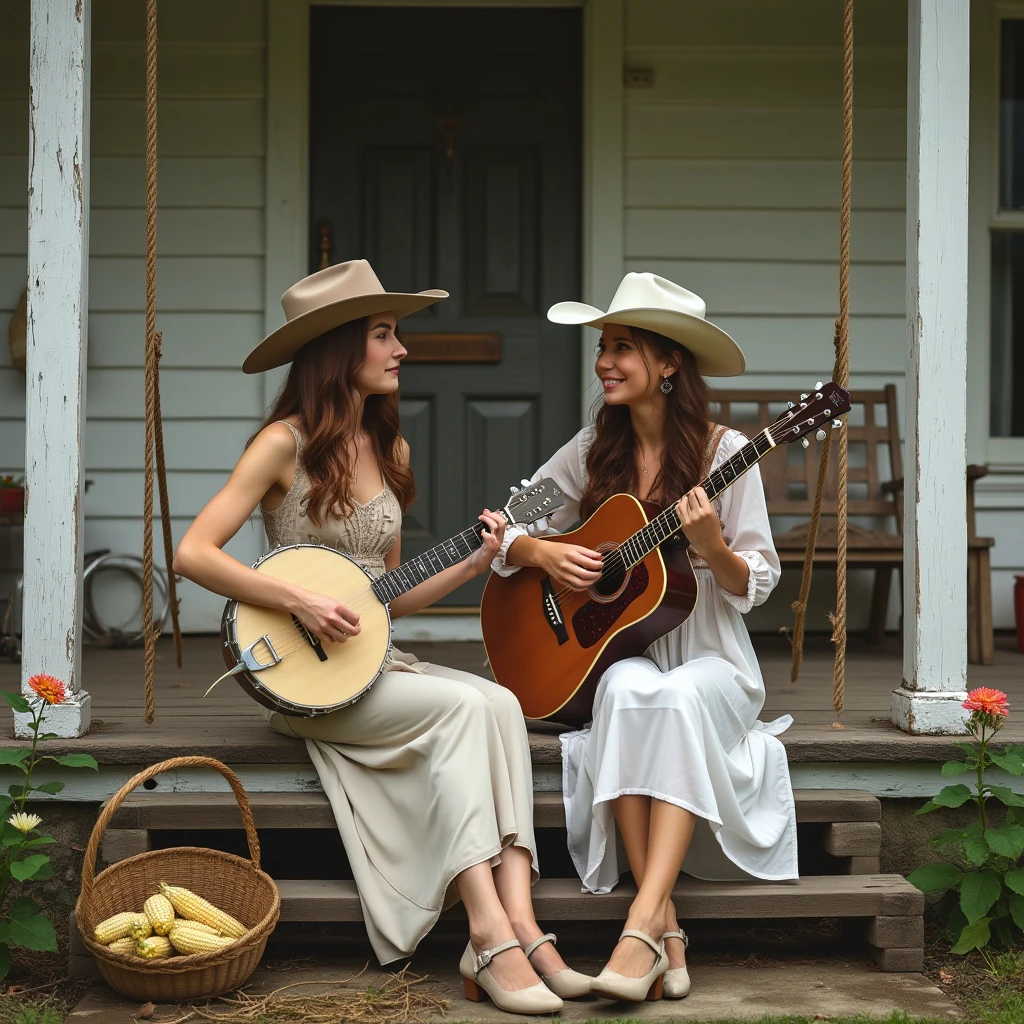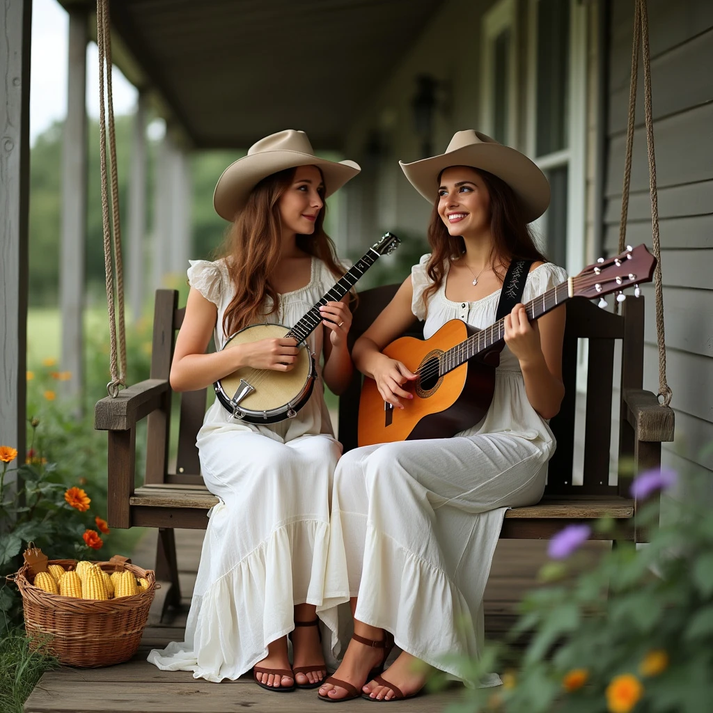 photo of two women with clear skin, 21 years old, 160 cm, 50 kg, beautiful body type, perfect proportions, realistic, ultra realistic, super fine, 8k, portrait photography, stylized fashion photo, realistic, super realistic, ultra realistic, photo-realistic, sitting on a porch swing outside of an old country home, playing a guitar and a banjo, they both have long wavy hair and are wearing cowboy hats, and wearing long country style dresses, they are looking at one another, there's a basket of corn near by, flowers grow along the side of the porch