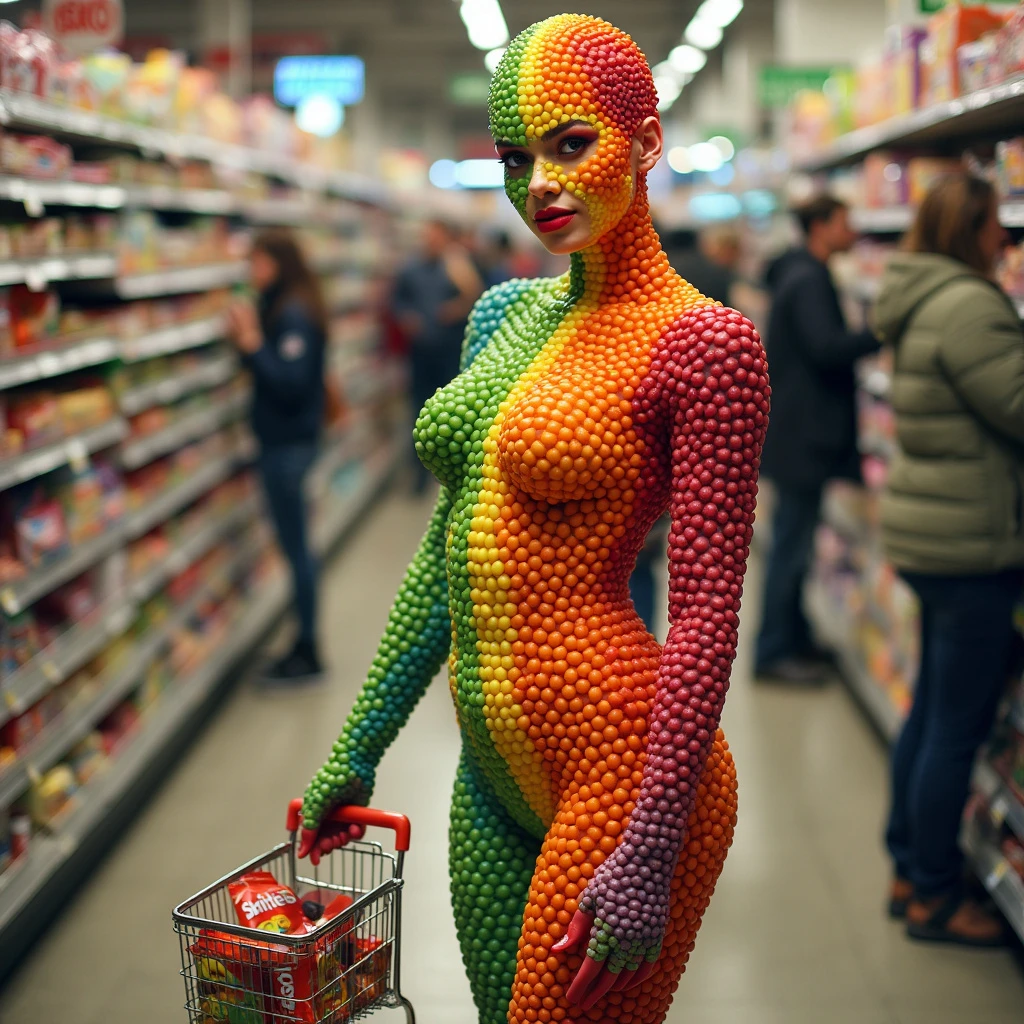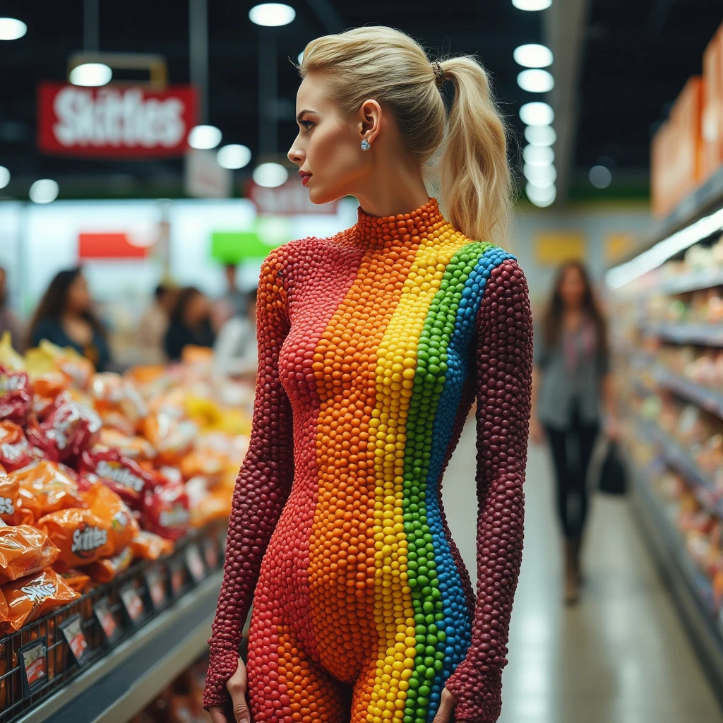 a creative artistic ad for skittles a gorgeous 21 y.o women made entirely of different color skittles shopping in a busy supermarket with everyone staring at her, she has a perfect body hourglass, in the bottom the text says " would you taste the rainbow :p "