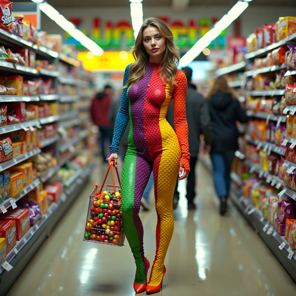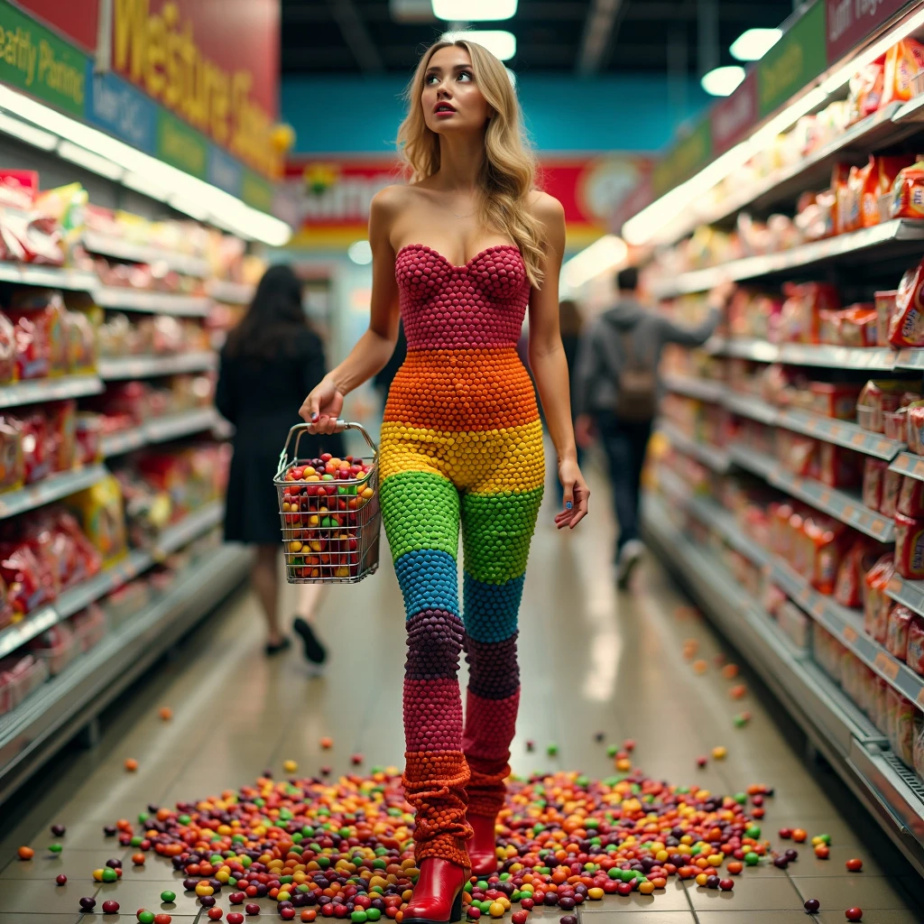 a creative artistic movie Poster movie At the top in bold rainbow colored letter says " would you Taste The Rainbow ?? " At the top in bold rainbow colored letter says " would you Taste The Rainbow ?? " At the top in bold rainbow colored letter says " would you Taste The Rainbow ?? " At the top in bold rainbow colored letter says " would you Taste The Rainbow ?? " a gorgeous 21 y.o women made entirely of different color skittles shopping in a busy supermarket with everyone staring at her, she has a perfect body hourglass,