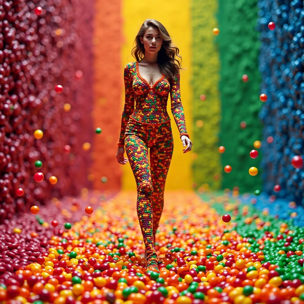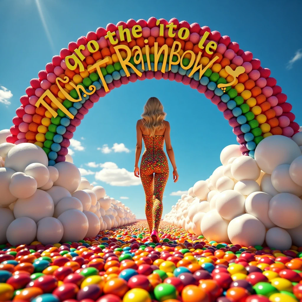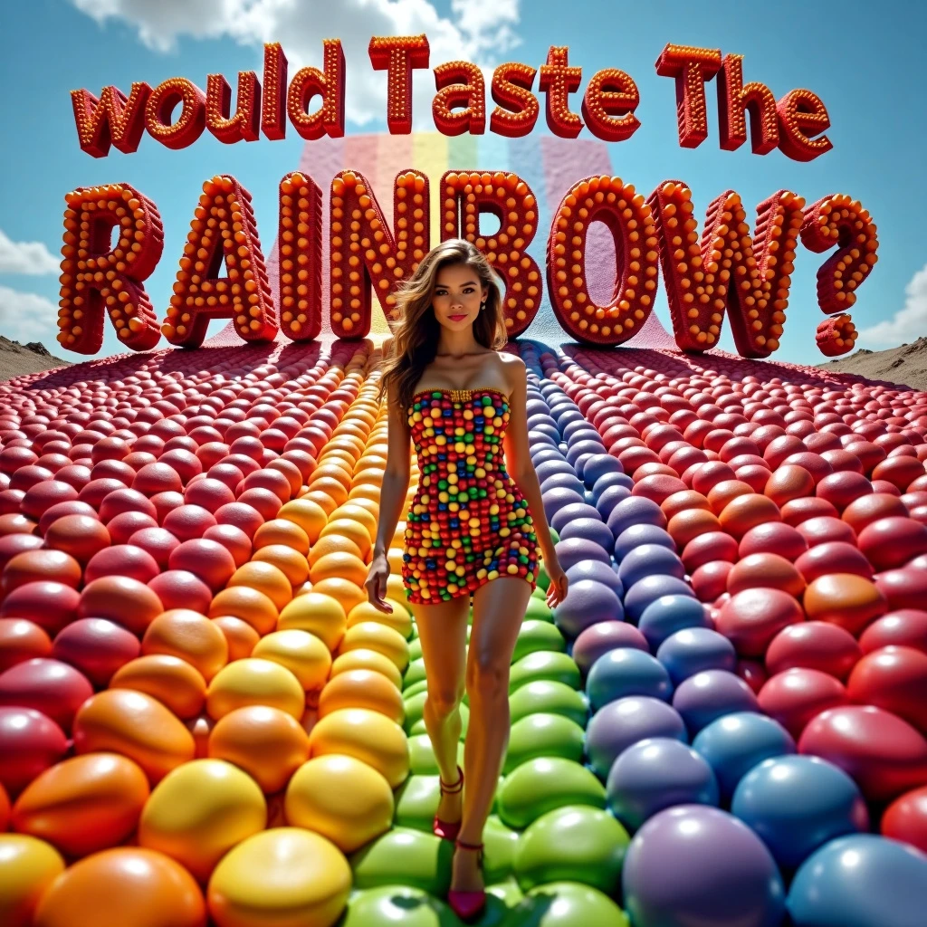 a creative artistic movie Poster movie At the top in bold rainbow colored letter says " would you Taste The Rainbow ?? " a women made entriely of skittles walking under neath the letters she is 21 y.o gorgeous with a perfect hourglass body.