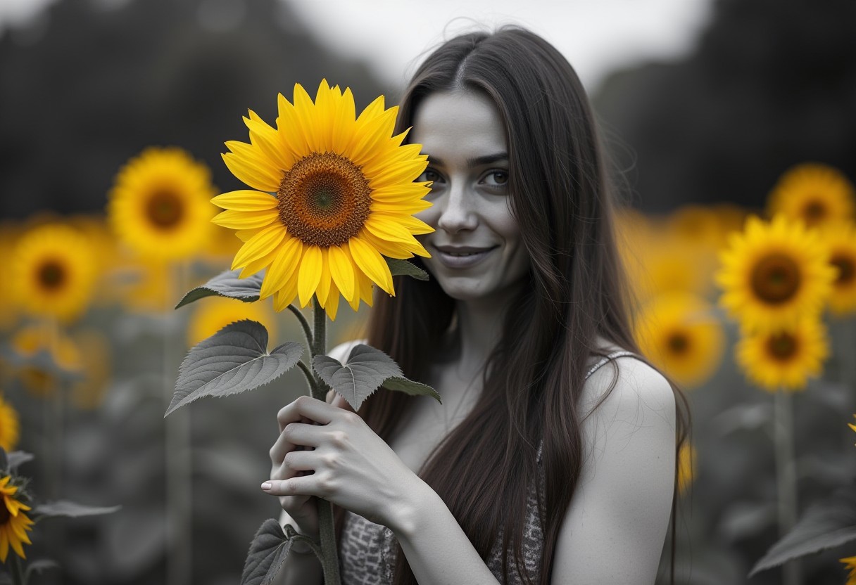 Selective Colouring photo of woman holding a sunflower, yellow sunflower, monochrome, garden in background. large black letters across the sunflower, "Happiness".