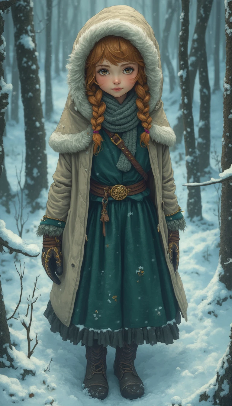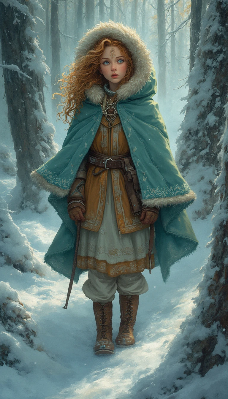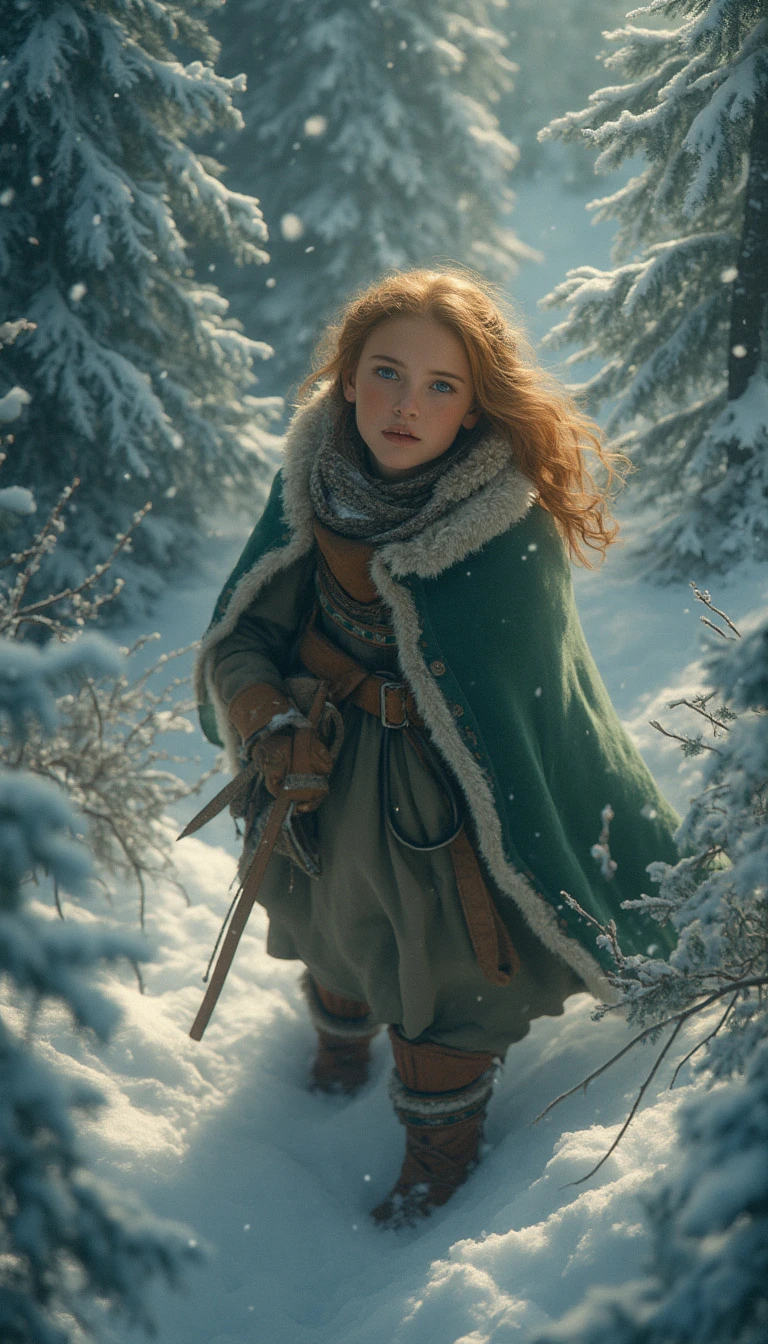 Romanticism Fairy tale, designed by Steven Holl, High angle view, View from high above, overlooking the scene downwards, Detailed digital artwork, the daughter of a Siberian huntress, depicted against the backdrop of a snow-covered forest in the heart of Siberia, her golden-brown curls framed by a fur-lined hood, her keen eyes scanning the vast expanse of wilderness with a mixture of curiosity and determination, Leica 35mm f1.4 Summilux M-35mm lens capturing the intricate details of her traditional fur clothing and rustic accessories, cool tones with accents of deep green and icy white echoing the stark beauty of the Siberian landscape, evocative historical portrayal, her stance confident yet grounded, her slender frame adorned with intricately embroidered leather boots and an icy celeste cloak, expression both spirited and serene, the forest alive with the quiet whispers of nature and the ancient wisdom of her ancestors, artistically rendered by a local Siberian artist, soft daylight filtering through the canopy, casting a gentle glow upon the scene, capturing the enduring spirit of the Siberian huntress and her daughter,Magical, fantastical, enchanting, storybook style, highly detailed