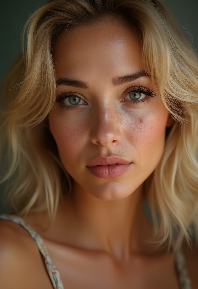 "A hyper-realistic portrait of a blonde woman with detailed skin texture. Her hair is shoulder-length, wavy, and naturally golden blonde, catching the light with a soft sheen. Her skin shows realistic pores and subtle imperfections, with visible fine lines, freckles, and a natural glow. The lighting is soft, emphasizing the contours of her face, with detailed shading that enhances the depth of her features. Her eyes are expressive and sharp, with light reflections adding to the realism. The background is simple and slightly out of focus, ensuring all attention is on her realistic, textured face."