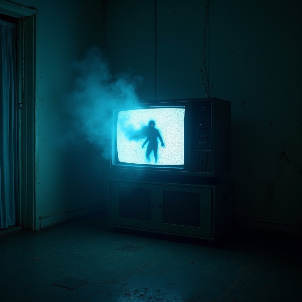 A large unplugged old fashioned tube TV showing static, in a creepy abandoned hospital room, crawling our from the TV screen is a poltergeist demon made of pure static energy and wispy blue smoke, the evil being emerging from the TV is lighting up the room around it, eerie light and shadows, scary, frightening,