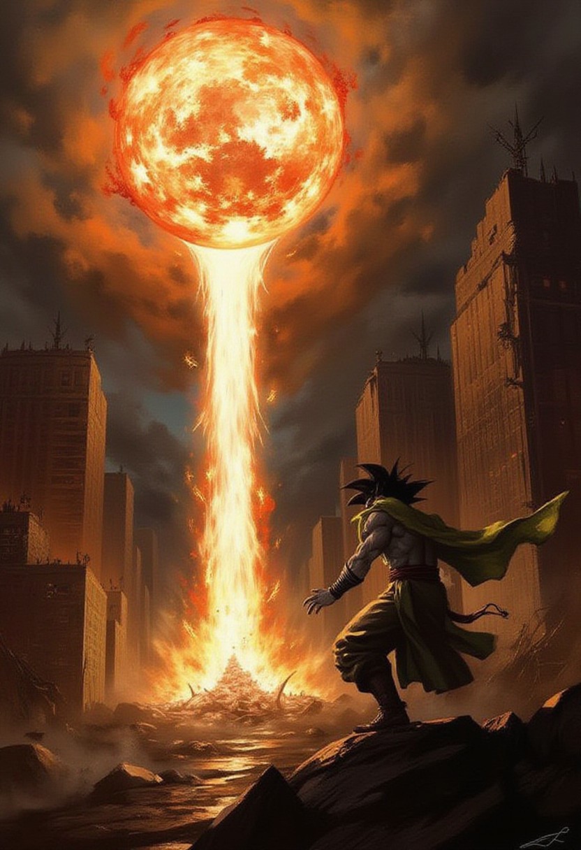 masterpiece, high quality, high rez, 4k, oil painting, masterpiece, in the style of carravagio painting, vegeta from dbz anime, in action pose,lanching huge fireball from space to earth, chiarroscuro, destroyed city all around him, smoke, fire, wind