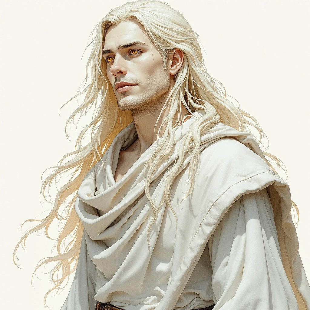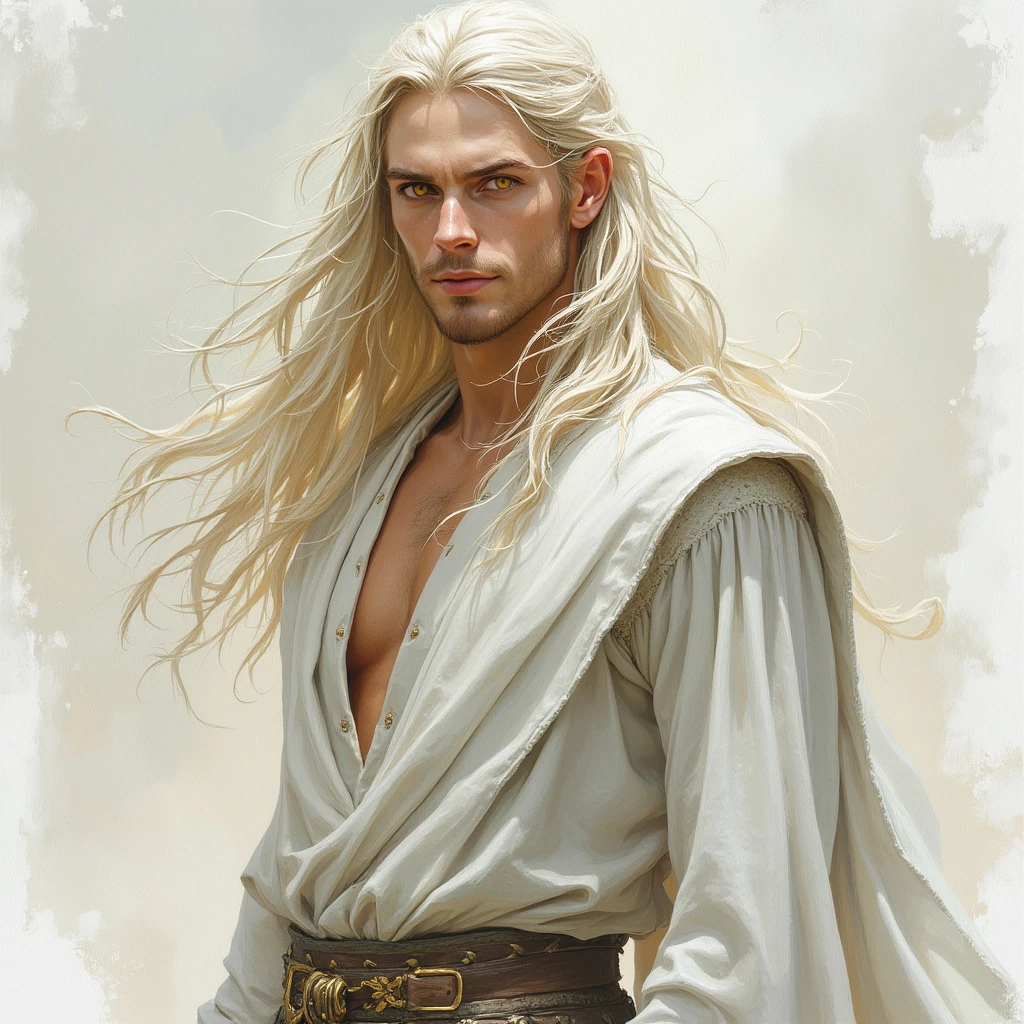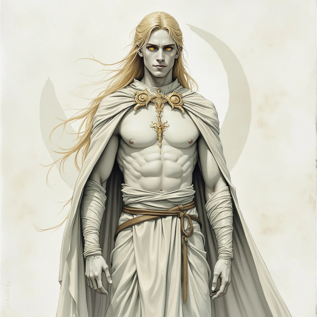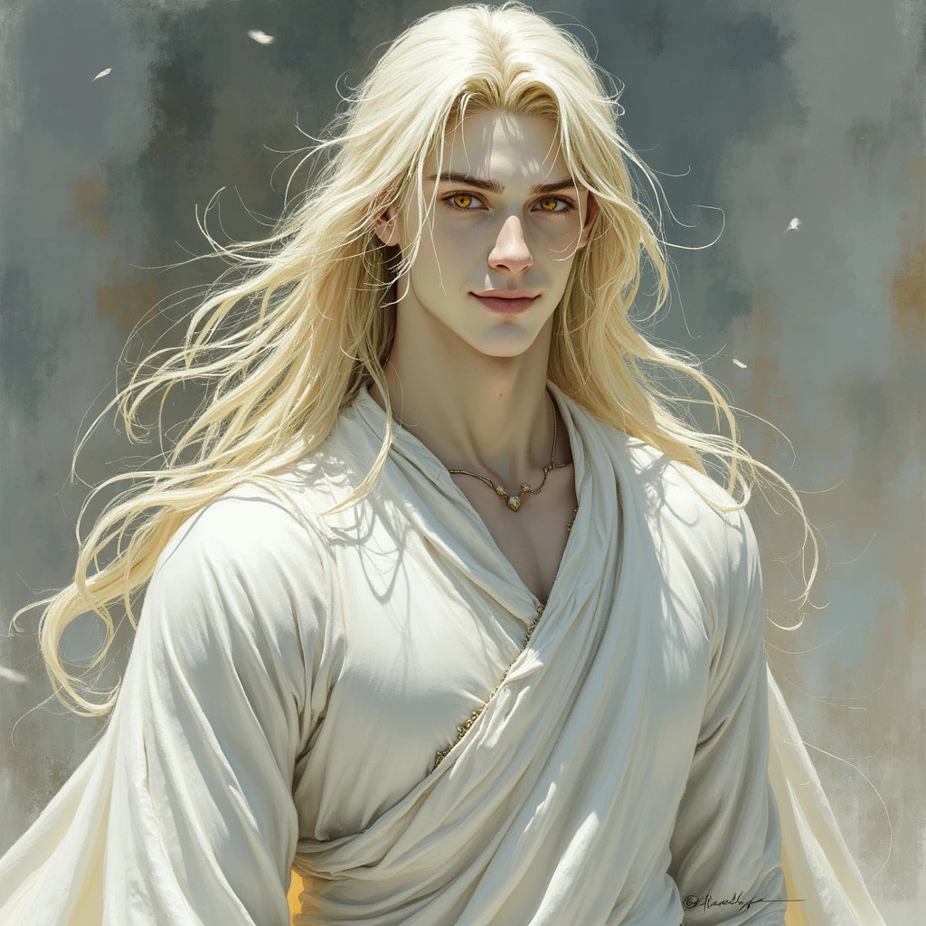 Snow-white marble skin. Watercolor painting. Dark medieval fantasy. Divine male creature. Calm smiling face. Yellow eyes. Simple white long clothes. Long blonde hair. Strong body