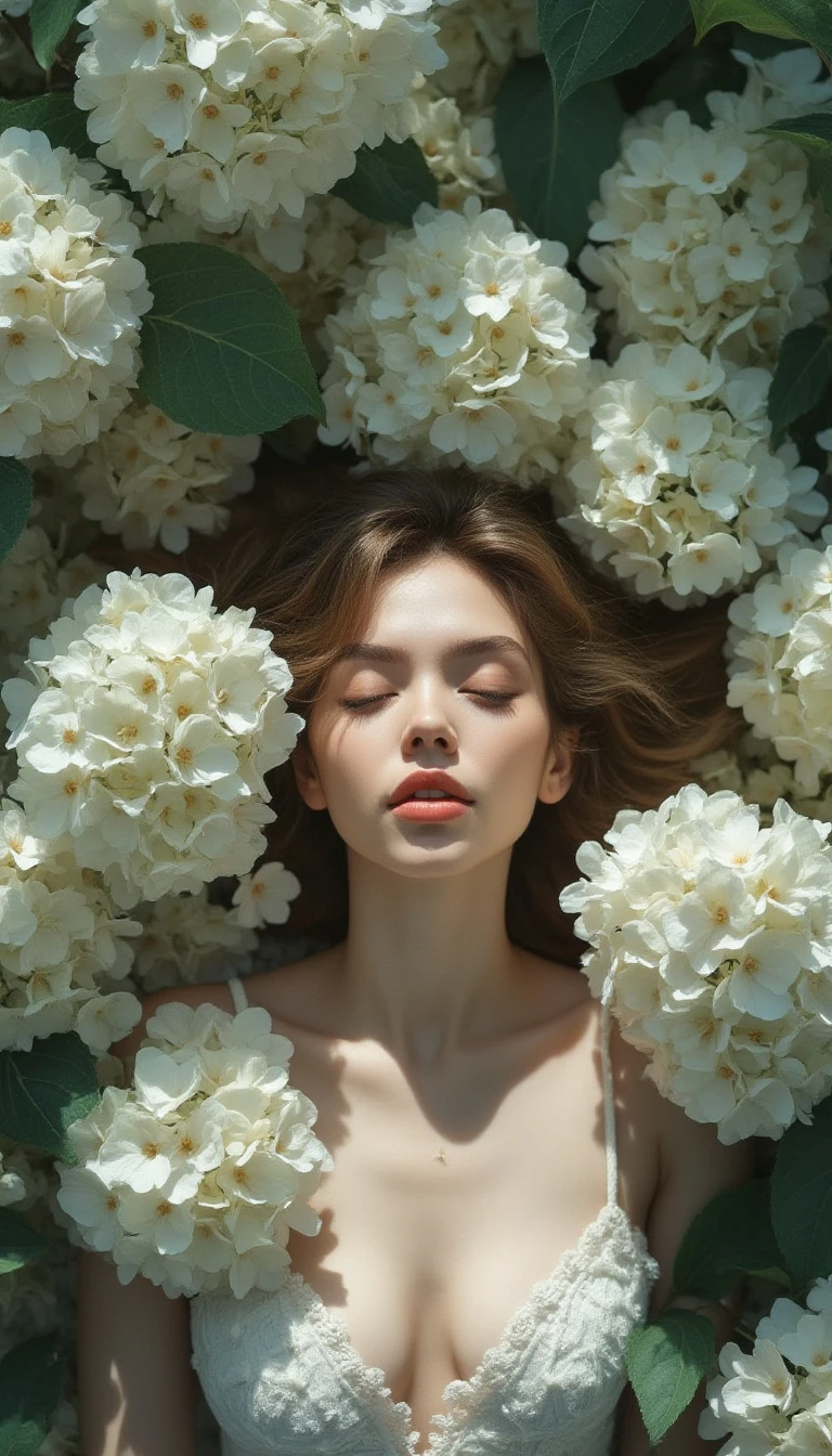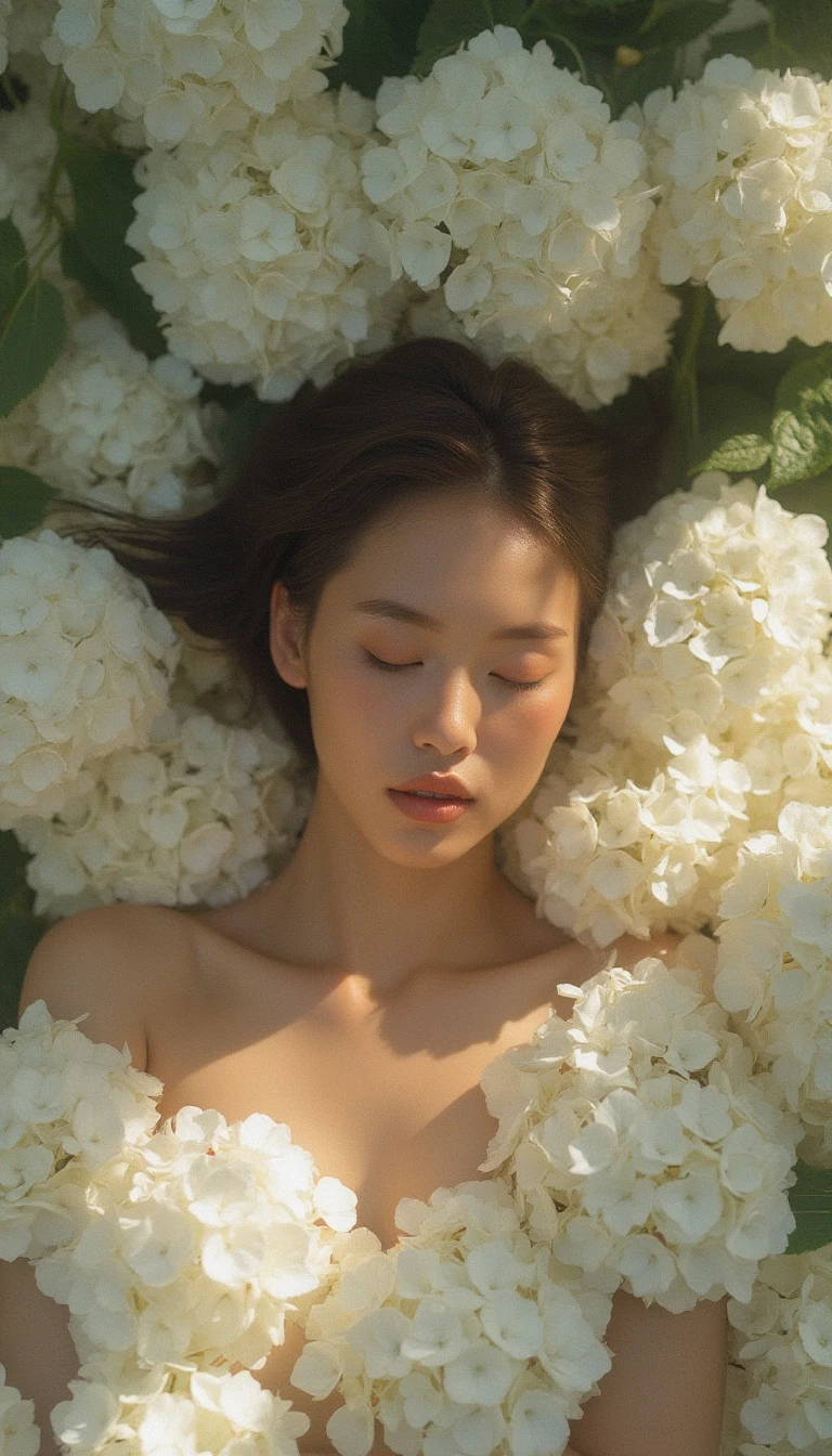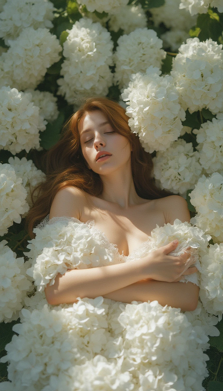 A tranquil and intimate portrait of a woman lying amidst a sea of white hydrangeas, her body softly embraced by the delicate petals. The light is soft and natural, casting gentle shadows that create a calm and serene atmosphere. The image captures the essence of peace and harmony with nature, emphasizing the beauty of simplicity. Created Using: High-definition surreal photography, natural light, inspired by peaceful solitude and nature's elegance, hd quality, natural style