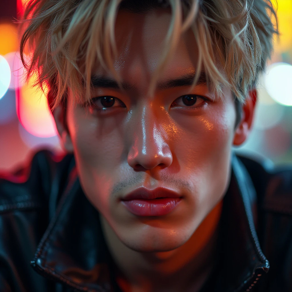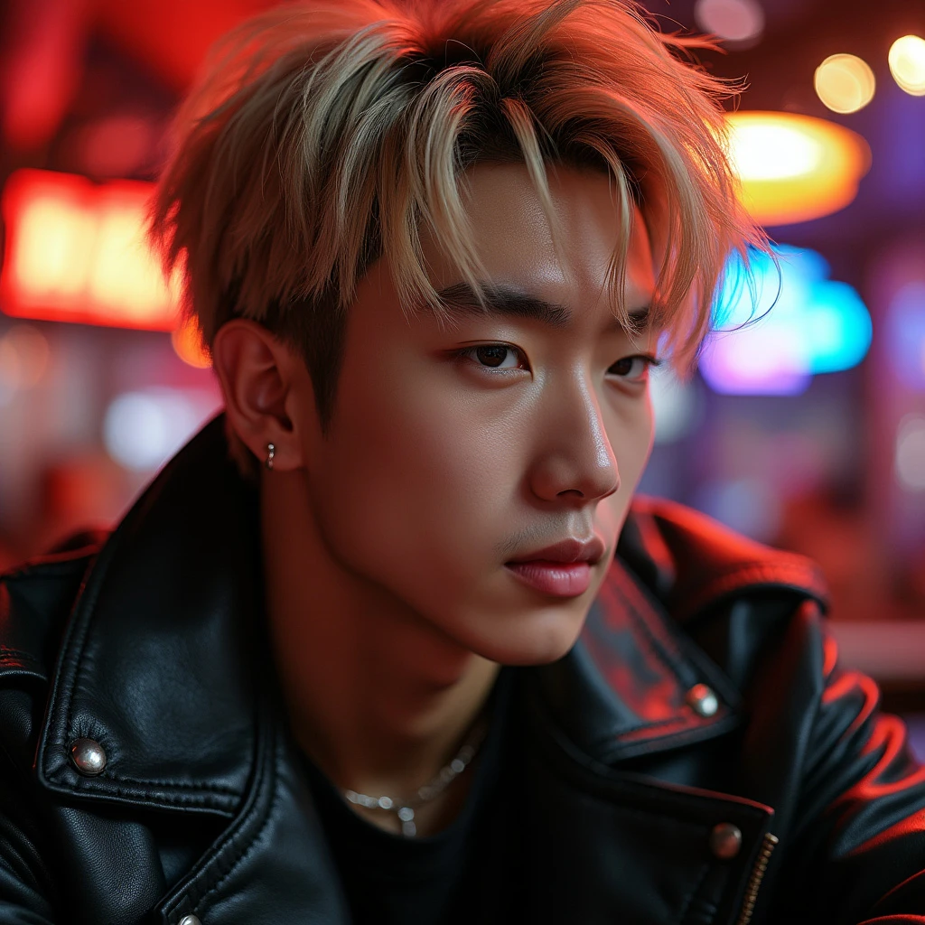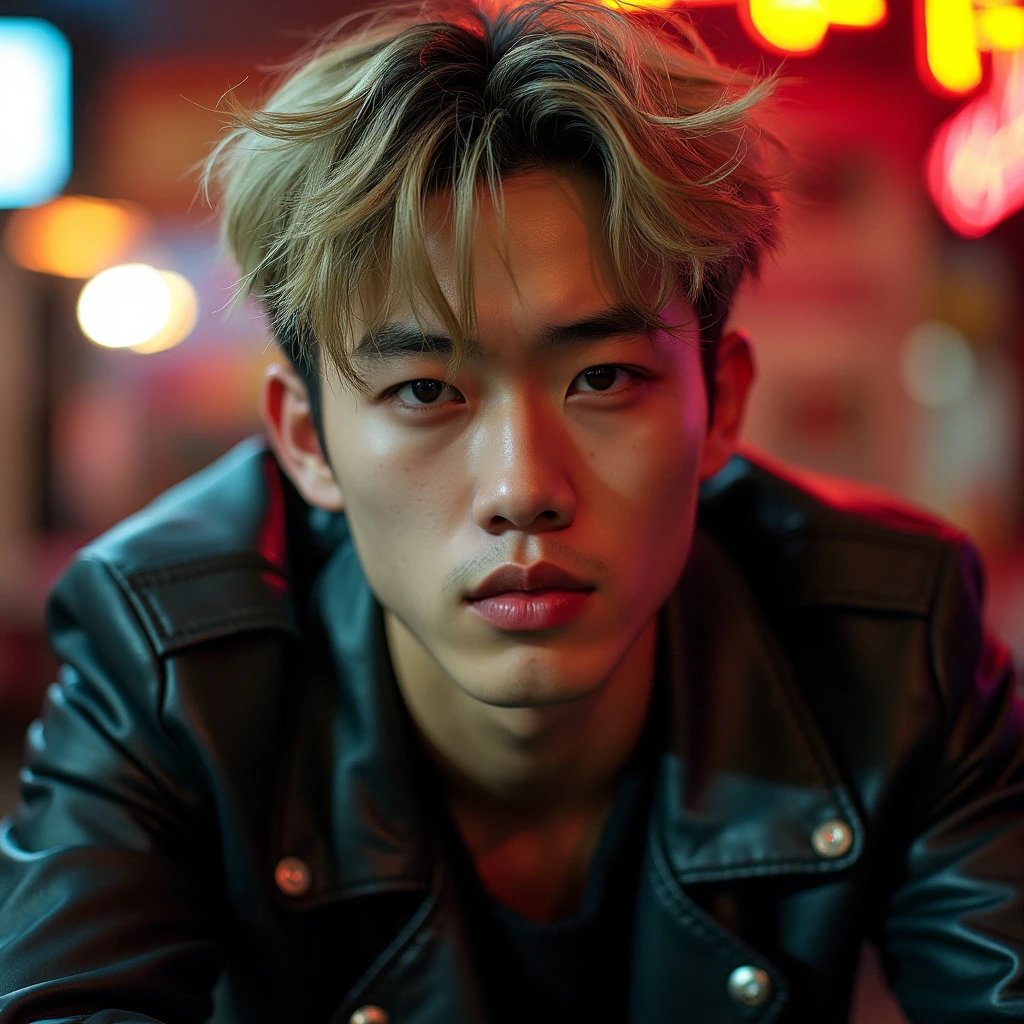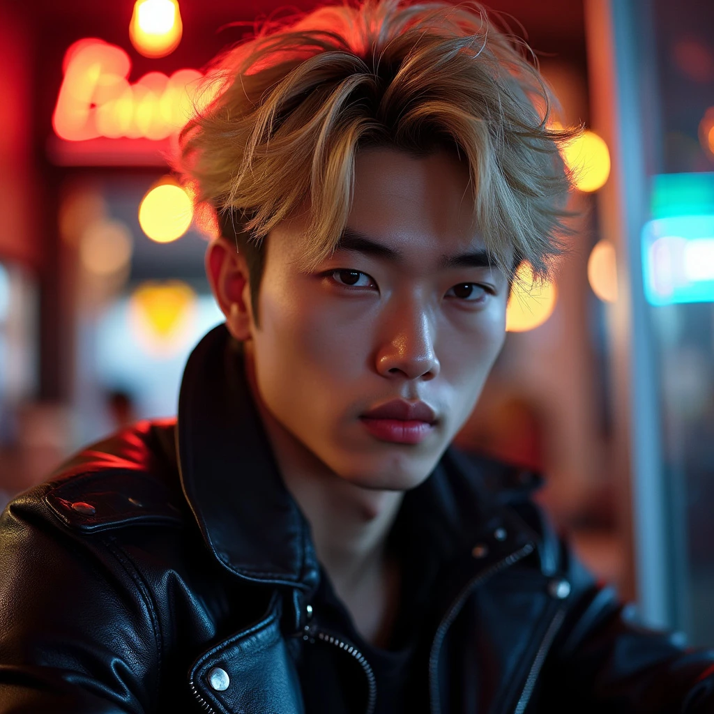 close-up headshot of korean man, 21 years old, rugged but beautiful face, realistic, hyper realistic, ultra-detailed, 8k, Portrait photography, stylized fashion photograph, realism, Super photoreal, hyperreal, photorealistic, he has stylish blond hair with dark roots and messy bangs, he is wearing a black leather jacket, and a confident expression, the background is colorful lights, half lit, bar lighting