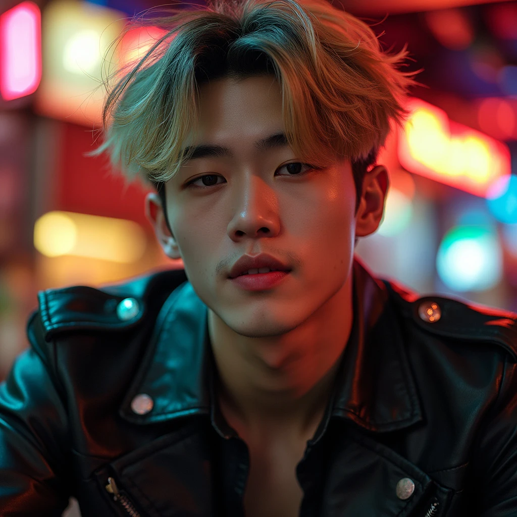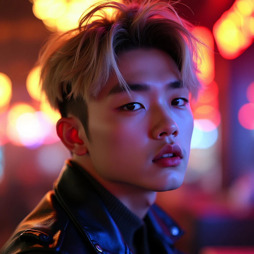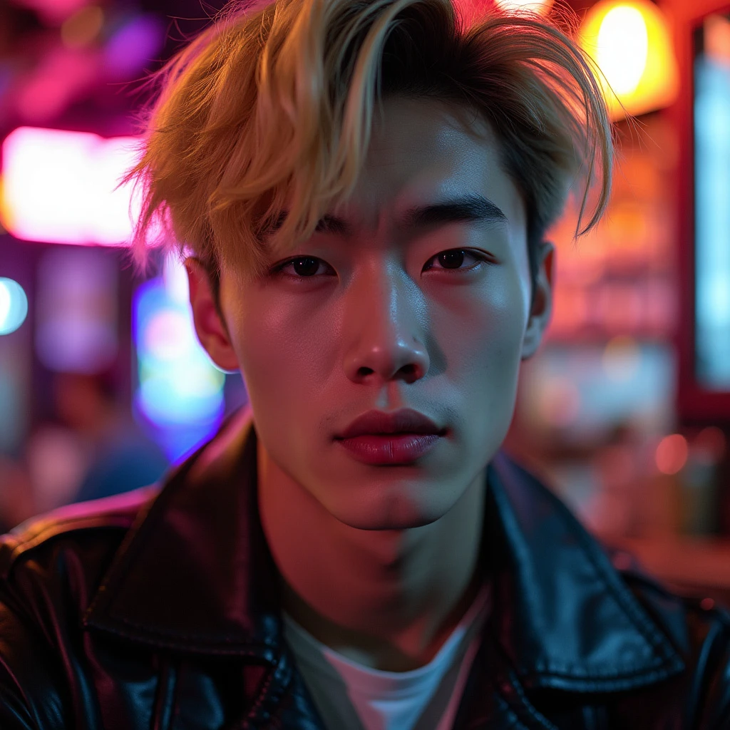 close-up headshot of korean man, 21 years old, beautiful slightly feminine face, big eyes, full lips, realistic, hyper realistic, ultra-detailed, 8k, Portrait photography, stylized fashion photograph, realism, Super photoreal, hyperreal, photorealistic, he has stylish blond hair with dark roots and messy bangs, he is wearing a black leather jacket, and a confident expression, the background is colorful lights, half lit, bar lighting