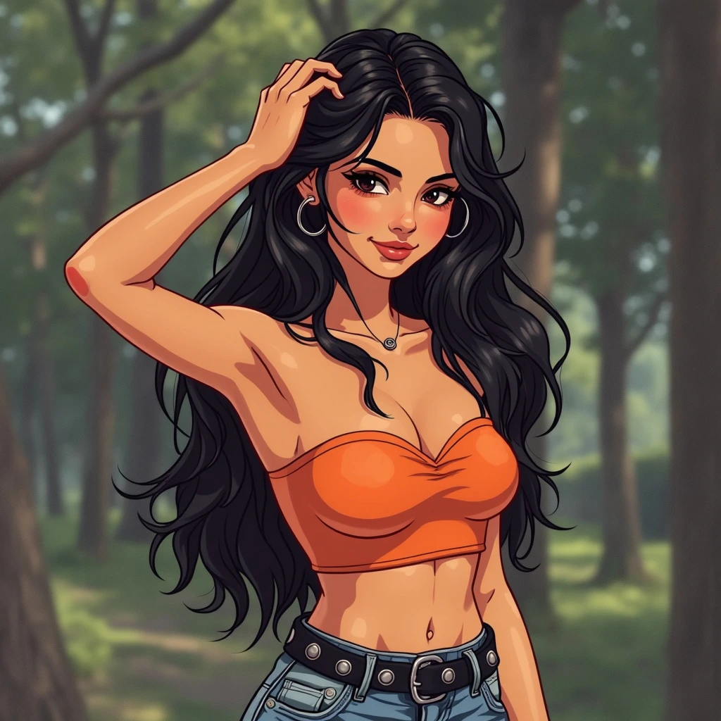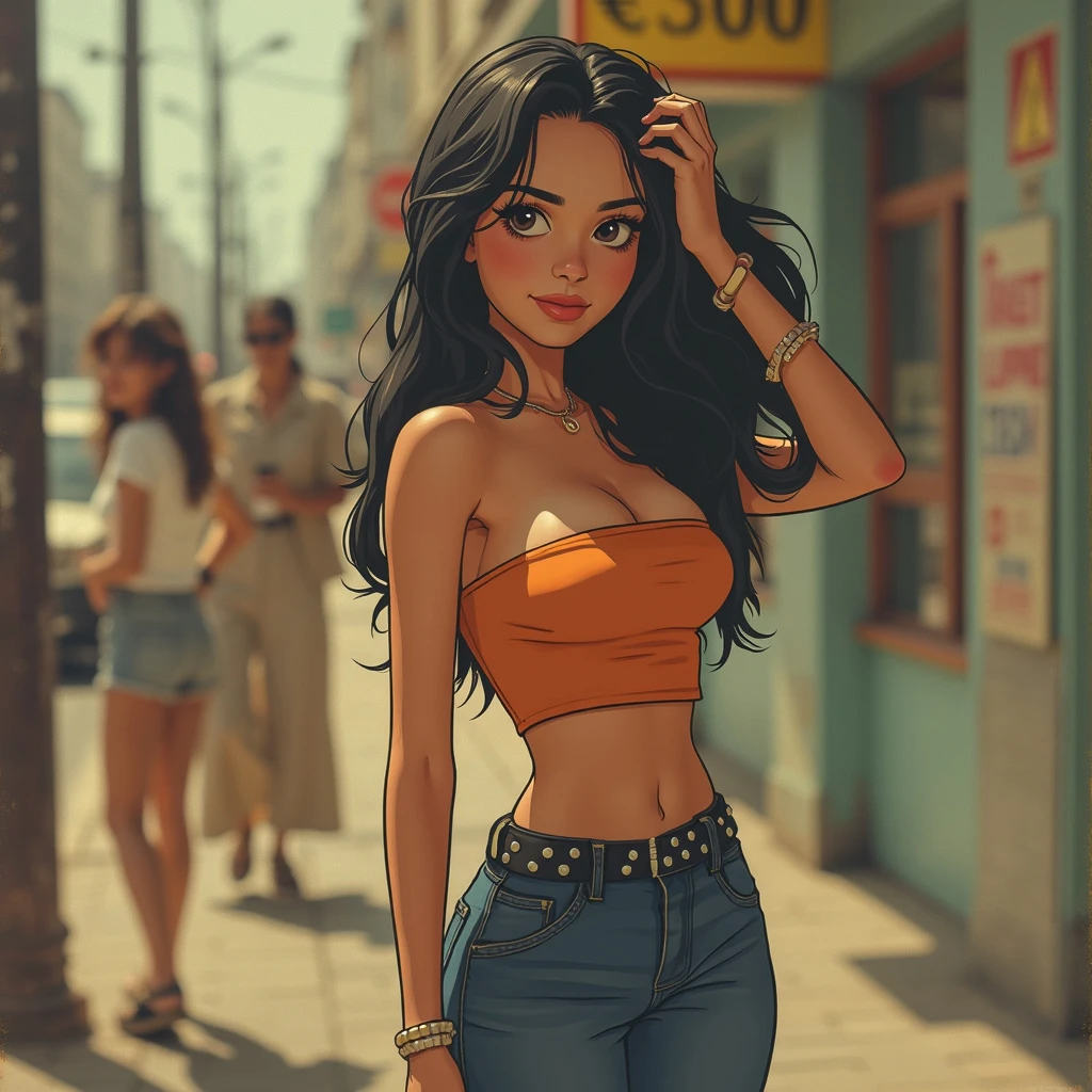 This vintage photo, likely from the 1980s, has a grainy, 1980s aesthetic. It’s a candid snapshot taken with a Kodak EasyShare camera, giving it a blurry, out-of-focus look. The image is slightly out of frame, and the 18 year old girl latina is wearing a orange low cut tube top and tight cinched jeans that accentuate her figure with a black grommet belt with silver holes. She is adjusting her hair.