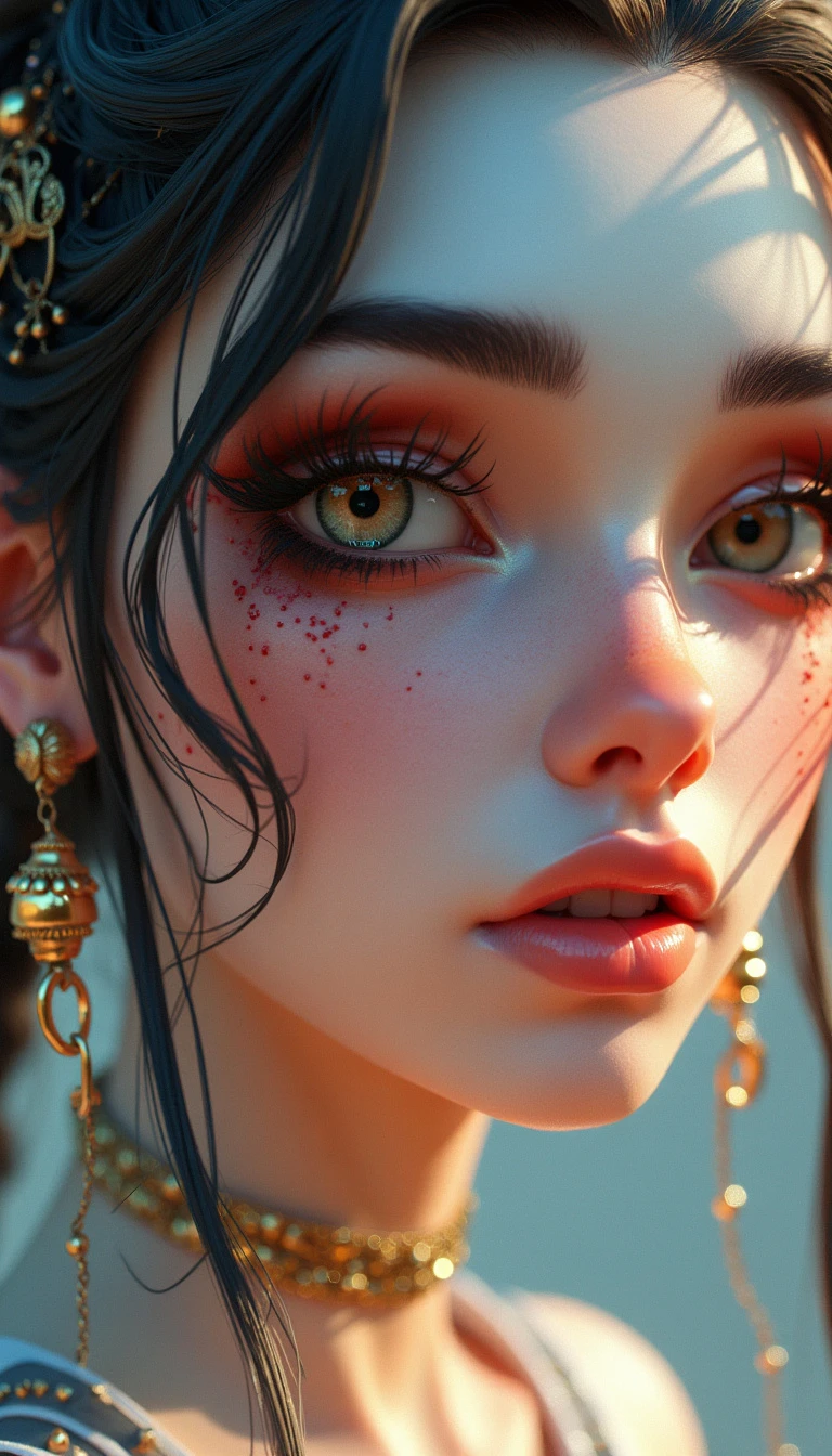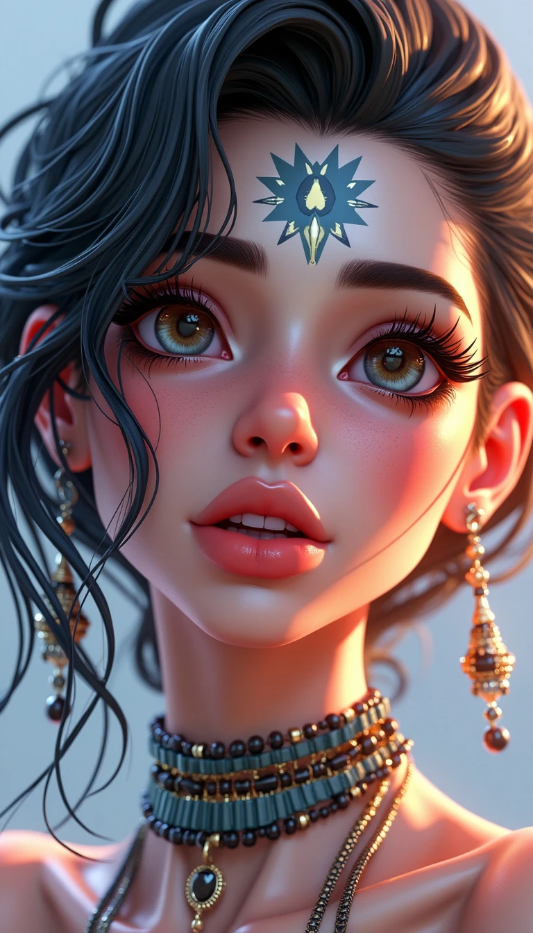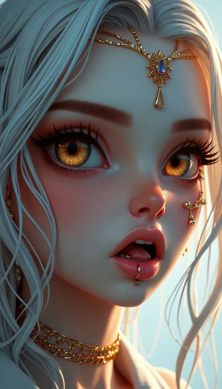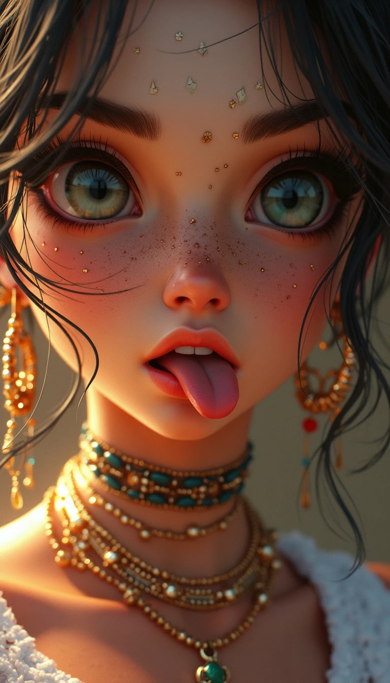 White shiny face skin fancy hairs facial jewelry bad style tanned skin face tattoo on face beauty mark PERFECT MASTERPIECE, EXTREMELY DETAILED CG UNITY 32K UHD QUALITY RESOLUTION WALLPAPER, PHOTOREALISTIC, RAW PHOTO, PERFECT PHOTOGENIC CLARITY, OFFICIAL ART, AWARD-WINNING PORTRAIT, ULTRA HYPER-REALISTIC, ULTRA HYPER-DETAILED, SHINY REALISTIC SKIN, RAY TRACING, UNREAL ENGINE 5.8K, GLOWING AMBIENT LIGHT, Arabian girl face portrait lips bite mouth tongue