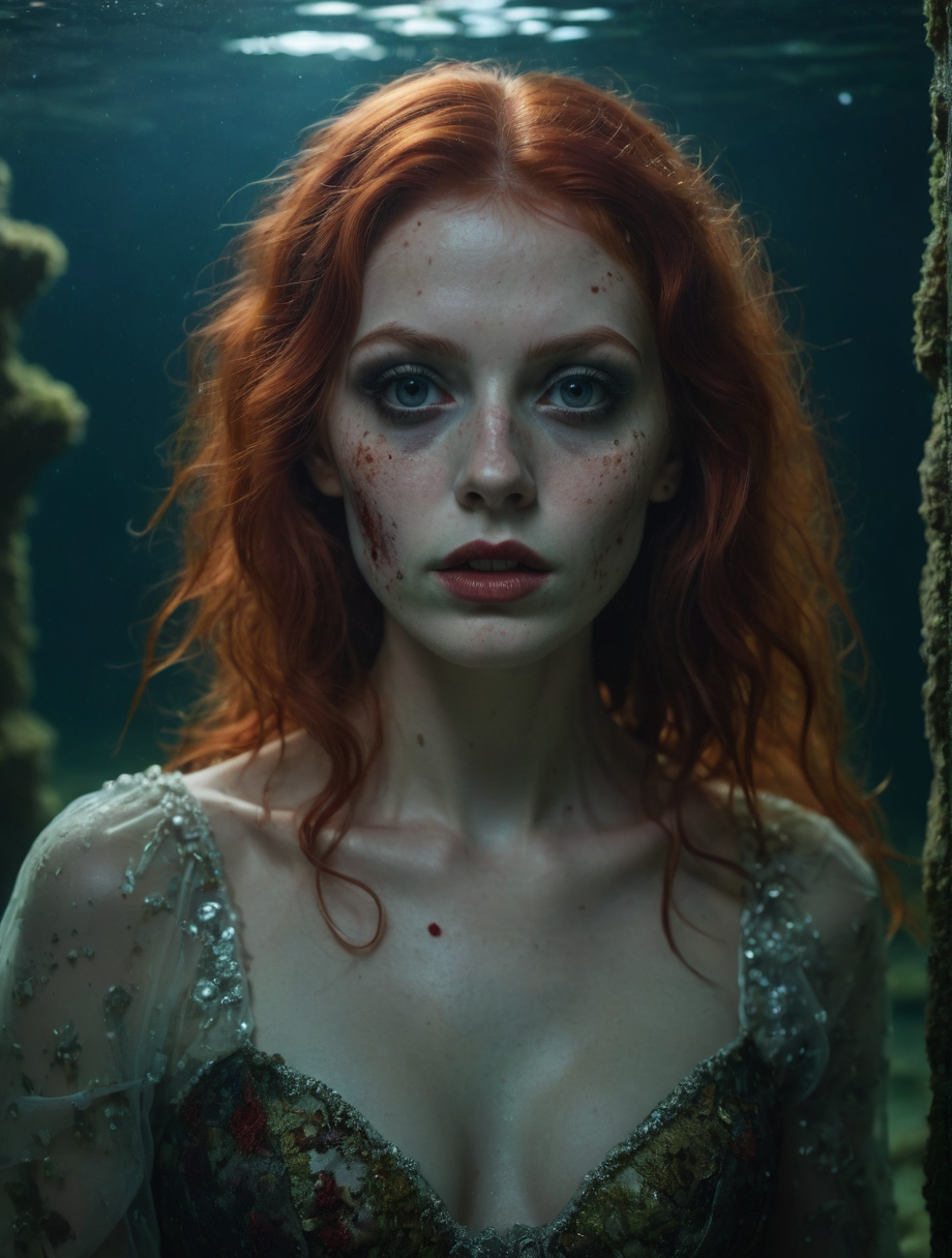 hyperrealistic Underwater glamour portrait of a red hair zombie girl in an underwater graveyard at night, Bioluminescent algae in the sea, freckles, skin pores, pores, velus hair, haute couture bridal dress, macro, extreme details, looking at viewer, big eyes,, shot with a Phase One camera, <lora:add-detail-xl:1>