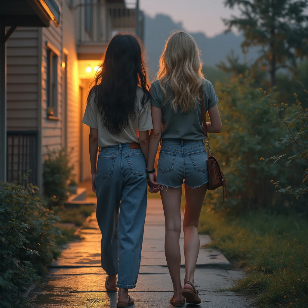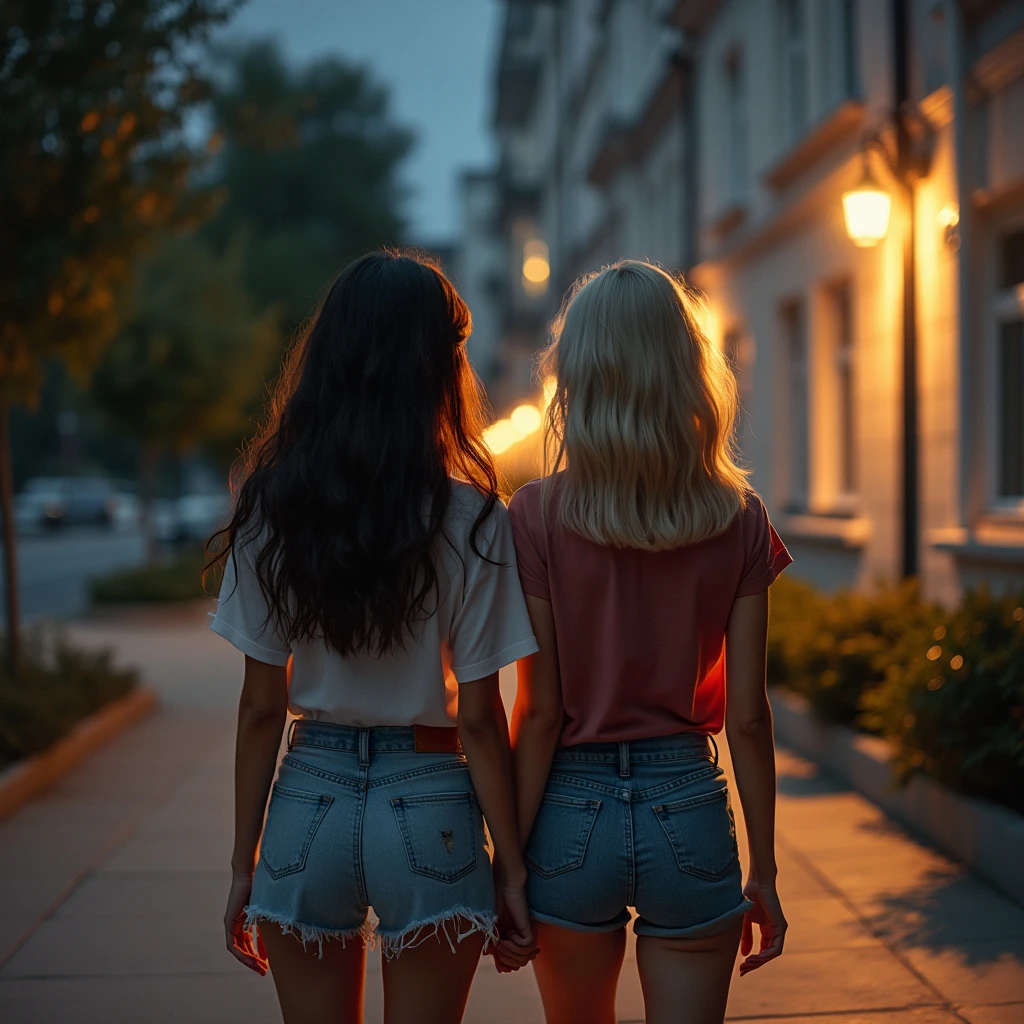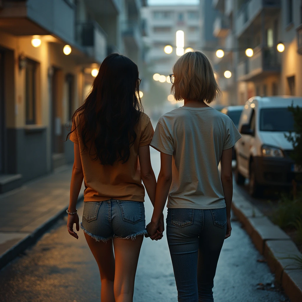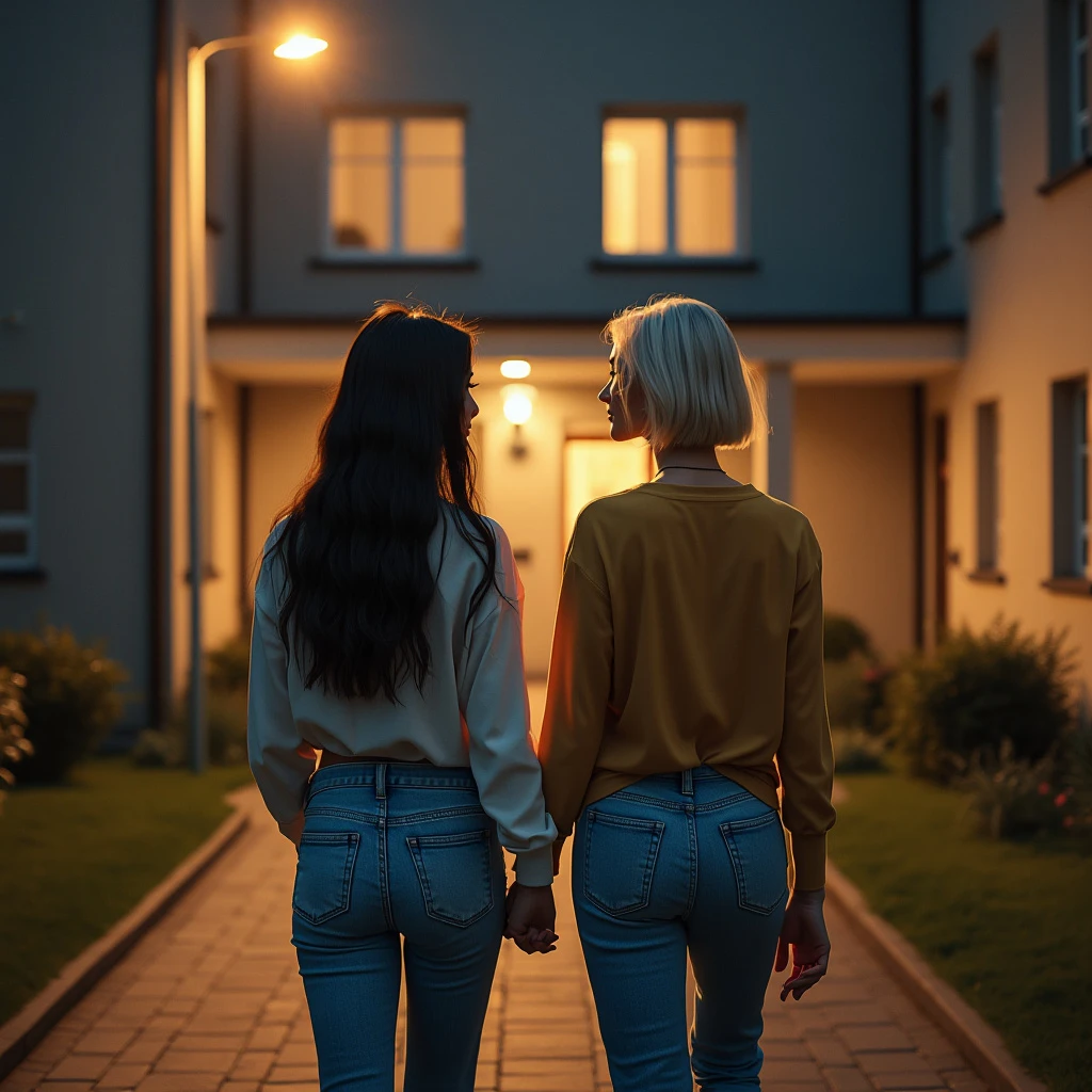 two Beautiful women of about 21 years old, college casual appearance, one has long dark hair, the other has short blond hair, dressed in cute casual clothes, (((full body visible))), walking toward and apartment building, portrait, photograph, detailed skin , realistic, photorealistic, 8k, highly detailed, full frame, RAW color art with high detail, diffuse soft lighting, sharp focus, hyperrealism, cinematic lighting, night time outside an apartment building, the women are holding hands and lean romantically against each other