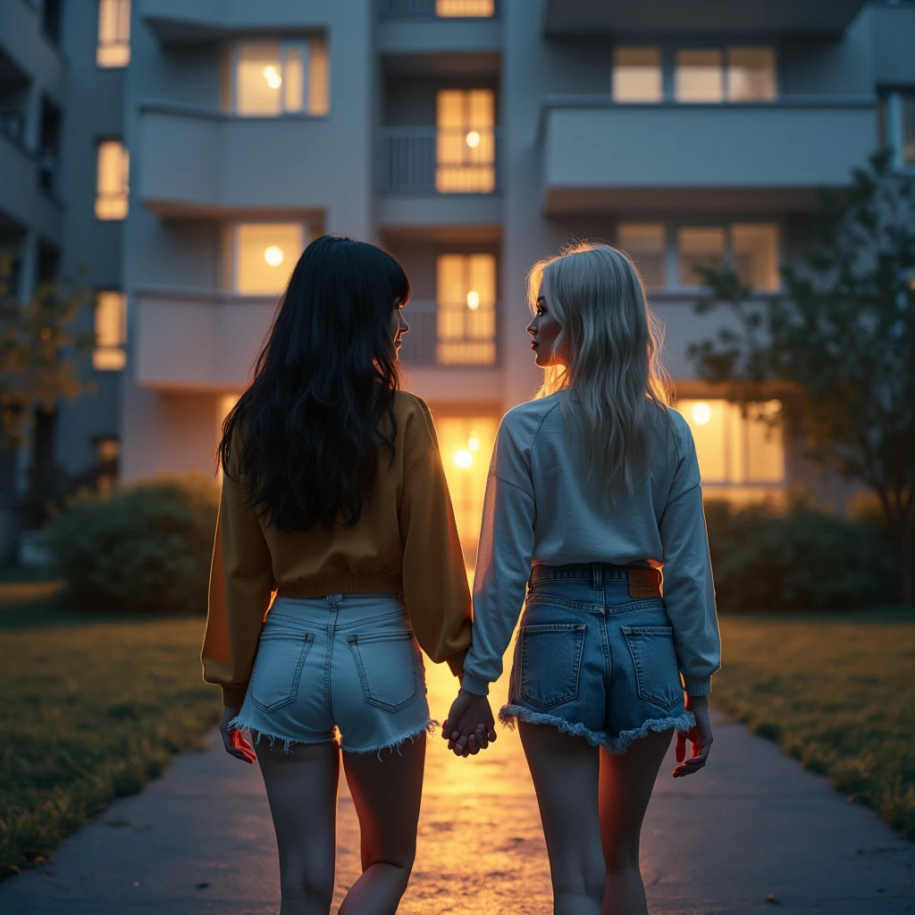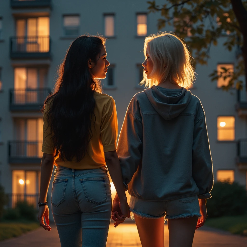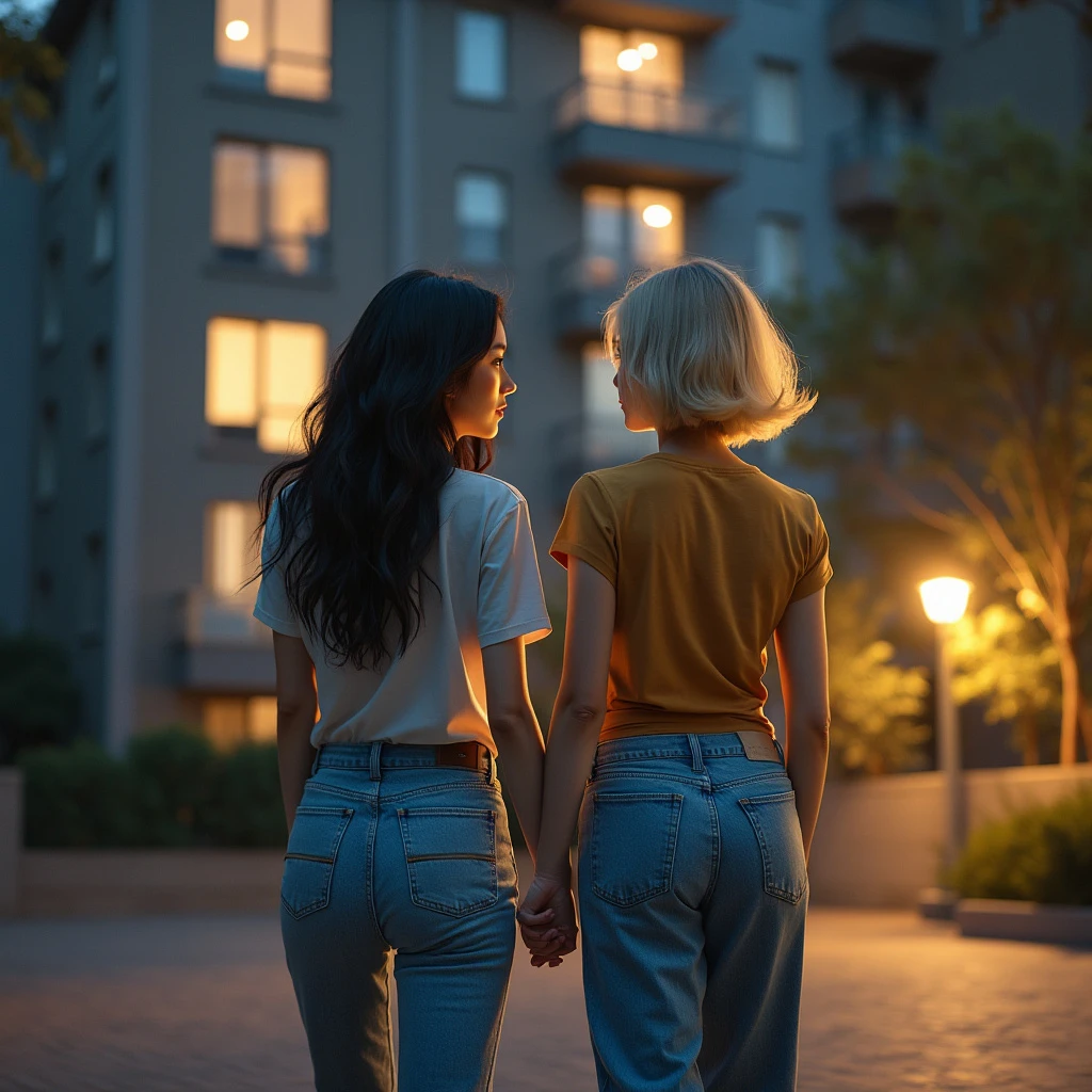 two Beautiful women of about 21 years old, college casual appearance, one has long dark hair, the other has short blond hair, dressed in cute casual clothes, (((full body visible))), walking toward and apartment building, portrait, photograph, detailed skin , realistic, photorealistic, 8k, highly detailed, full frame, RAW color art with high detail, diffuse soft lighting, sharp focus, hyperrealism, cinematic lighting, night time outside an apartment building, the women are holding hands and lean romantically against each other, they are looking at one another