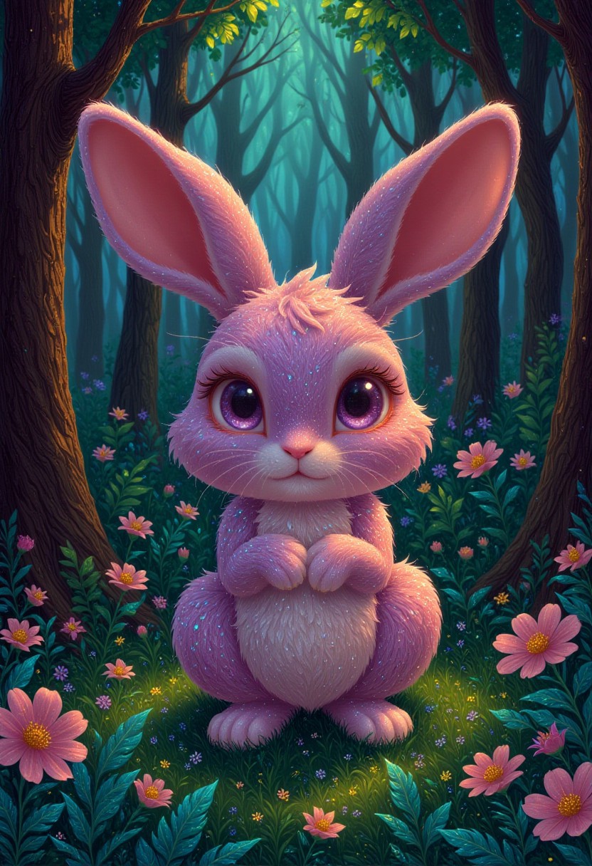 cute bunny in forest, large eyes, sympathy look in eyes, begging, night time