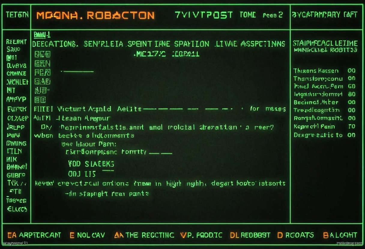 Retro-UI, 7-Vectors, retro-futuristic aesthetic, nostalgic vibe, high-contrast lighting, centered composition, straight-on camera angle, minimalist background, moody atmosphere, green-on-black, inspired by 80s sci-fi, diagnostic screen for repairing robots, key components are highlighted in orange, text list, mechanical parts, outline of robotic body, robotics, Decepticon