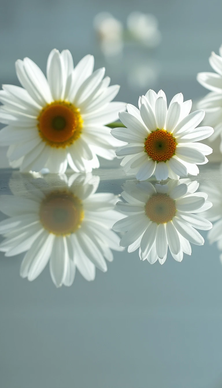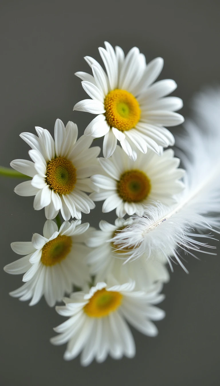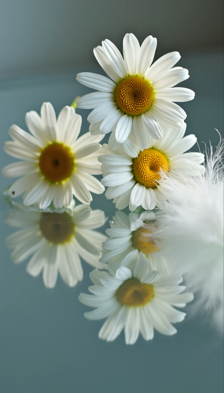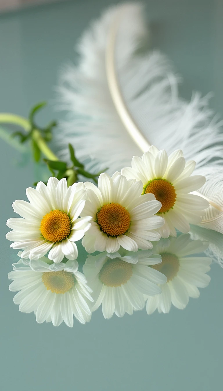 a serene, close-up shot captures three white daisies and a feather delicately arranged on a reflective surface. the daisies, positioned on the left side of the frame, are adorned with yellow centers and white petals. their reflection is clearly visible in the lower right corner of the image, adding depth and dimension to the composition. the feather, positioned on the right side of the frame, is a pristine white, with a delicate texture that hints at its feather-like nature. it is reflected in the lower right corner of the image, adding a touch of realism to the scene.