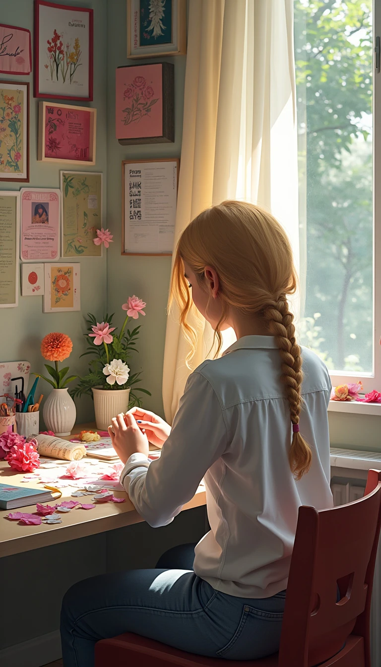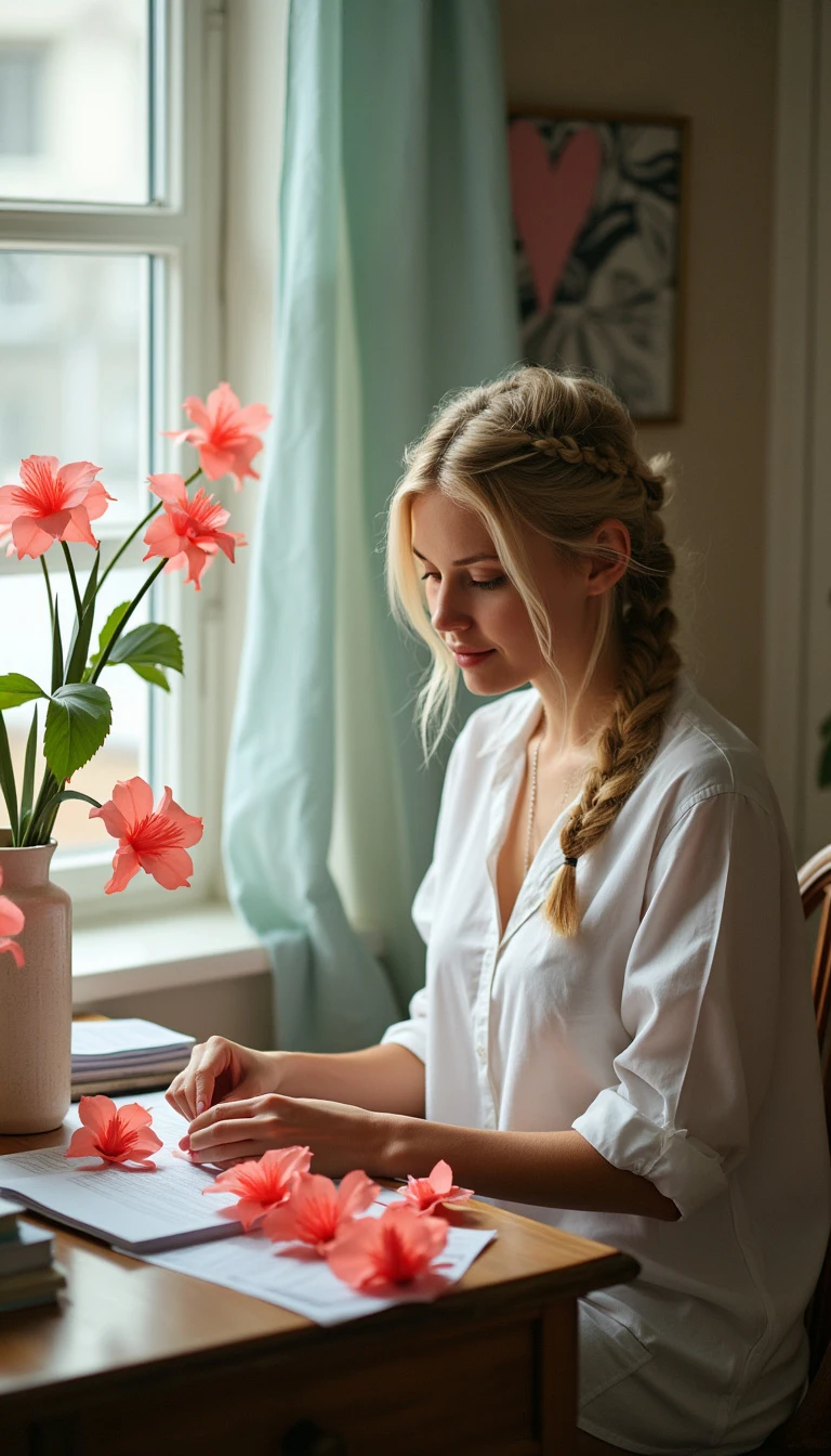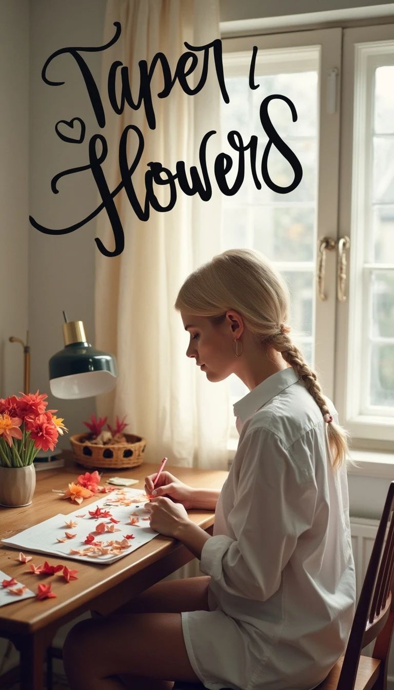 Graffiti style following text: "Paper flowers", above text a blonde woman sitting at the desk of her bedroom, the desk is beside the window, she's wearing a white shirt and her hair is braided, she's doing origami and has made multiple paper flowers,