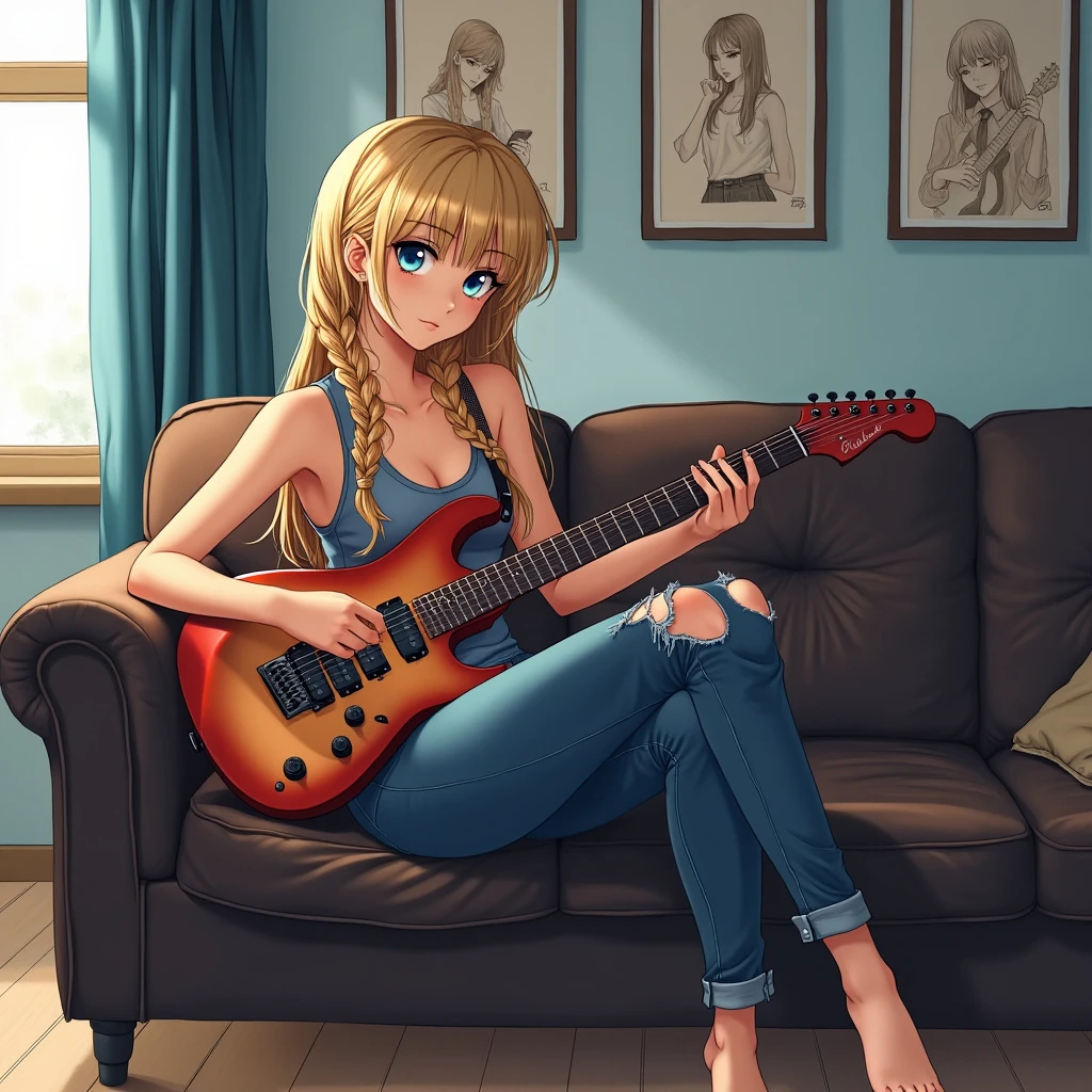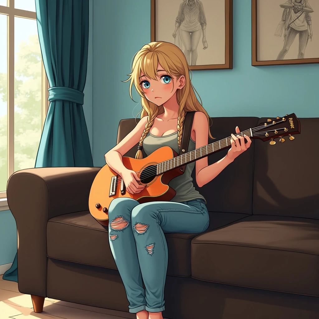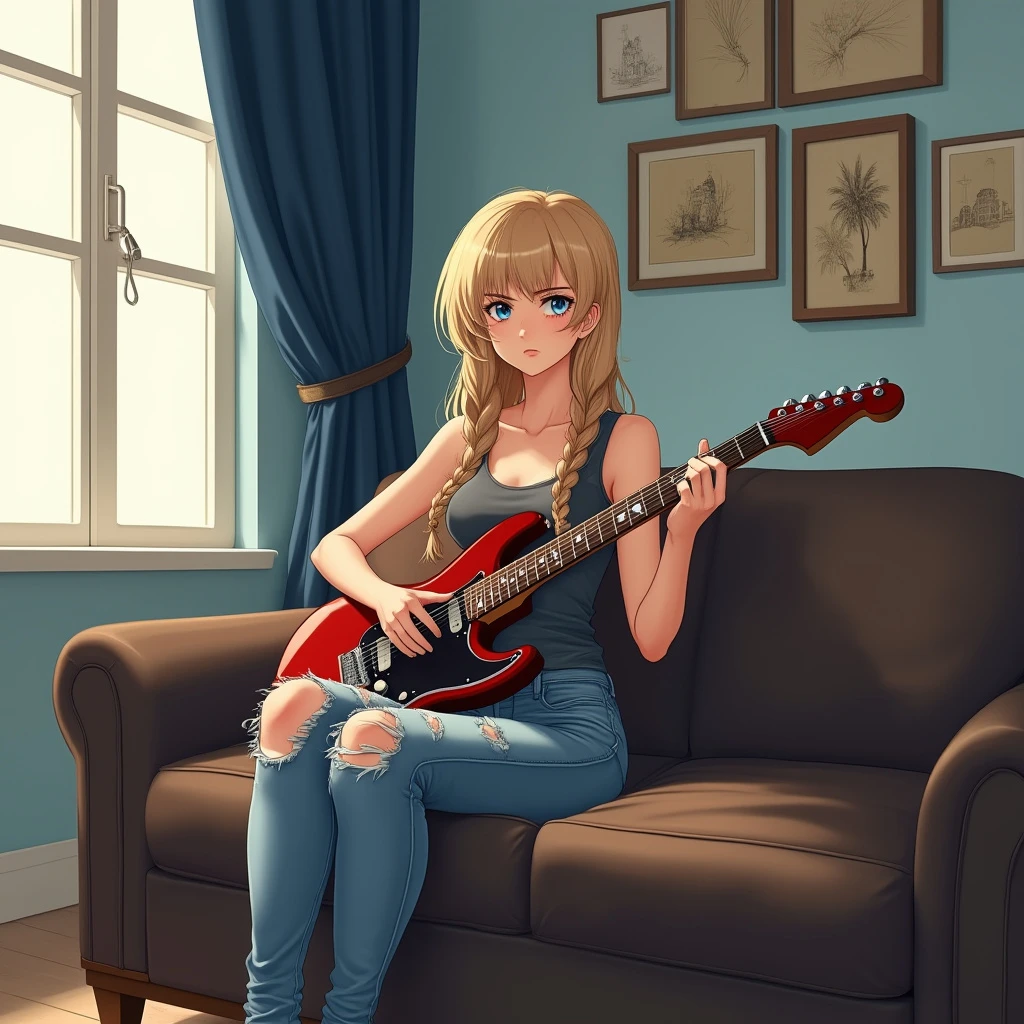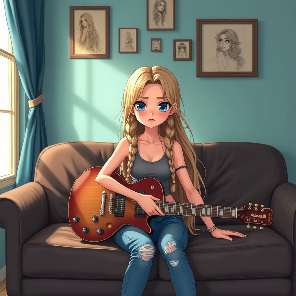 a photograph of a beautiful woman about 19 years old with long dark blond hair and blue eyes, she is sitting on a sofa holding an electric guitar, she's wearing a sleeveless top and a pair of jeans with rips in them, the sofa is dark brown leather and is in front of a pale blue wall with framed sketches hanging on it, the room is lit from the left by a large window with dark blue curtains, the floor is a pale wood, the girl is looking directly at the camera with an expression of disappointment, the girl has tight braids on the left side of her hair