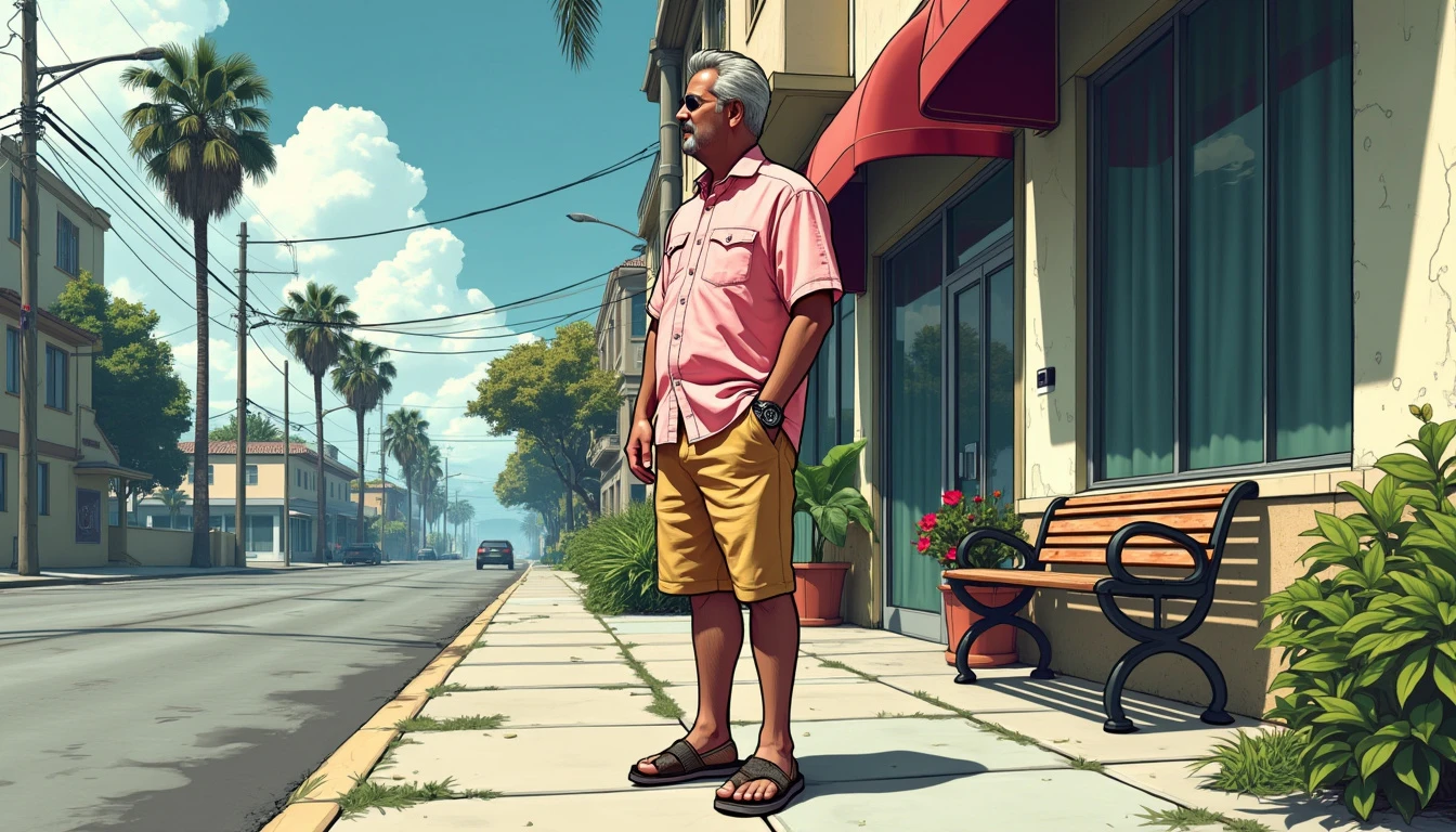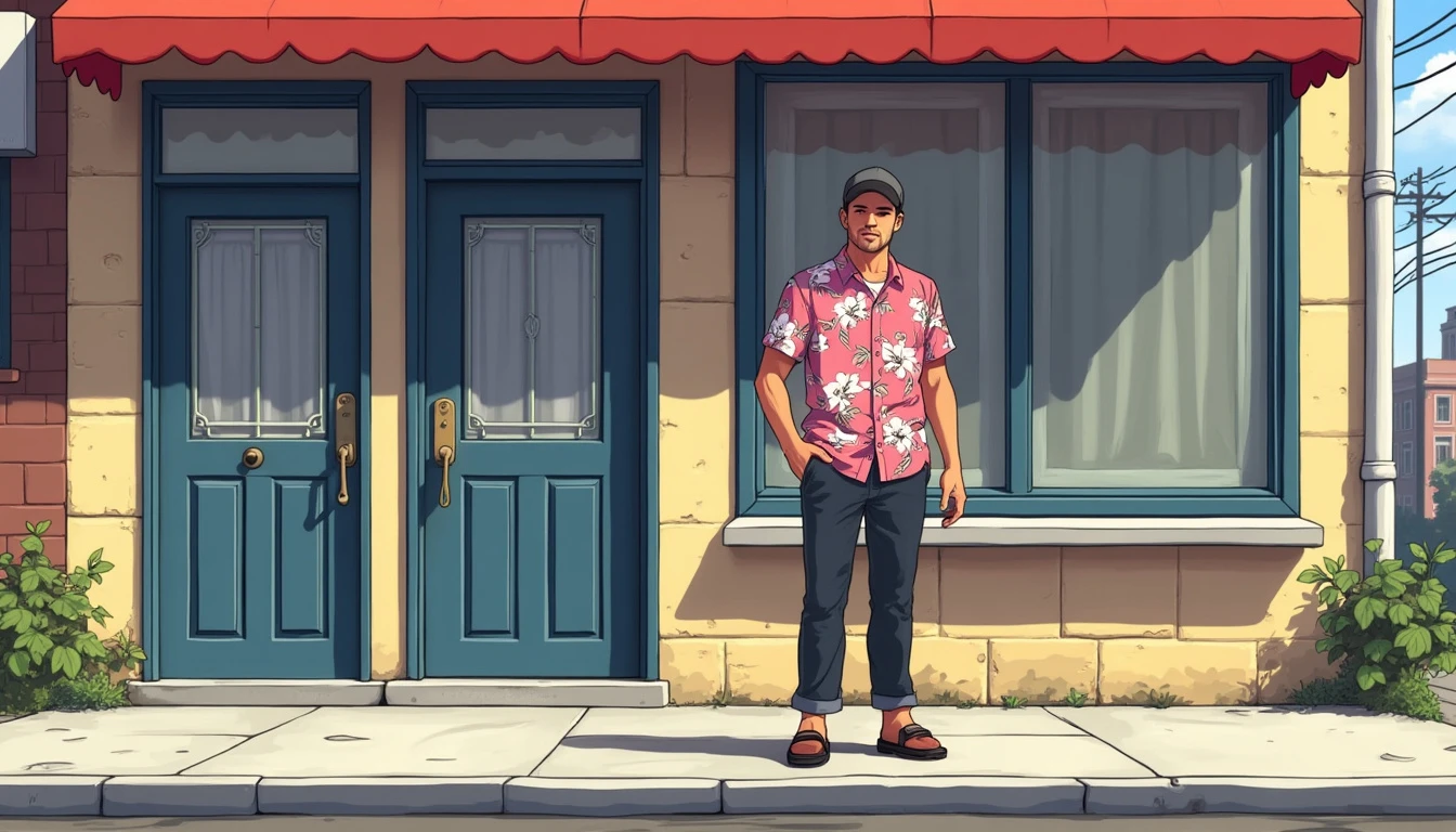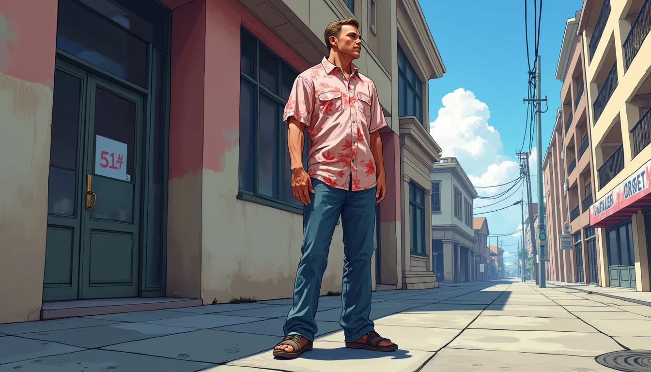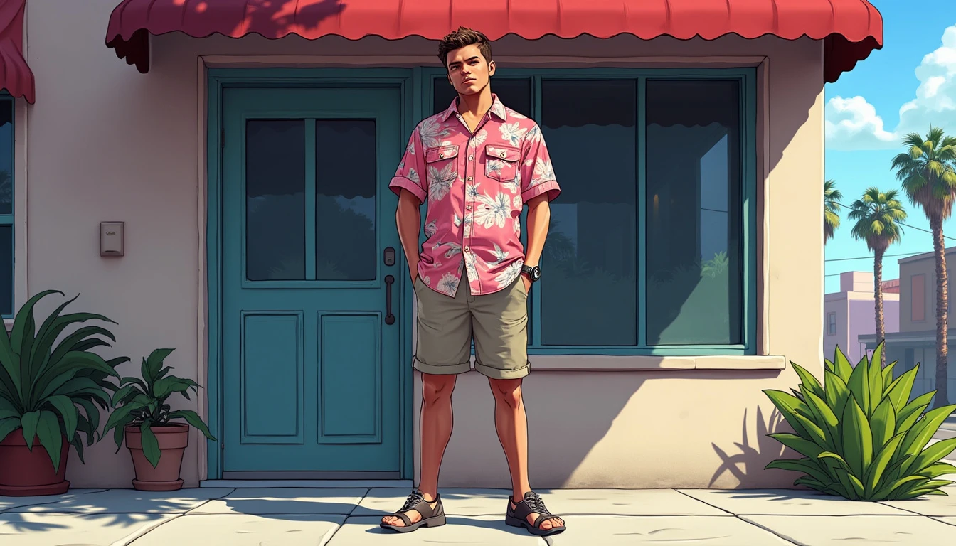 GTA 5 STYLE 1 20 year old boy standing on a sidewalk in front of a building, full body photo, with Hawaiian shirt, Profile photo, posing ready for a fight, profile photo 1024px, frontal pose, full body photo of Steve, full-length photograph, taken in early 2020, full-length portrait photo, Waring a very faint pink Hawaiian shirt