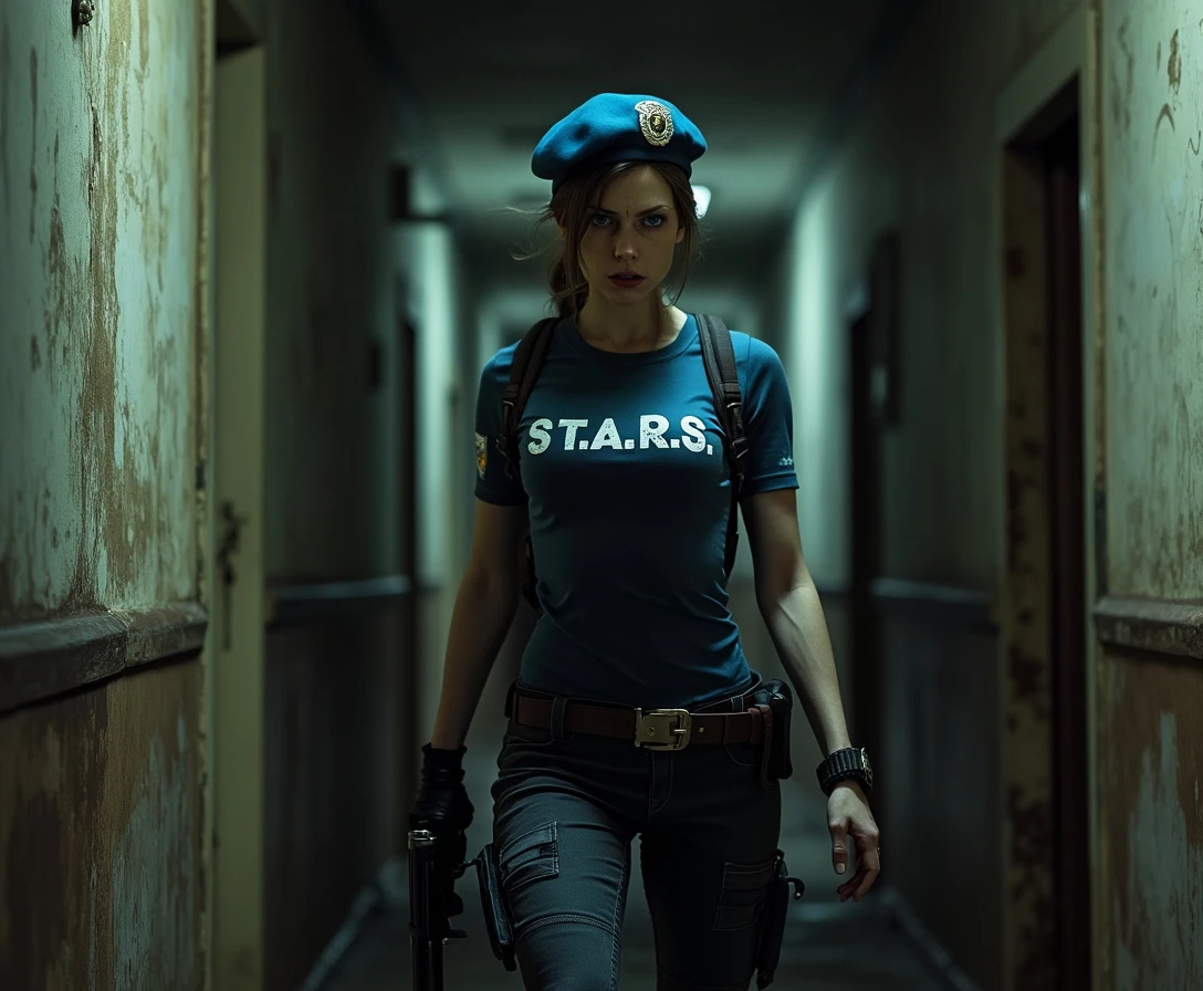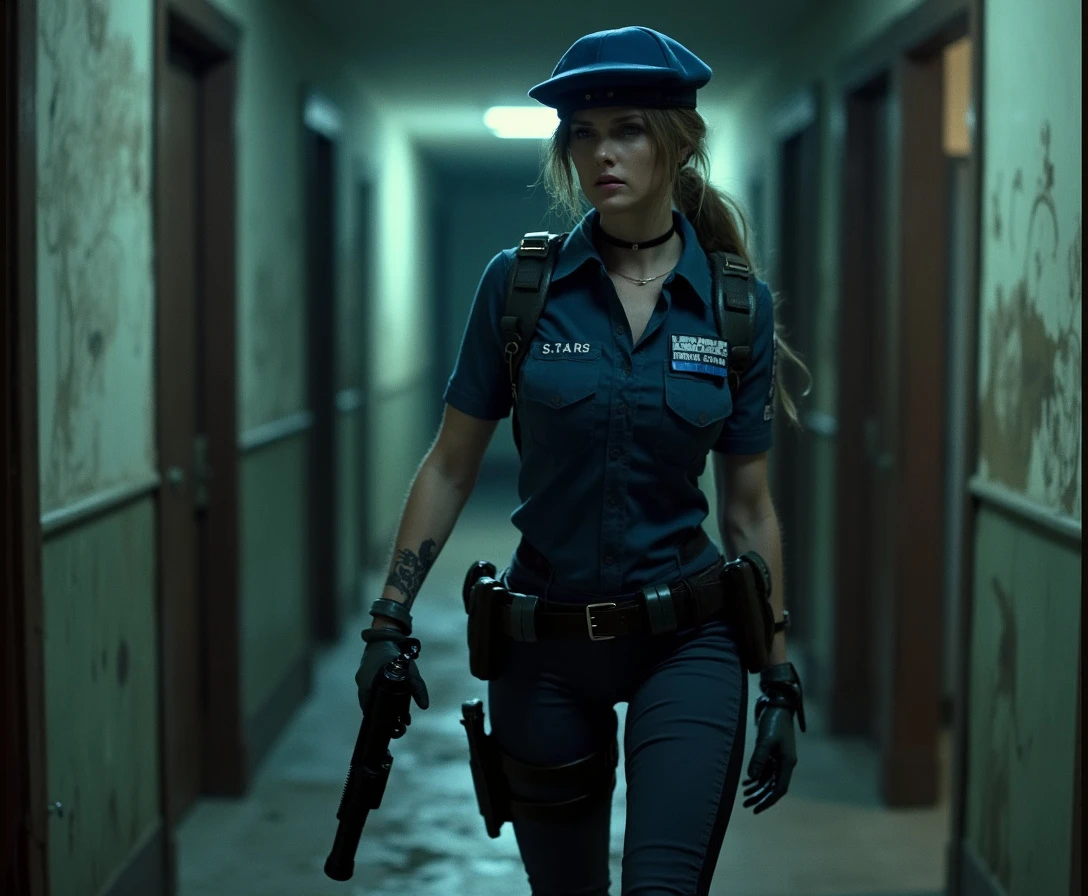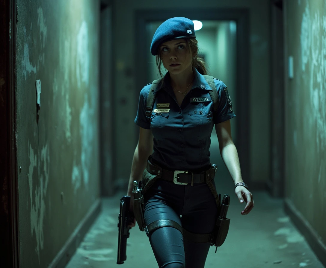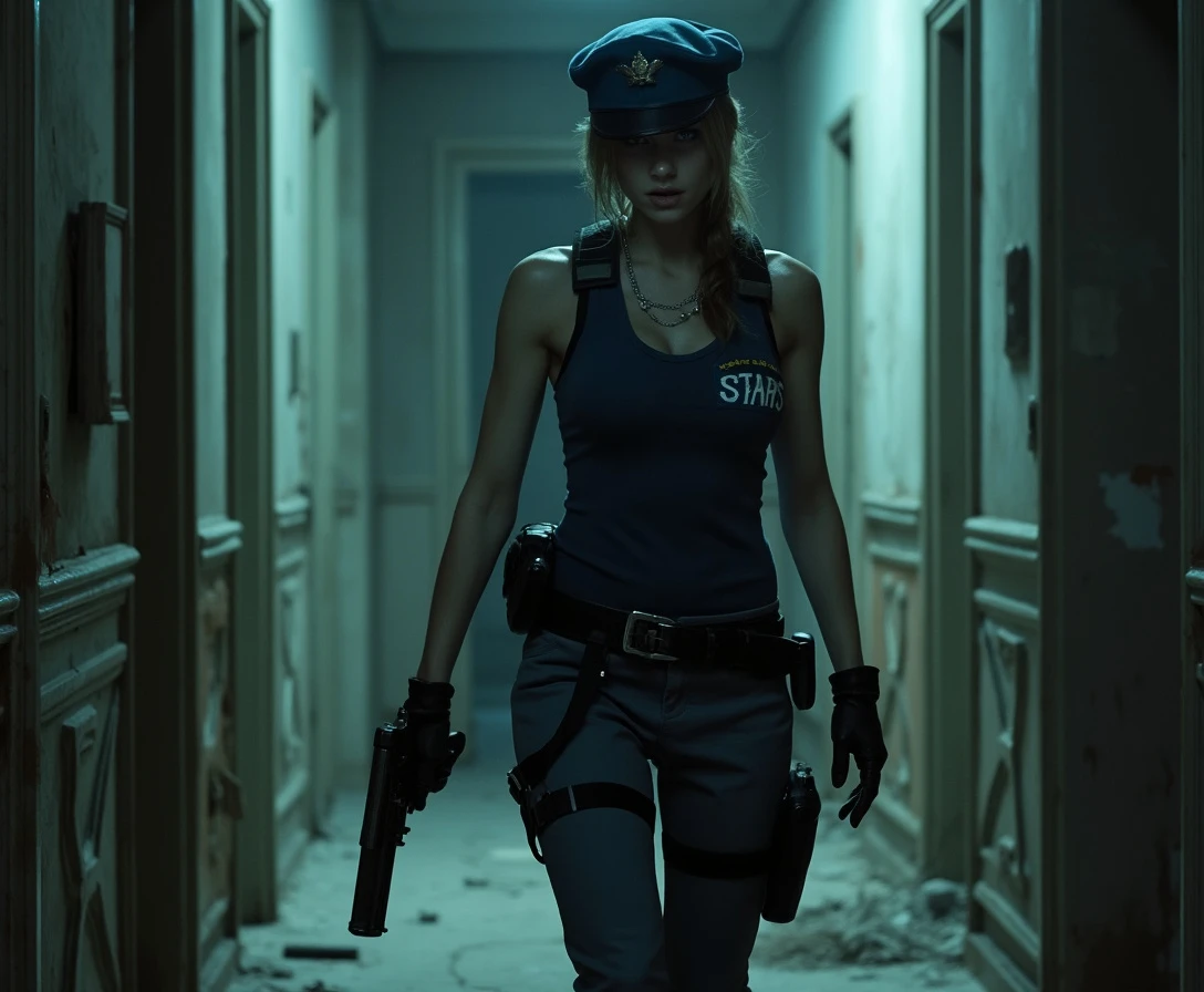 Jill Valentine from Resident Evil walking through the abandoned corridors of an old mansion at night. She is wearing her "S.T.A.R.S." police uniform and a blue beret on her head. She is holding a gun in her hand and she looks scared. Cinematic style, ultra realistic, medium shot