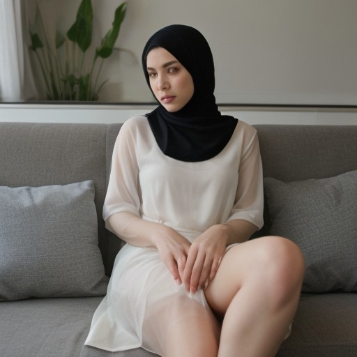 A hijabi woman is wearing a long transparent dress and is sitting on the couch, her sexy legs are exposed because of the way she sits, creating a sexy image