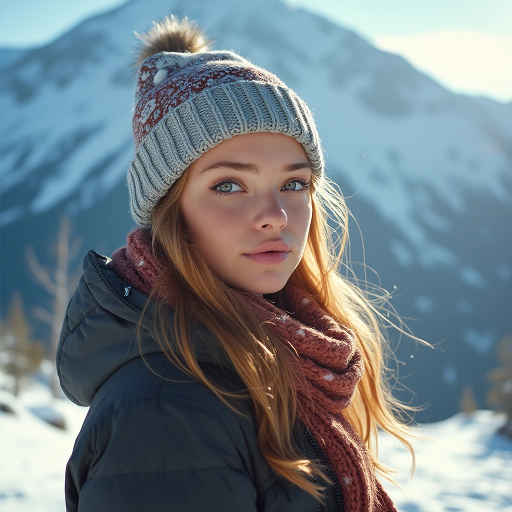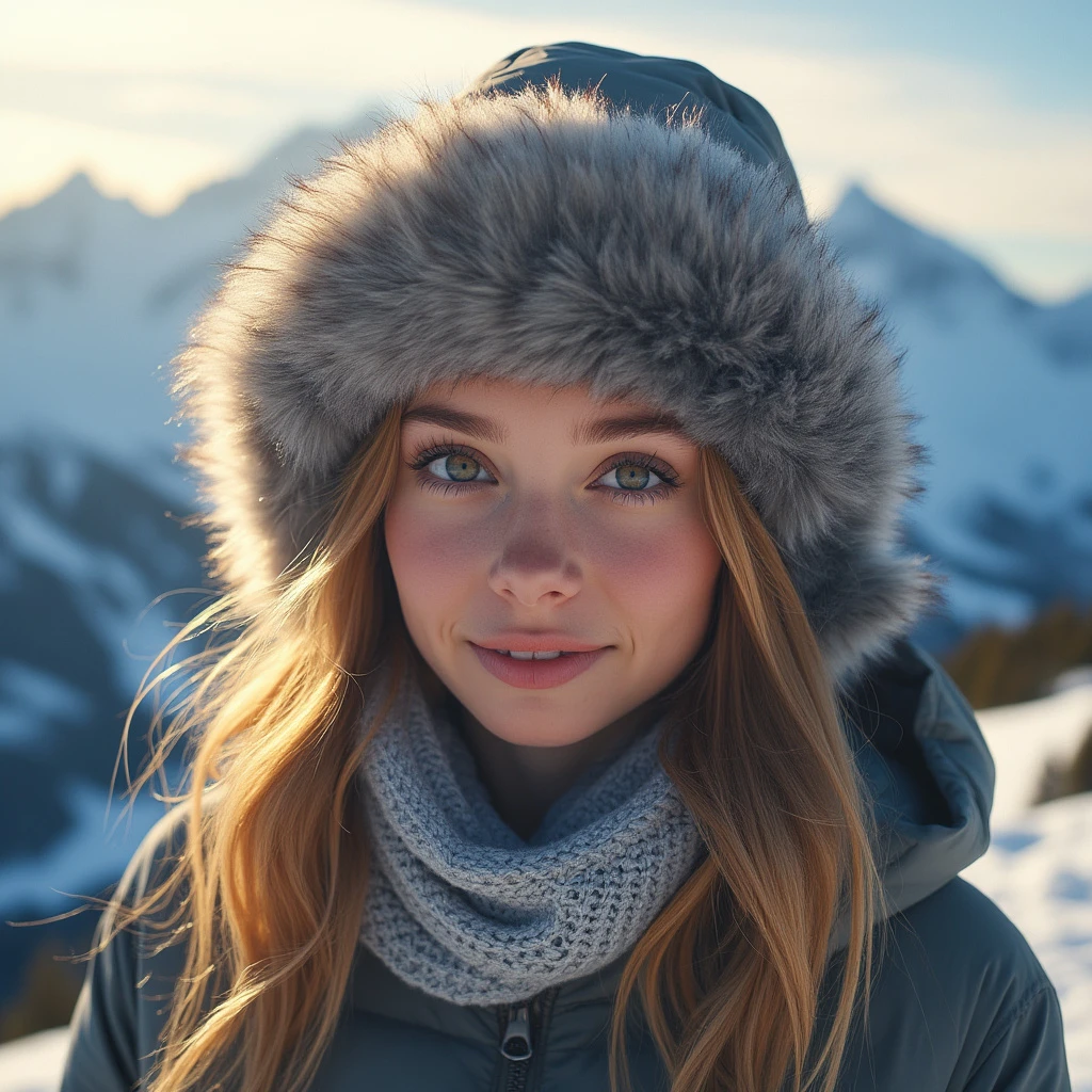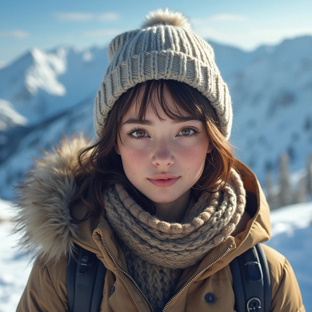 A 24 year russian girl with a serene expression stands proudly atop a majestic snow-covered mountain, bundled up in warm winter clothes to shield against the chill. Their face with pale skin, illuminated by the brilliant sunlight on this beautiful day, captivates the viewer with its genuine beauty. This stunning photograph, taken with a Fujifilm XT3 camera, captures every intricate detail of their features in astonishingly high resolution – an impressive 8k UHD RAW photo. The image carries a subtle touch of film grain, lending it a nostalgic feel. With a direct gaze into the camera, it brings forth a remarkable sense of intimacy and connection.
