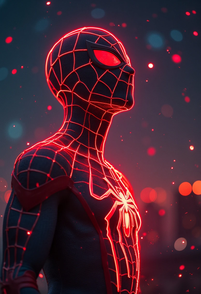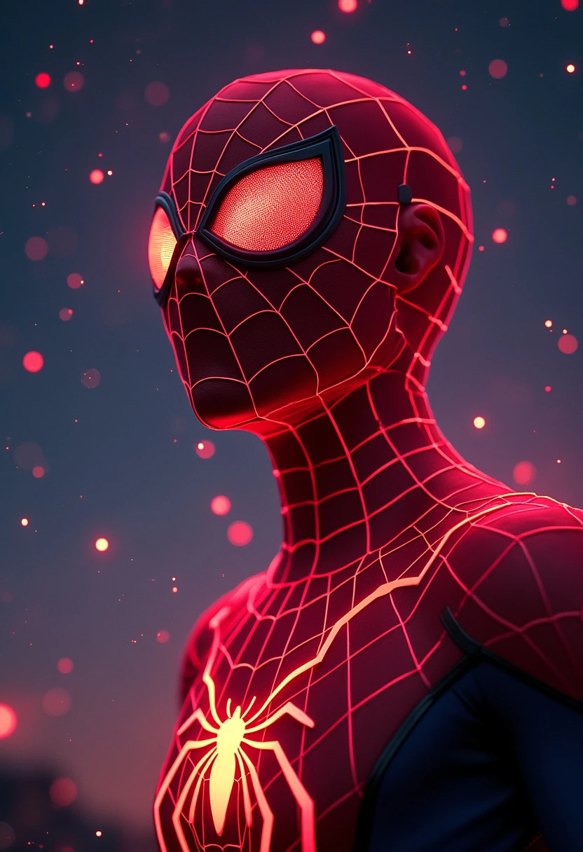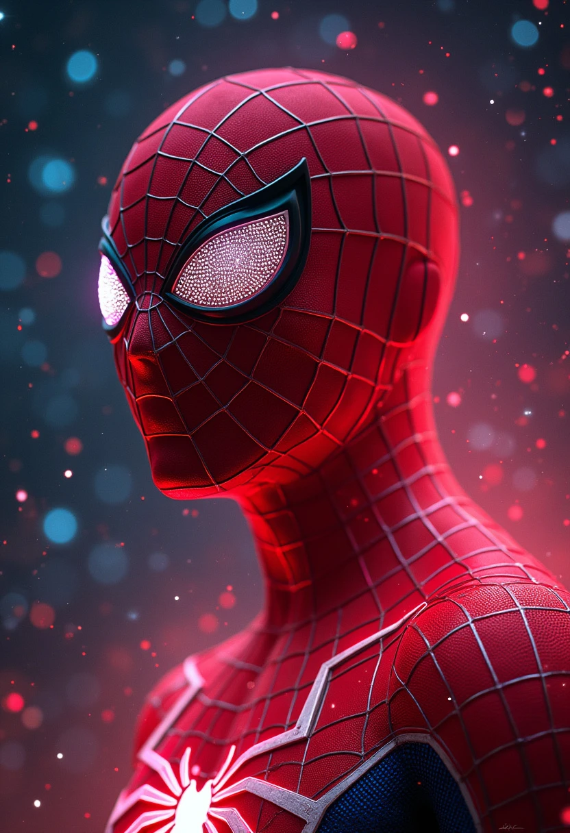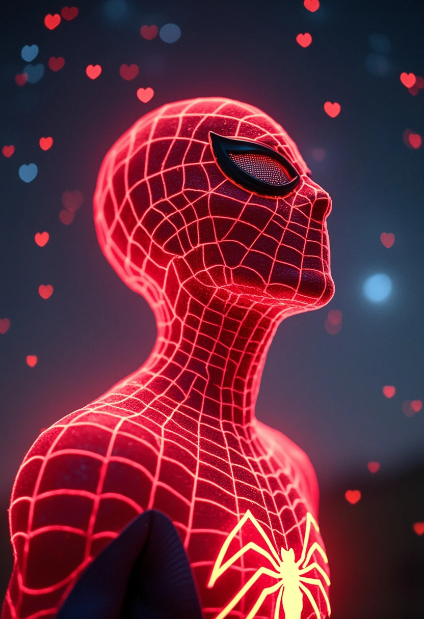 Red fluorescent art, sky full of stars, close-up of Spiderman, white silhouette, ethereal feeling, artistic feeling, stars around