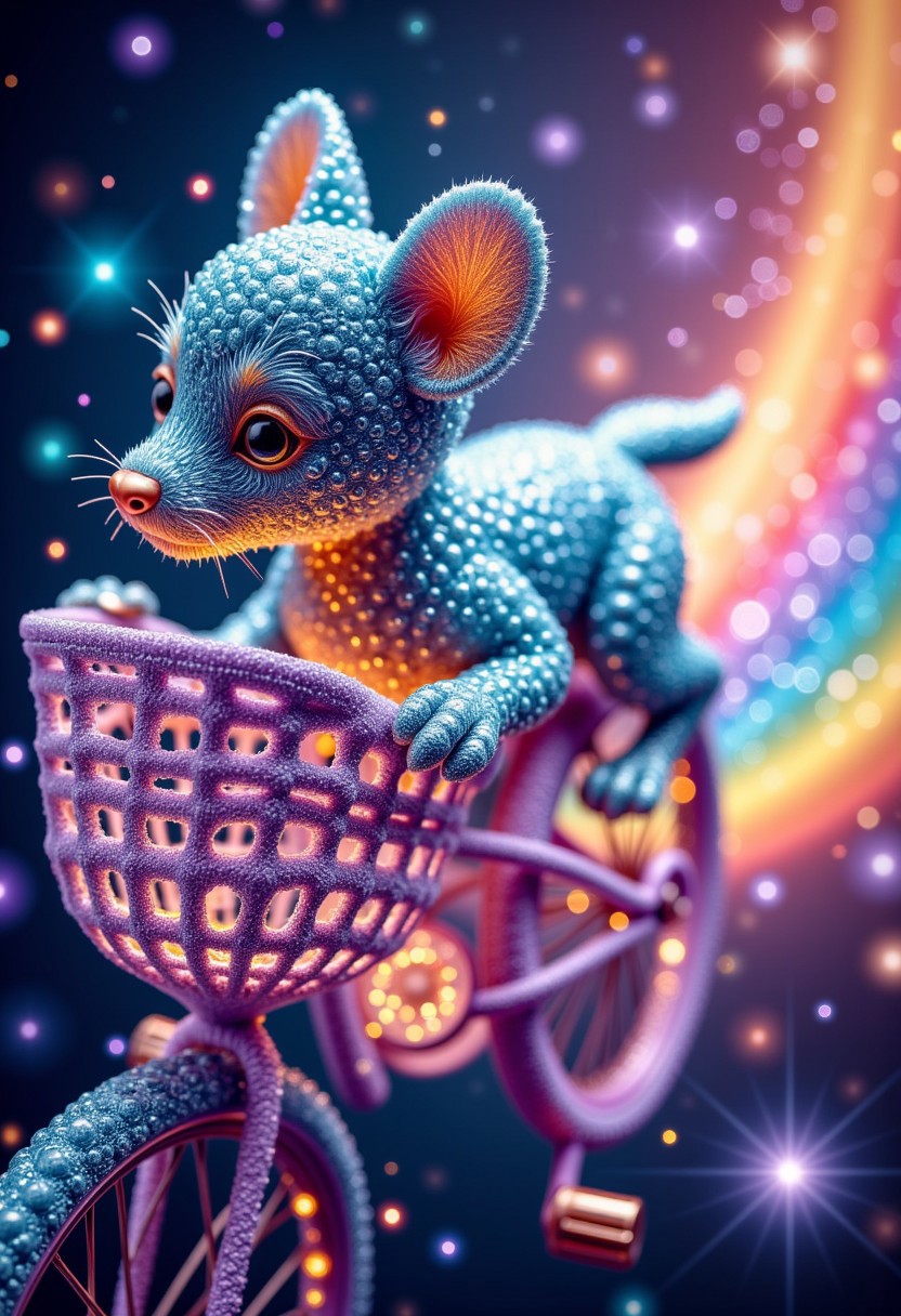 made of crystal, A blue and orange striped puppy inside of a purple bicycle basket flying through rainbow space, puppy eyes, leaving a sparkly trail, viewed from side, best quality, masterpiece,