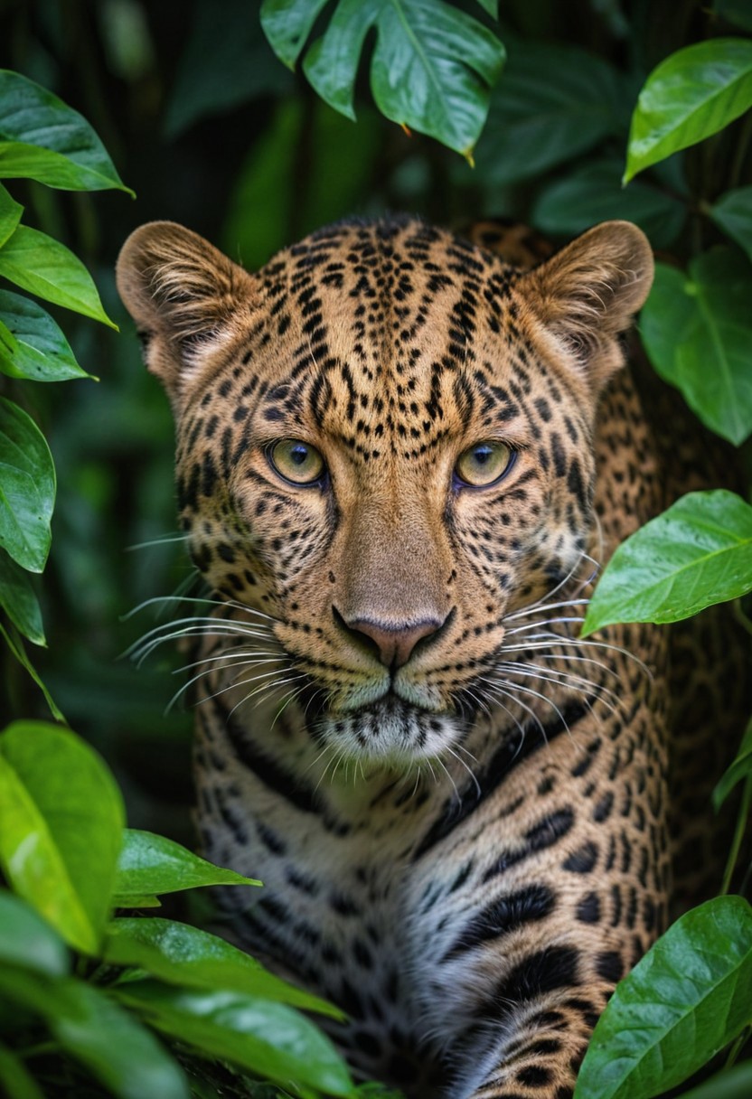 A leopard hiding in the jungle, a photo-realistic portrait, captured with a Canon EOS R5 camera and a macro lens for detailed wildlife portraits. The high-resolution, HDR image has a National Geographic-style aesthetic.