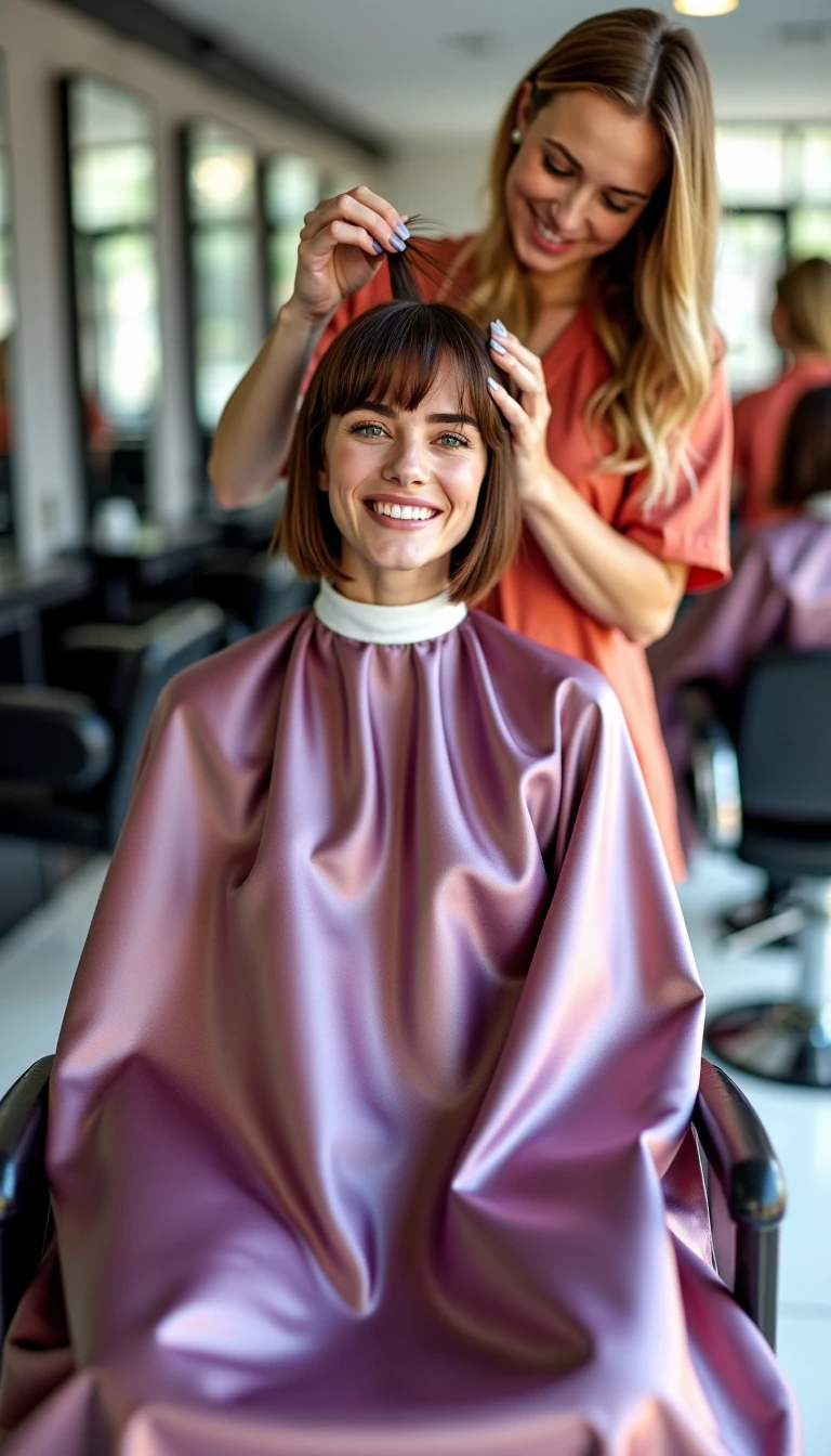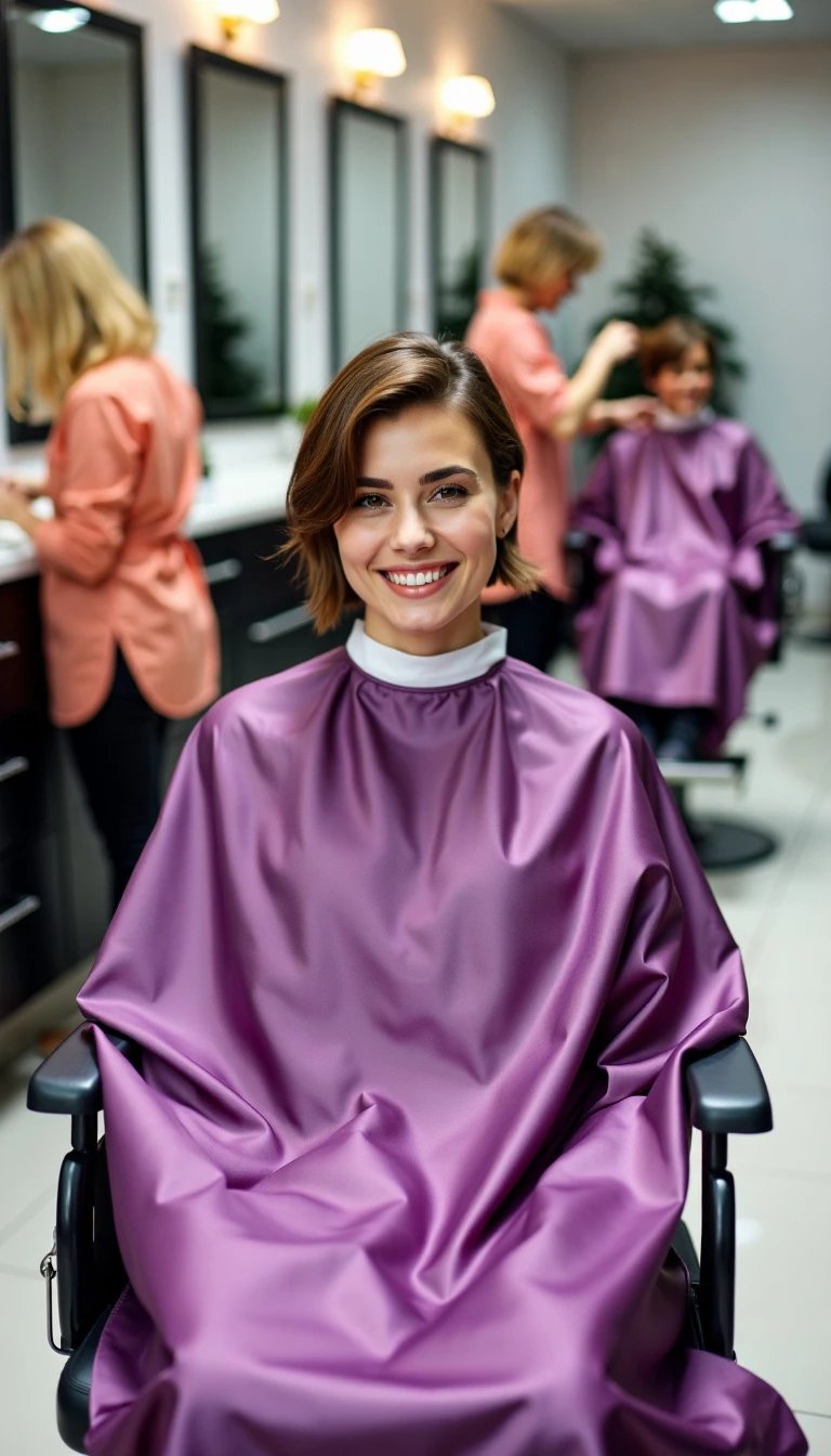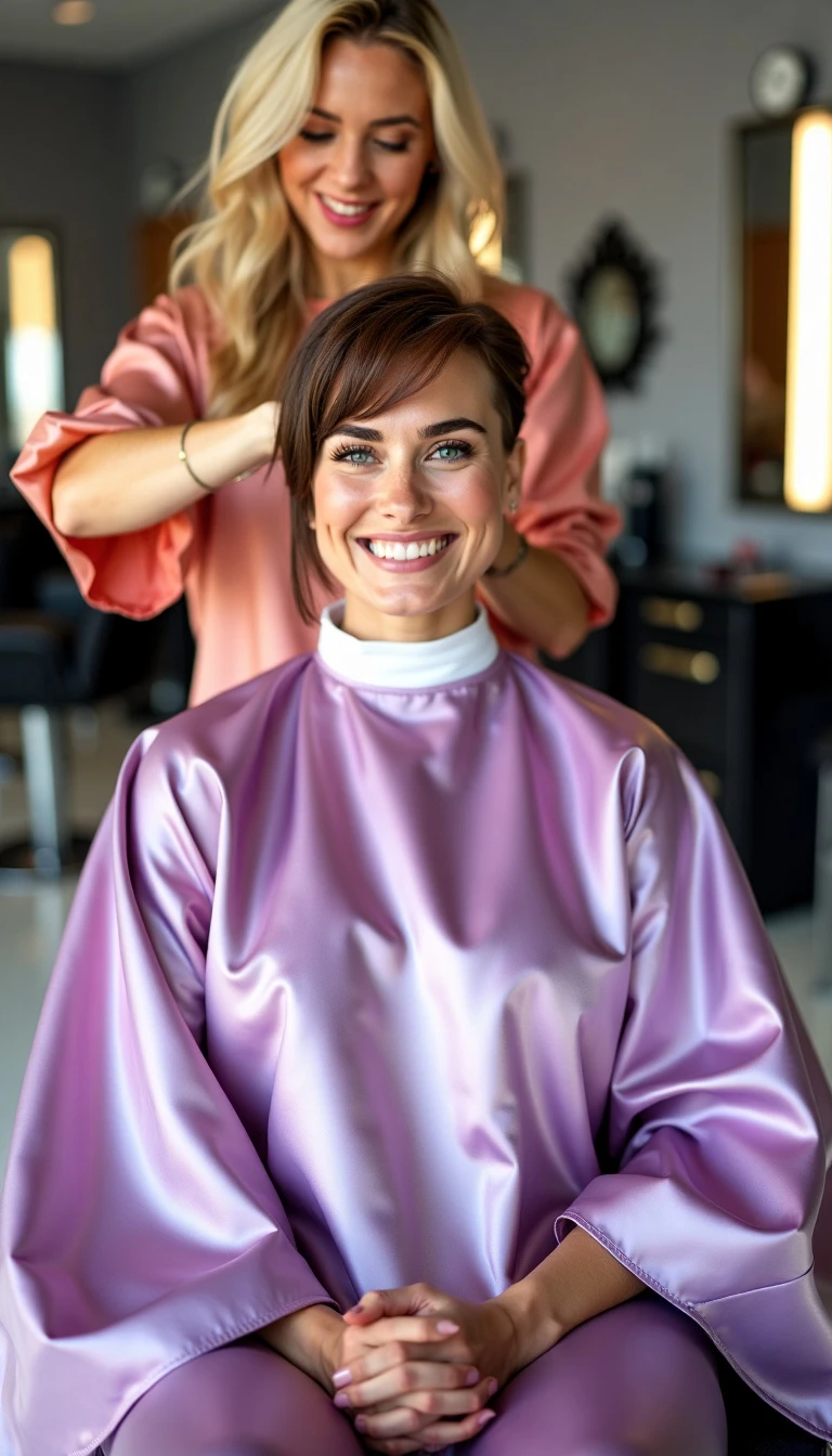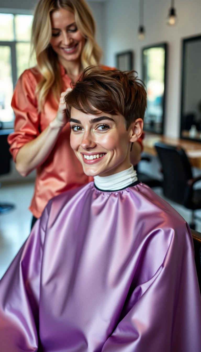 A cheerful woman n her 20's, brown hair, very very short haircut in a hairsalon, sitting in a barber chair. The floor of the salon is white. There are mirrors on the walls. The woman in the barber chair is wearing a very very long shimmering sunrise violet satin barber cape with a velcro closure. White neckstrip She is getting a haircut from a blonde female hairdresser in a short salmon shiny nylon barber smock. Cut off hair is lying on the cape. Front view