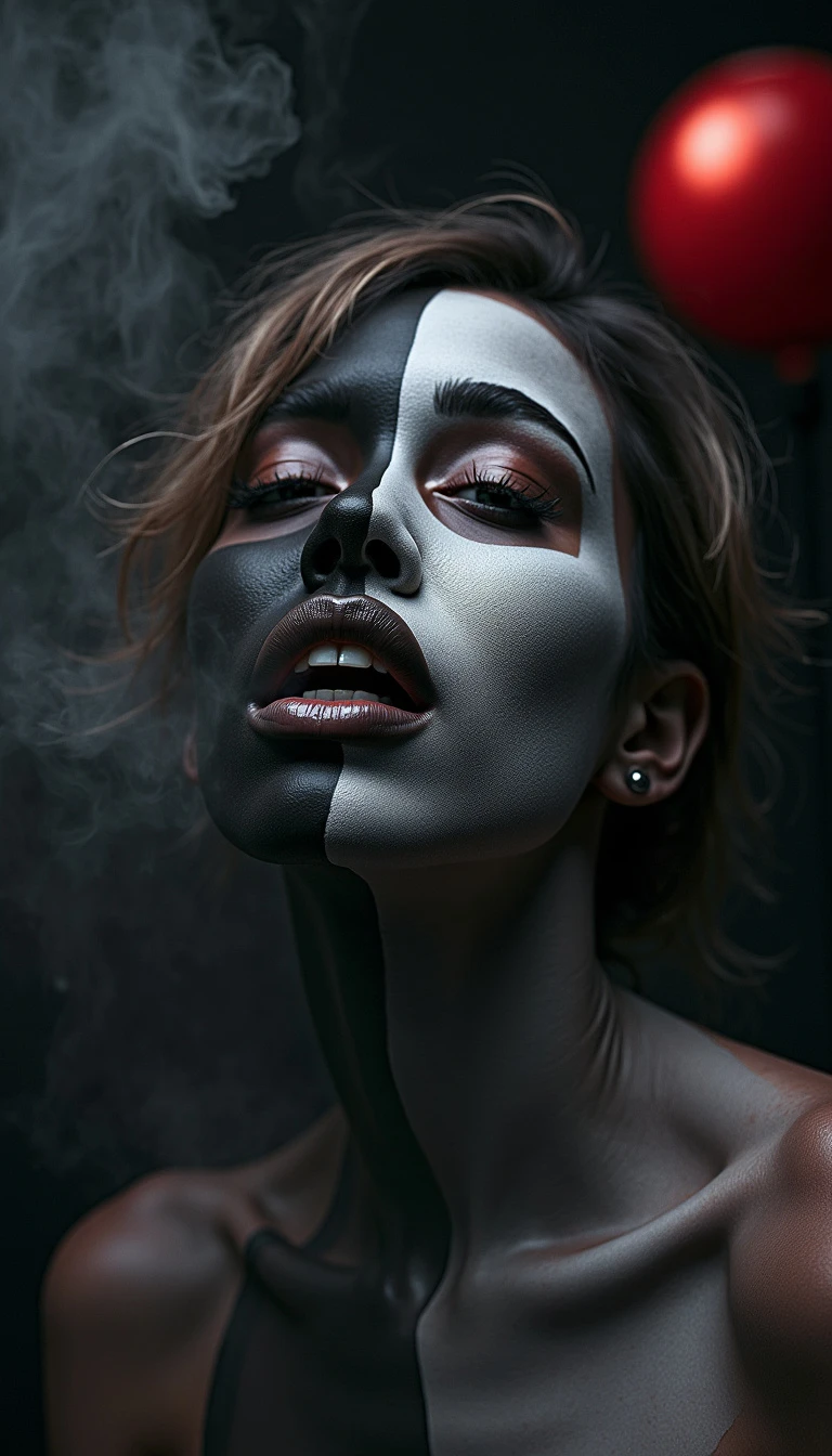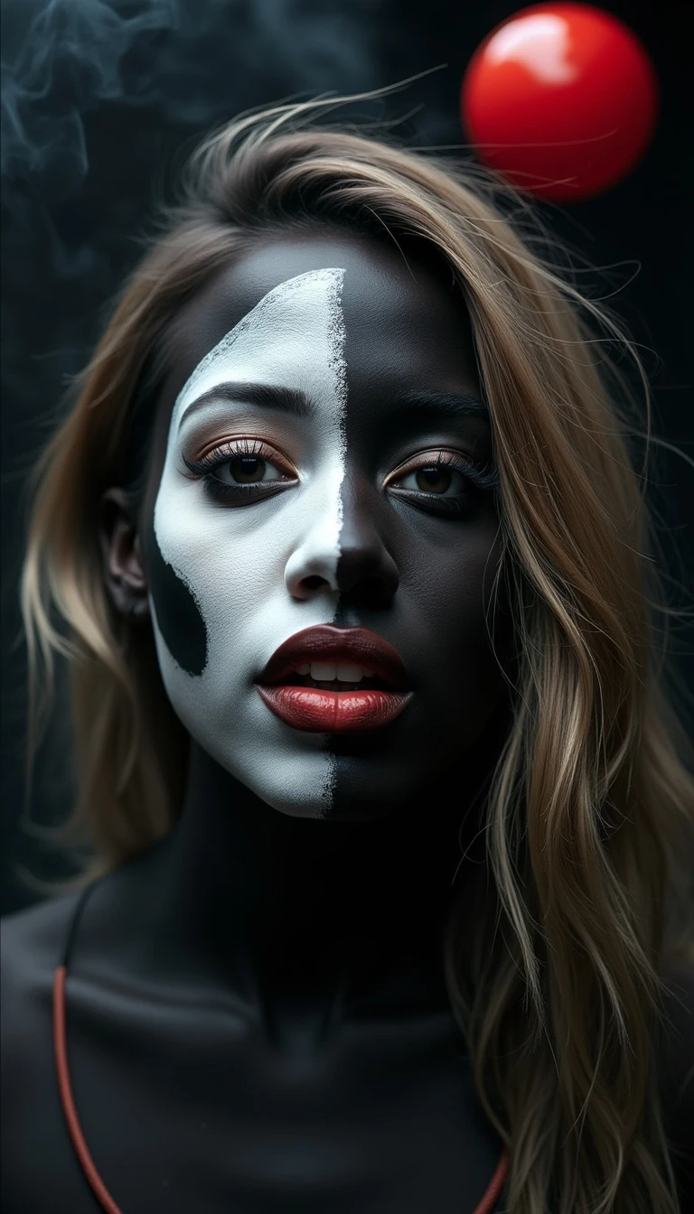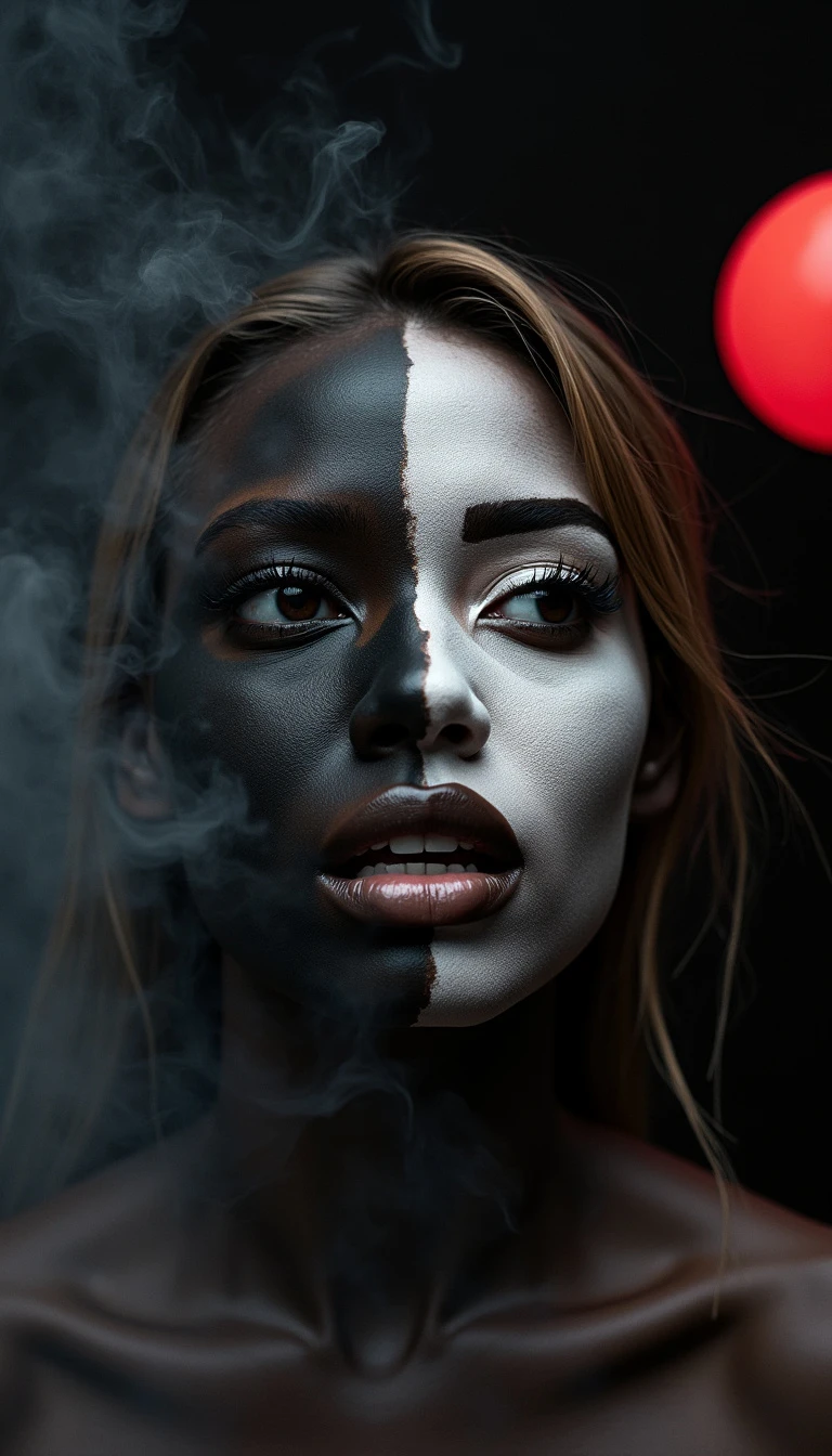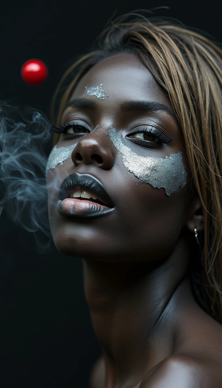 a dark-skinned woman with her face painted black and white is the focal point of this close-up shot. her eyes are wide open, and her mouth is slightly ajar, revealing a few teeth. her hair, a light brown, is parted on the right side of her face, and a few strands are visible on her left. her skin is dark and smooth, and she is shrouded in a cloud of smoke. the backdrop is a stark black, with a red orb floating in the upper right corner.