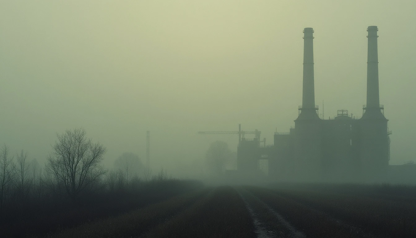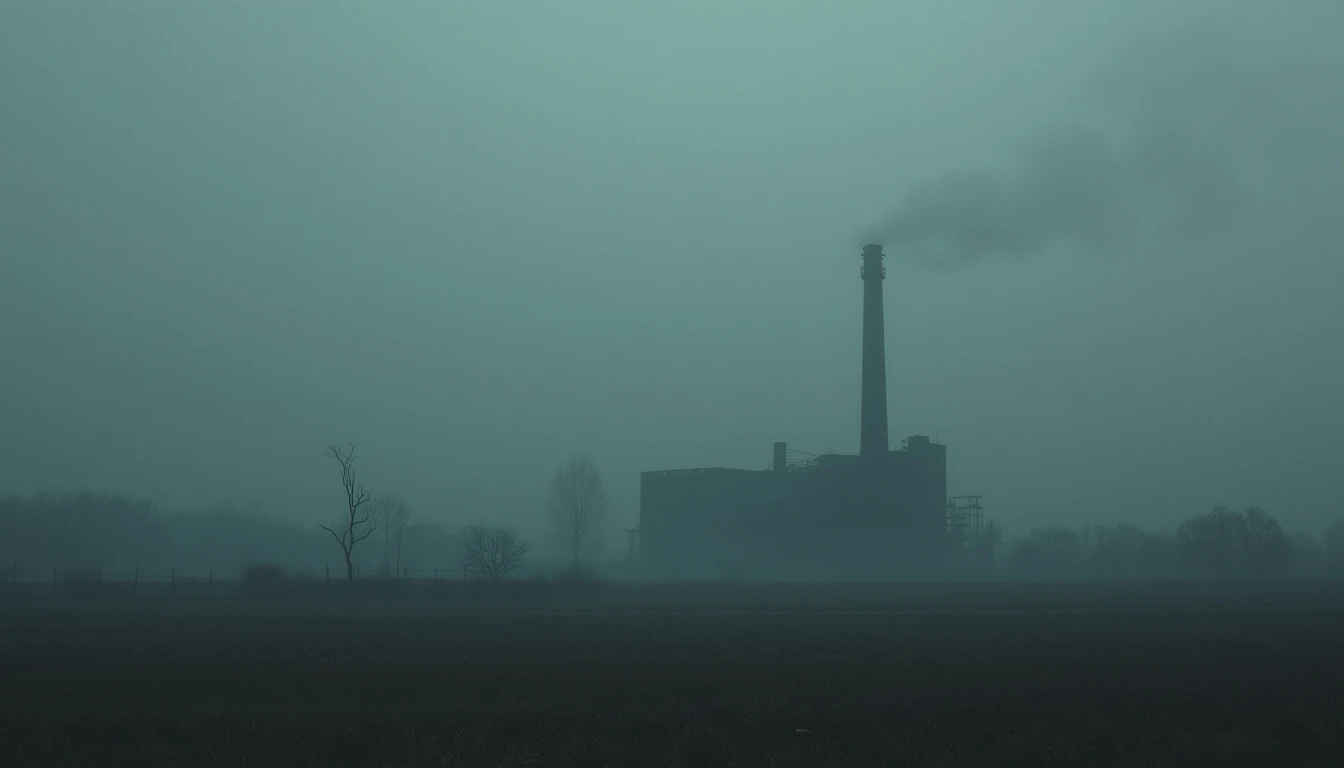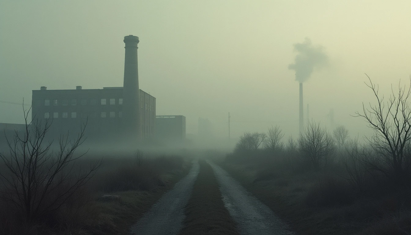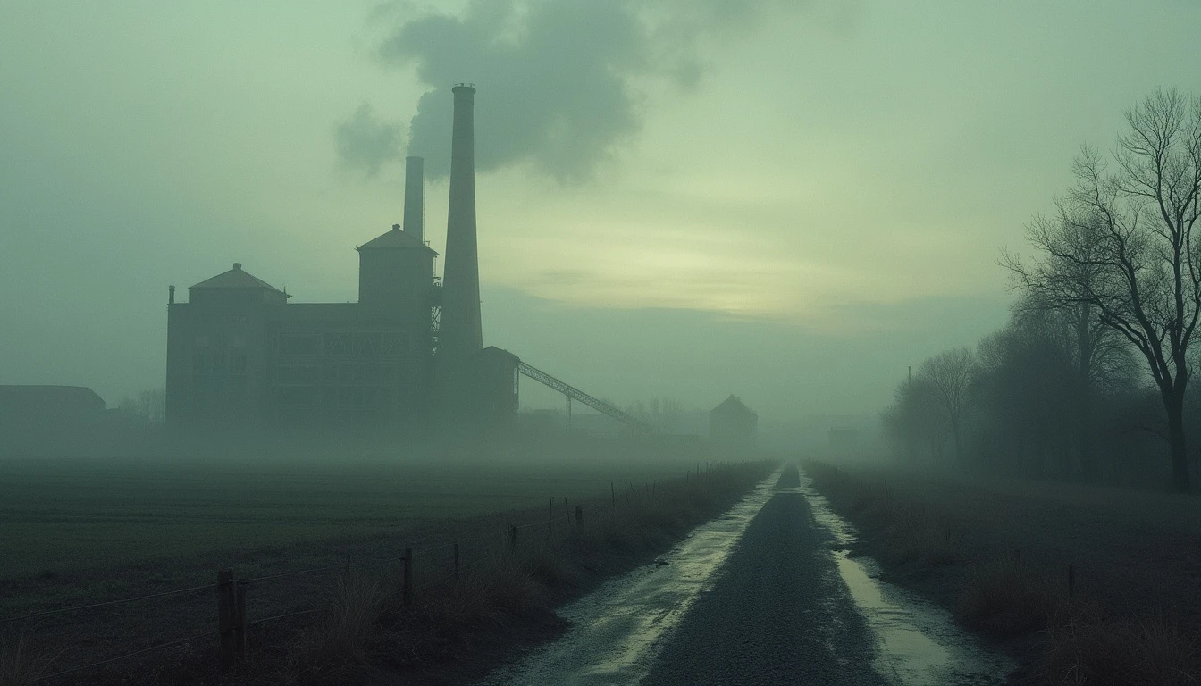 A hyper-realistic image A misty, grey scene of an old factory in the distance, silhouetted against the horizon, with memories of the past.