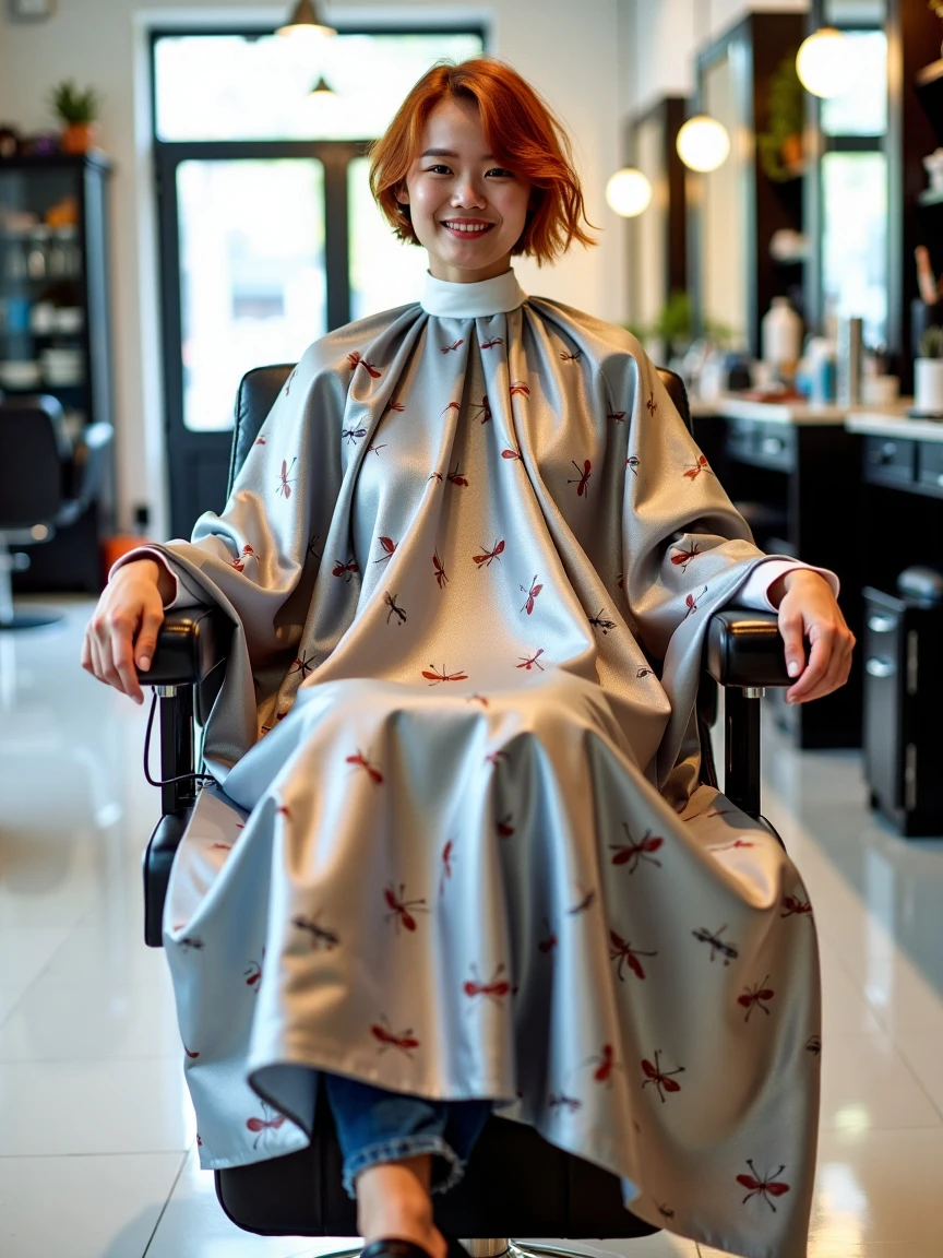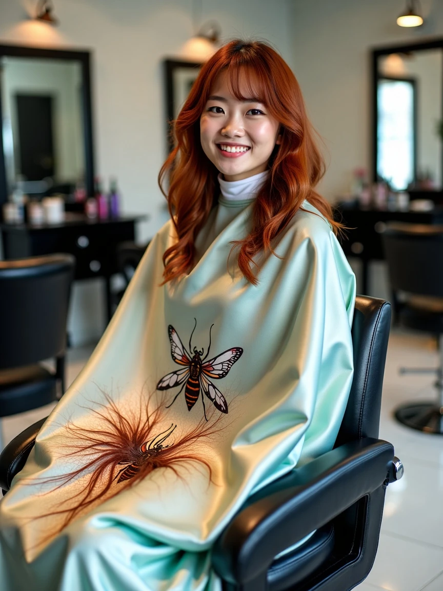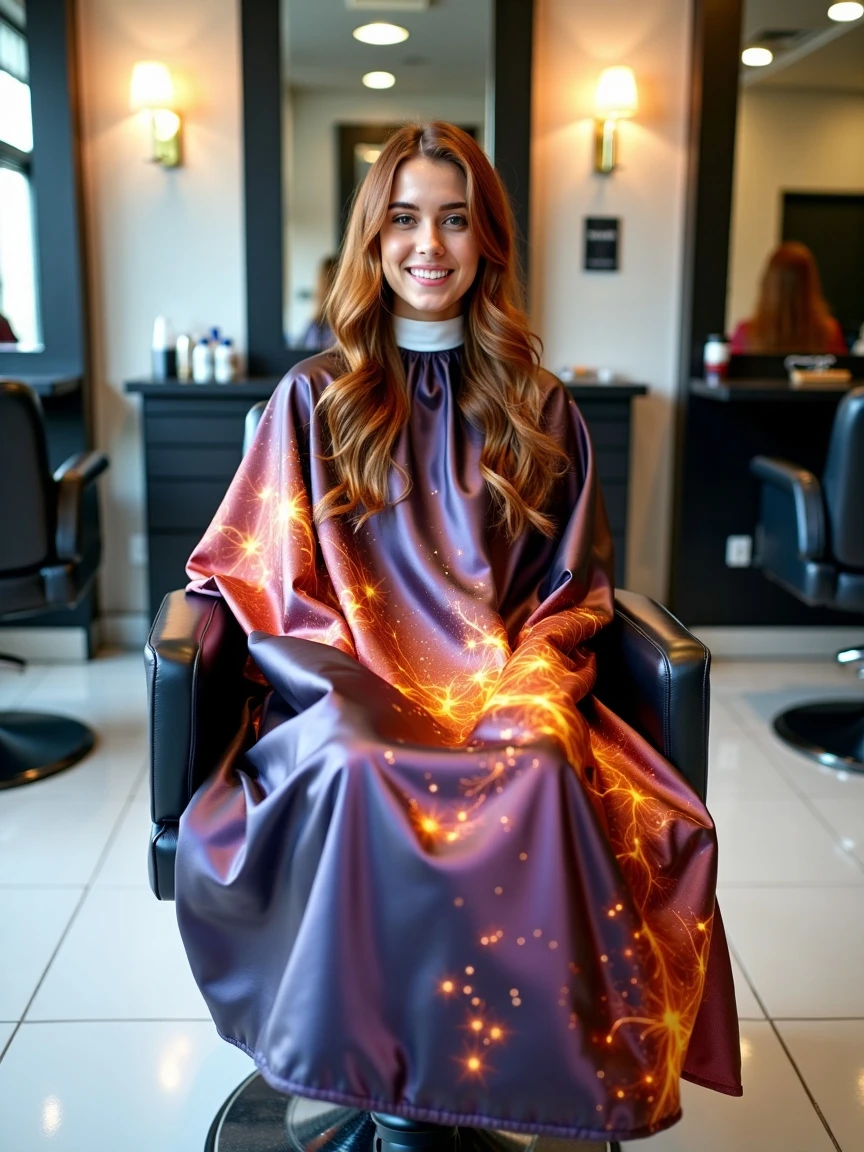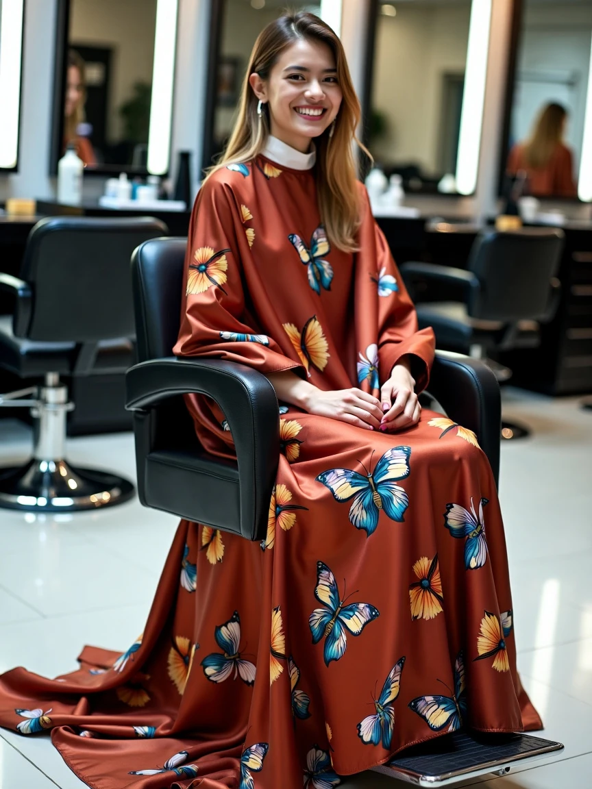 A cheerful 18 years old woman, random haircolor, random haircut, in a hairsalon, sitting in a barber chair. The floor of the salon is white. There are mirrors on the walls. The woman in the barber chair is wearing a very very long random color satin cape. Printed on the cape is a firefly pattern The cape Covers the woman and the chair completly. The cape covers also the armrests of the barber chair. Tide White neckstrip around her neck. Plenty of Cut off hair all over the cape