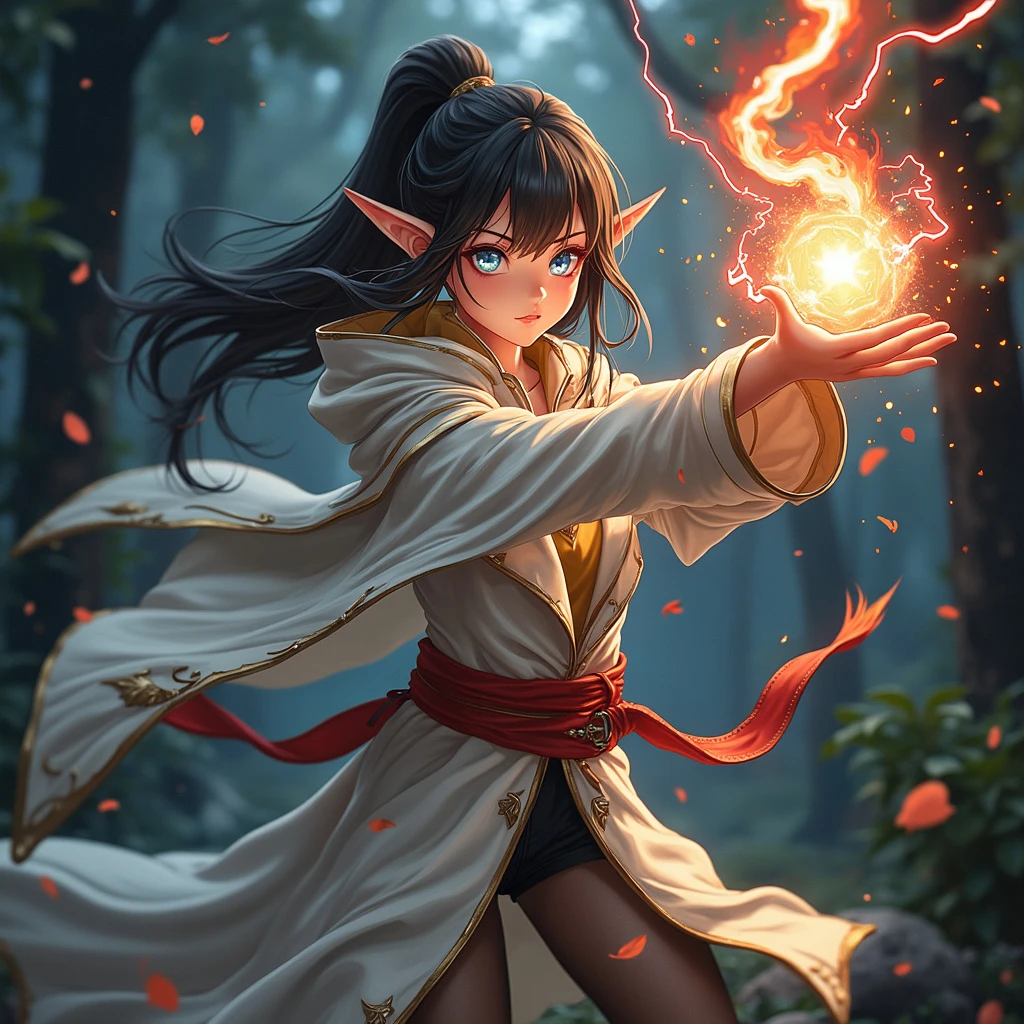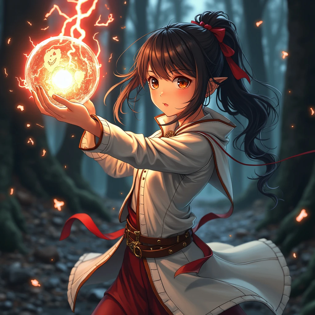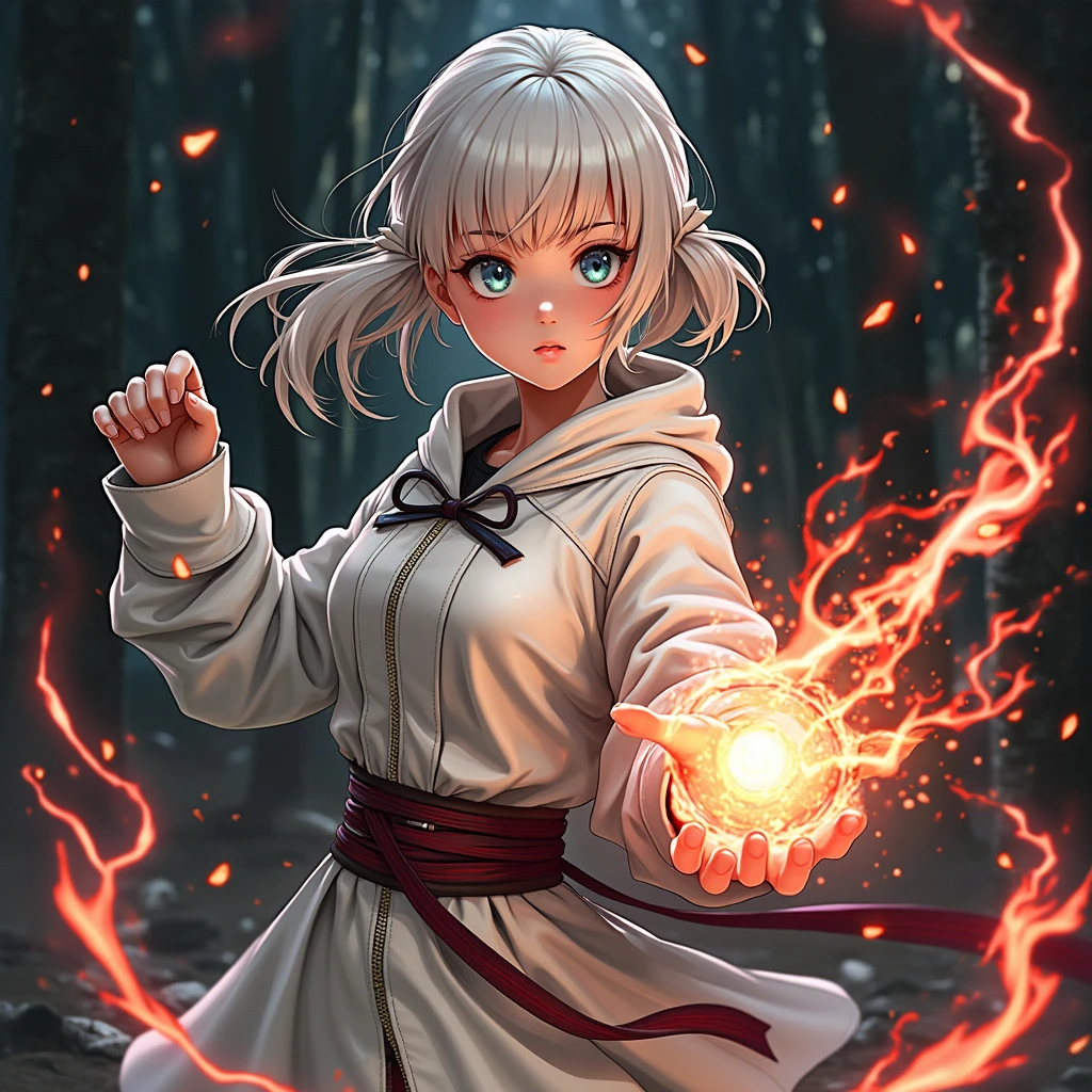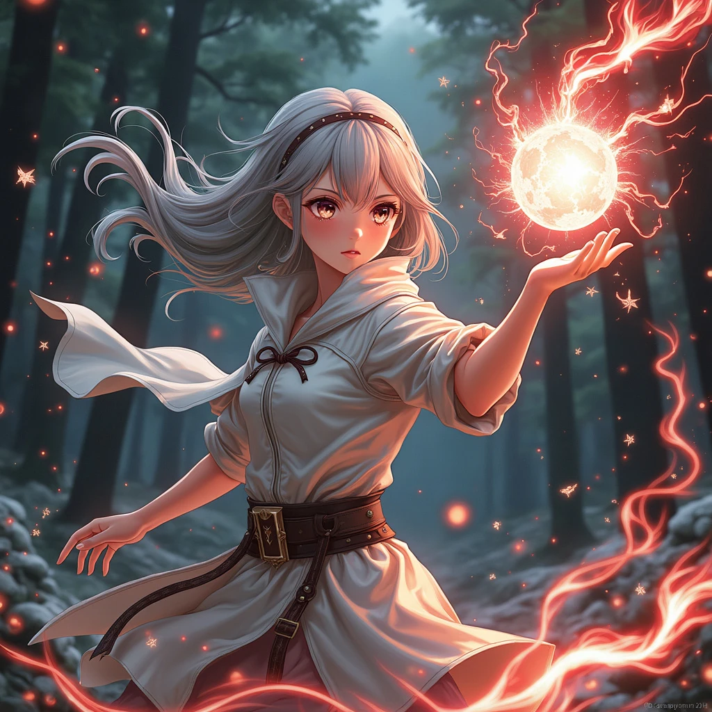 pro grainy photo, a beautiful girl, glass eyes, in a fighting stance, creates a magic ball, lightning, fractal swirling patterns, dressed in a white leather cloak with red fire lines, fragments of earth flying around, against a black forest background, Hyperrealistic, high resolution, photorealistic, clear focus, highly detailed