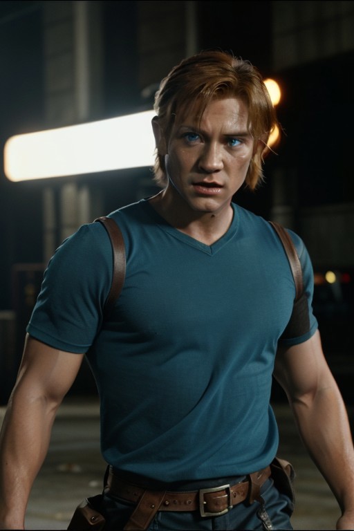 Link from the legend of Zelda as a 1980s Hollywood blockbuster action star. Cinematic lighting, beautiful scene. Ultrarealistic, highly detailed,4k, film still