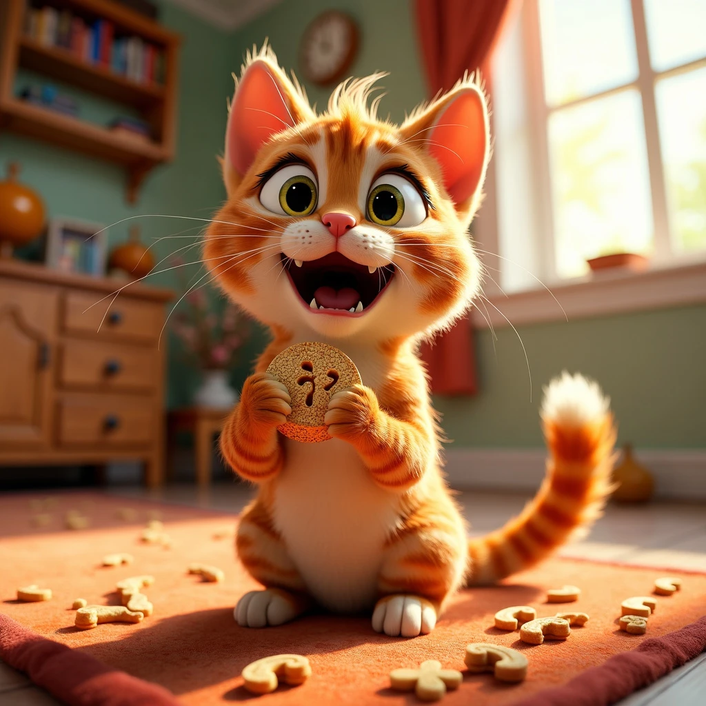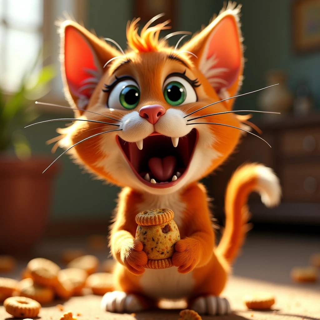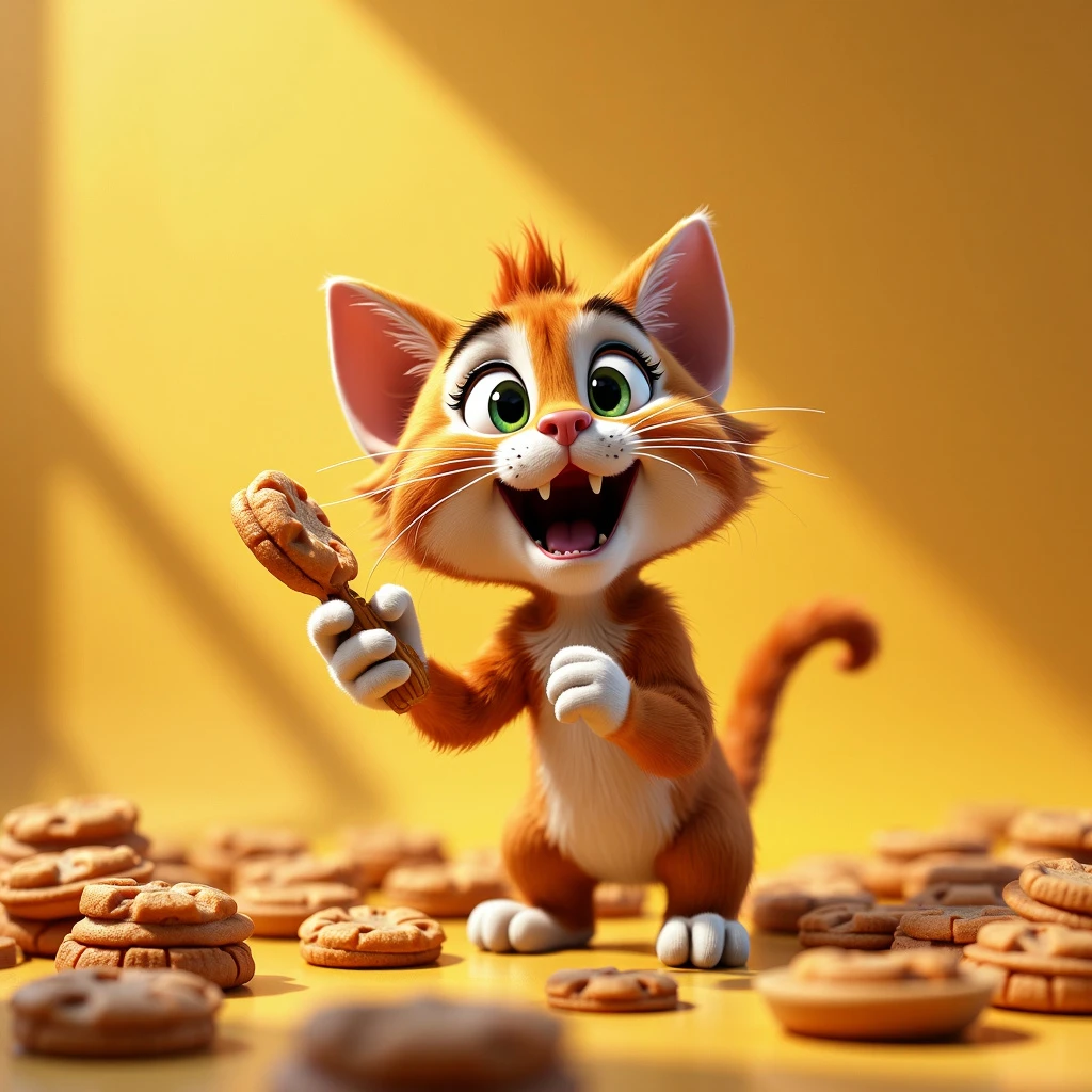 Disney Pixar 3D hungry cute adorable cat looking whit excitement at the treat, fisheye, wide angle, simple one color background