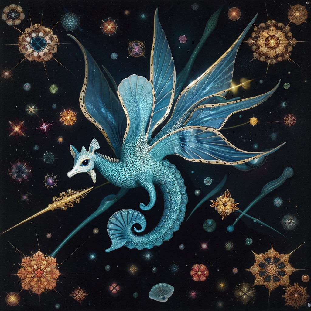 (masterpiece, top quality, best quality, official art, beautiful and aesthetic:1.2), neonpophaeckel, a seahorse and plankton, black background (no humans:2) <lora:Neon Pop Haeckel:1.0>