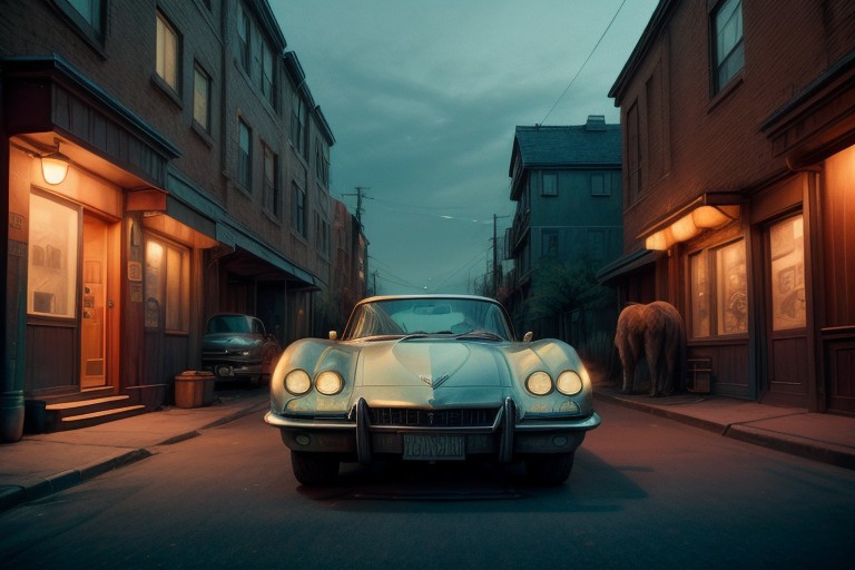 professional photography, Cinematic Film Still, Movie Still, Dented Vintage Big Block Corvette 1972 (chrome bumpers) Parked on a Quiet Street, color digital photograph, classic blue Pontiac LeMans, quaint old residential building, night scene, street parking, dimly lit windows, illuminated interiors, architectural details, vintage aesthetic, empty street, urban environment, parked vehicle, nostalgic mood, clear sky, residential area. front and right view, the paint of car is not perfect, there is sign "Honda Parking", black masked apartment burglar under window, in the background there is a dog, there is a text "Buzz" under the rear tires, oil leak under car, (extremely detailed), 35mm, film grain, photographed on a Canon AE-1, grainy,