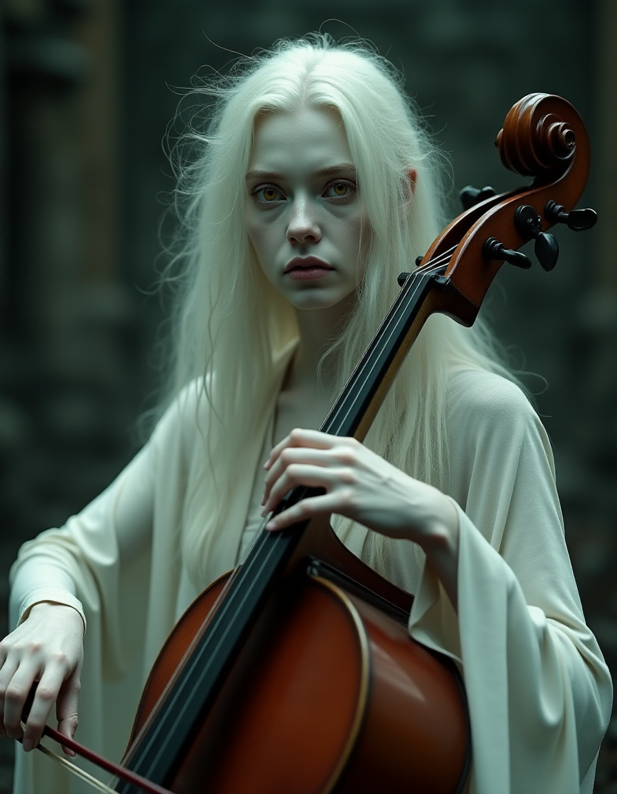 In a dark medieval fantasy setting, a divine woman creature with snow-white marble skin and yellow eyes plays a cello in an ultra-realistic, retro 1980s cinematic style. She is a 30-year-old with long, messy white hair and wears flowing, long white clothes. The scene has a vintage, classic 90s feel, reminiscent of a blurry polaroid shot. Her serious expression contrasts with the ethereal quality of the moment, creating a striking and immersive image.